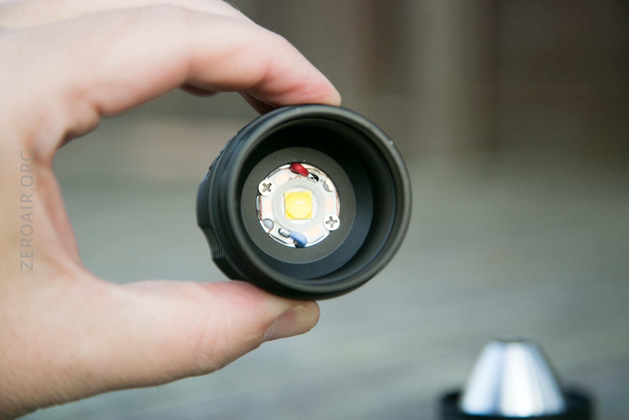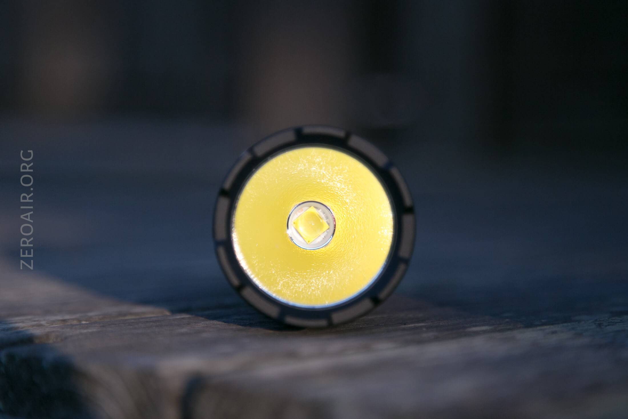 The emitter is a Cree XHP70.2, and in my case, the temperature is 5000K. The reflector is quite deep, solid aluminum, and lightly orange peeled. There’s a white centering ring, too.