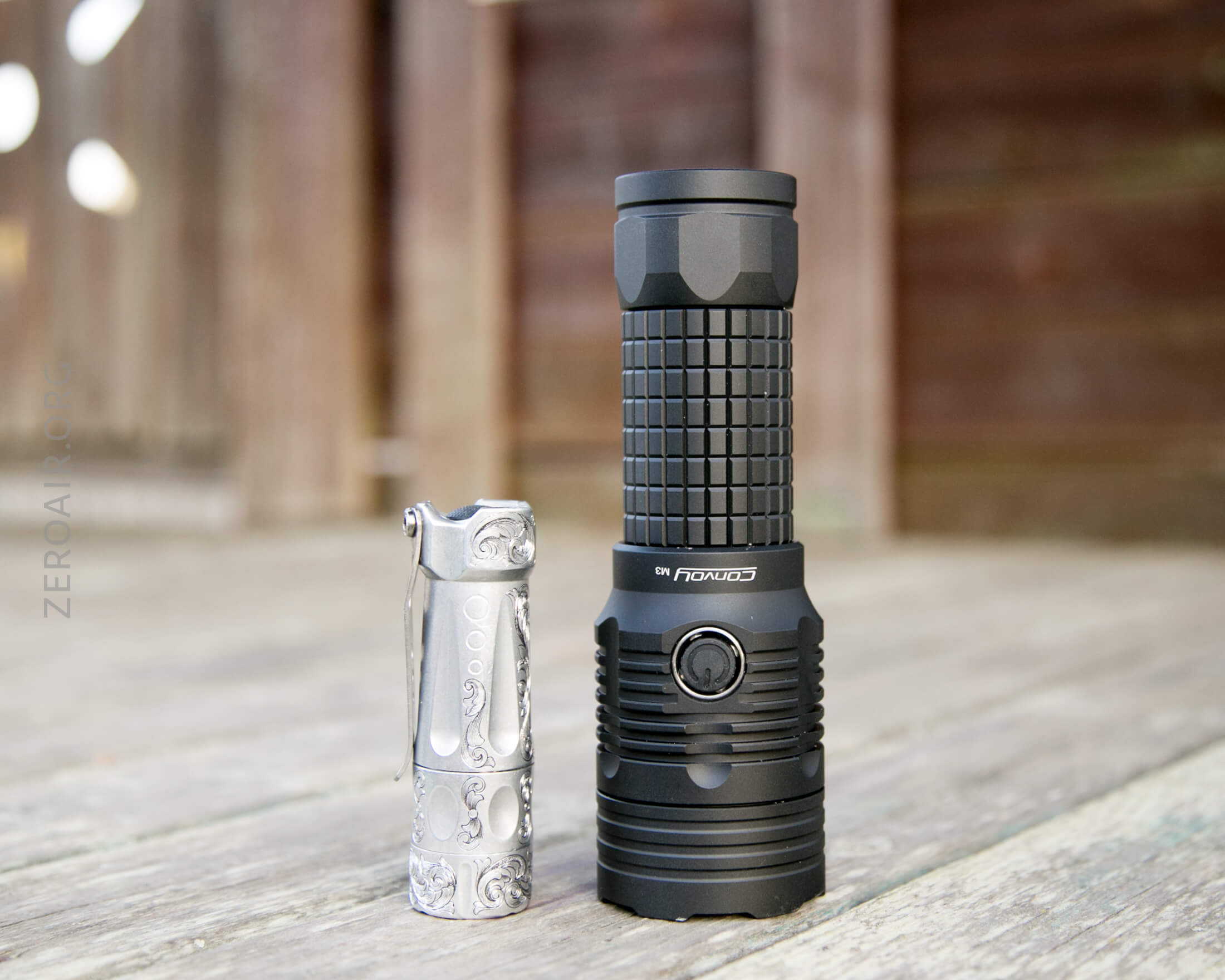 And here’s the light beside my custom-engraved TorchLAB BOSS 35, an 18350 light. I reviewed the aluminum version of that light in both 35 and 70 formats.