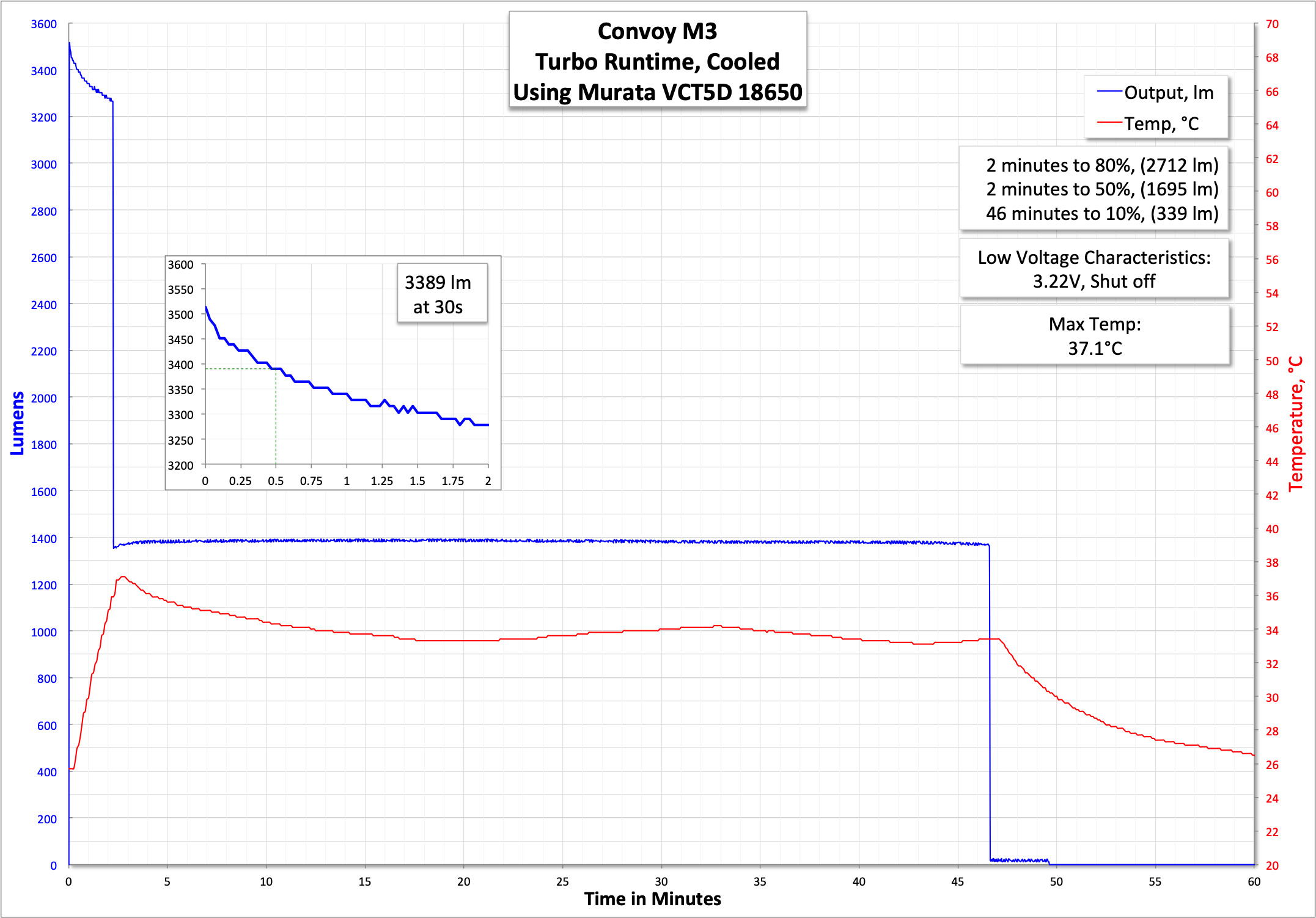 Here’s a runtime on Turbo. There’s a stepdown to approximately High after just over 2 minutes. The M3 claims to be temperature-controlled, so that could be a temperature-triggered stepdown, even though I’m seeing only 37°C or so on the external. Output at 30s of 3450 lumens is well short (80%) of the claimed 4300 lumens. Even at 0s, the output is only around 3500 lumens, which is well short of the claim. Still, 3500 lumens isn’t a bad output.