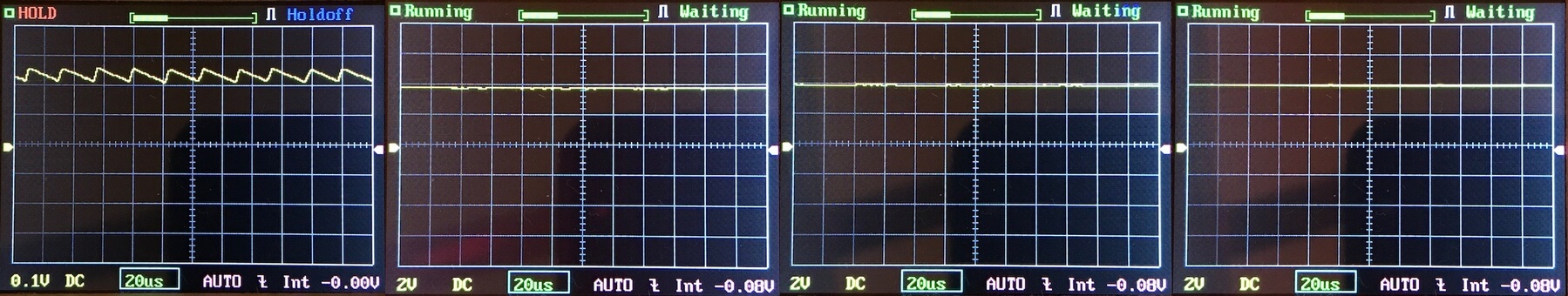 Then there’s the Ultrafire WF-602C flashlight, which has some of the worst PWM I’ve seen. It’s so bad that I used a post about it to explain PWM! Here are multiple timescales (10ms, 5ms, 2ms, 1ms, 0.5ms, 0.2ms) to make comparing this “worst” PWM light to the test light easier. That post also explains why I didn’t test the WF-602C at the usual 50us scale.
