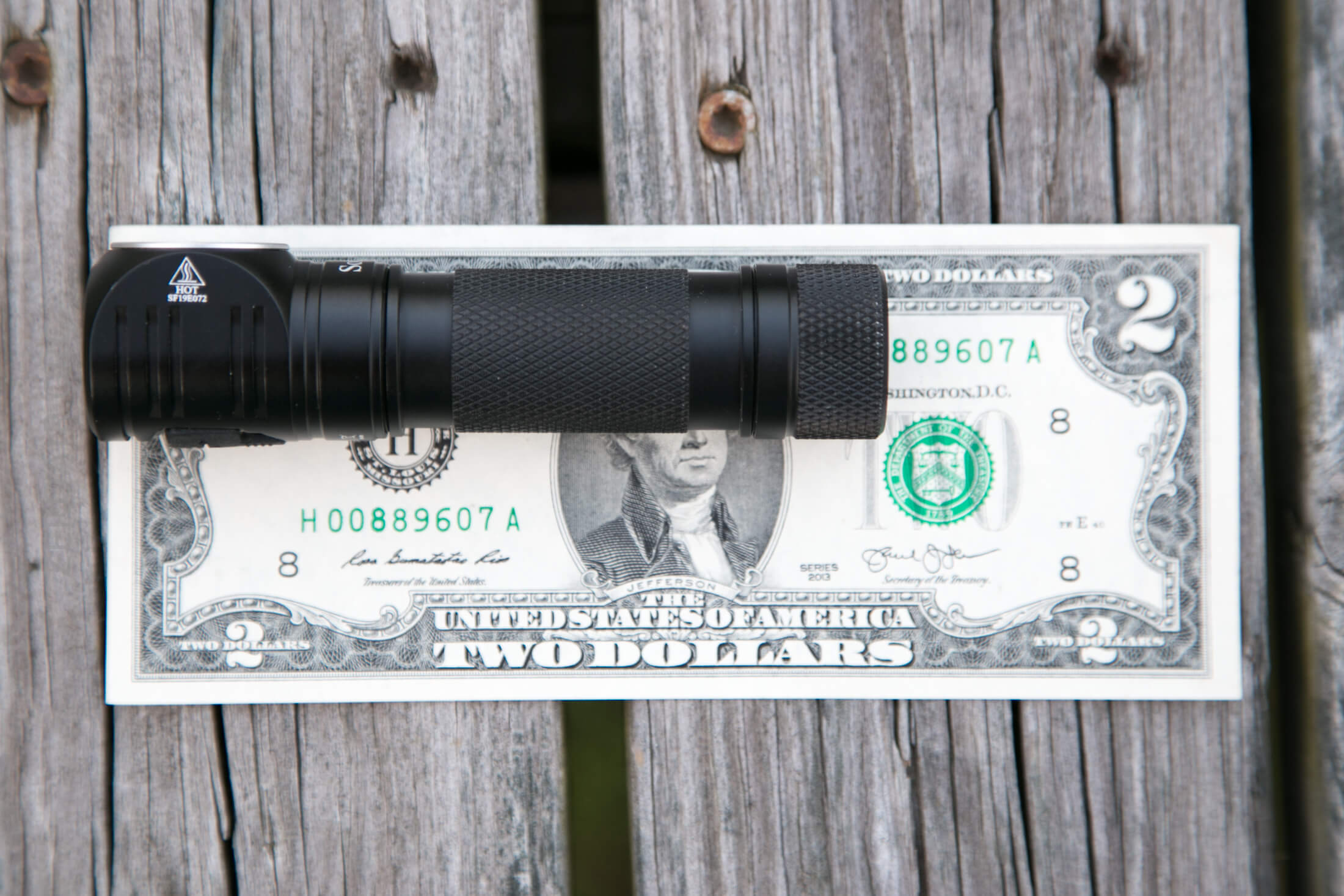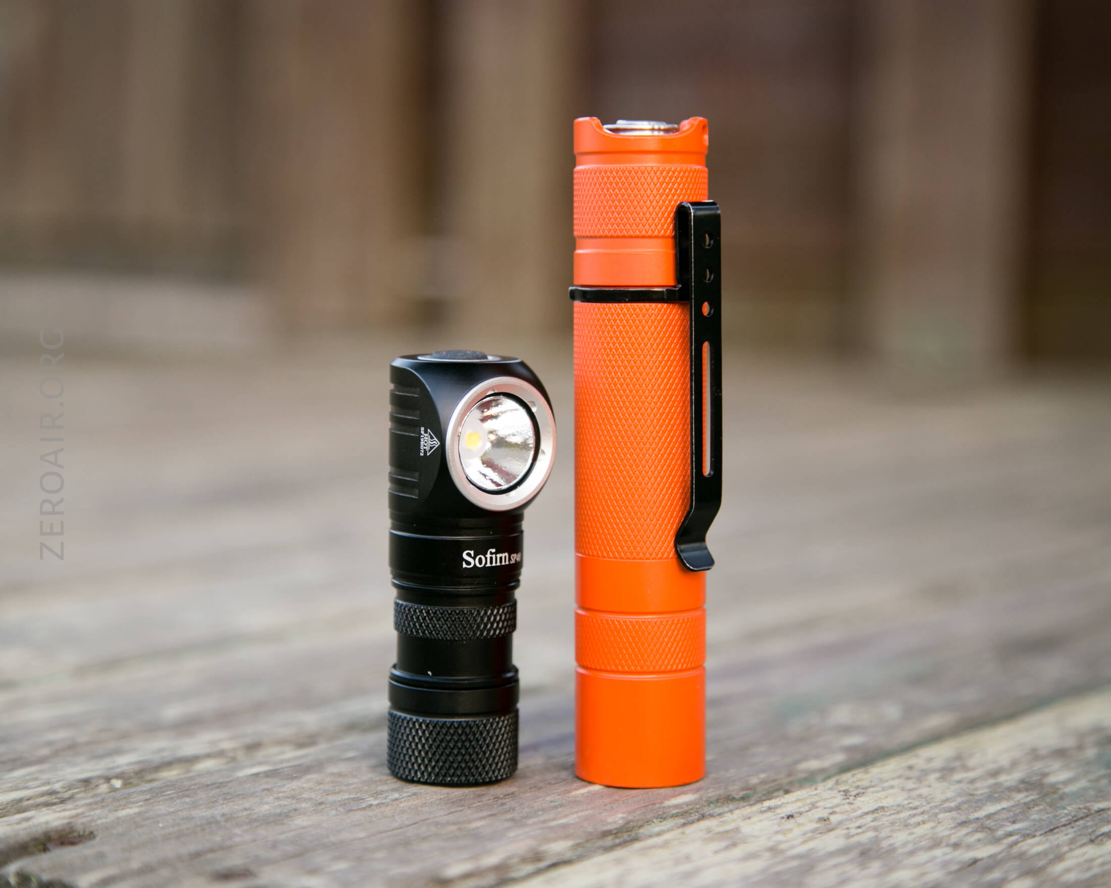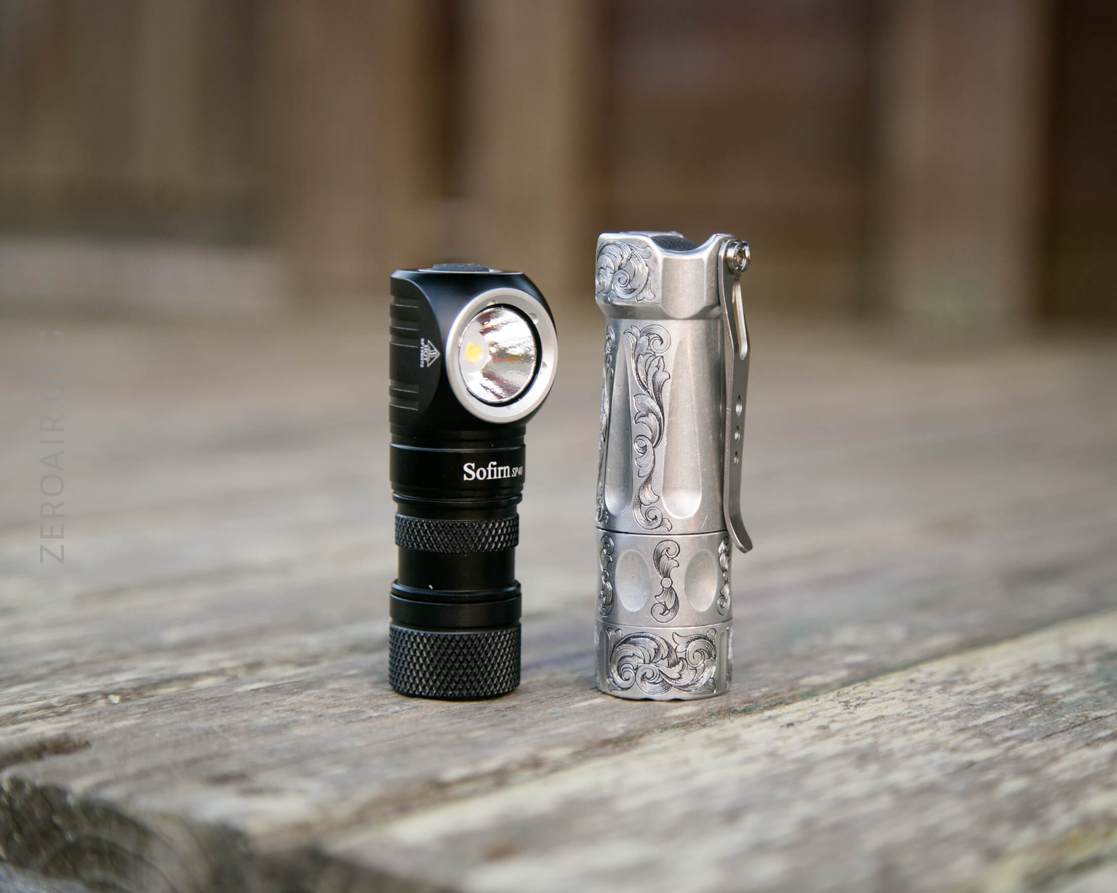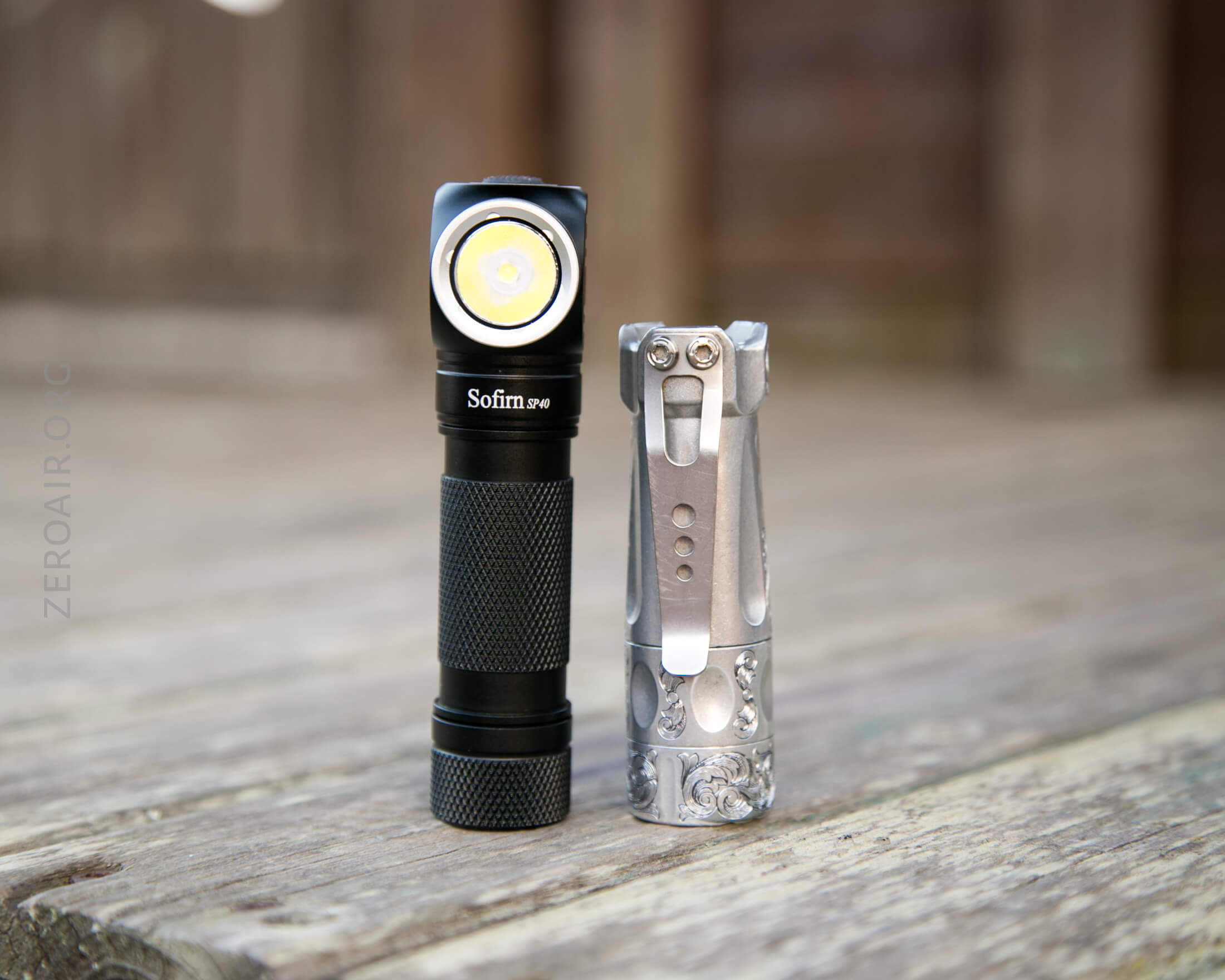 And here’s the light beside my custom-engraved TorchLAB BOSS 35, an 18350 light. I reviewed the aluminum version of that light in both 35 and 70 formats.