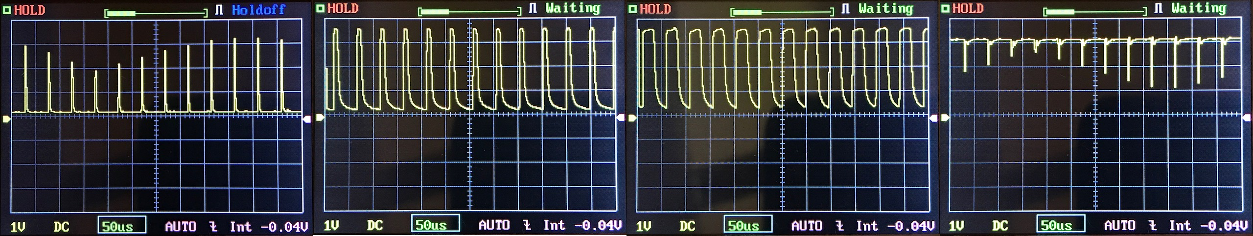 Then there’s the Ultrafire WF-602C flashlight, which has some of the worst PWM I’ve seen. It’s so bad that I used a post about it to explain PWM! Here are multiple timescales (10ms, 5ms, 2ms, 1ms, 0.5ms, 0.2ms) to make comparing this “worst” PWM light to the test light easier. That post also explains why I didn’t test the WF-602C at the usual 50us scale.