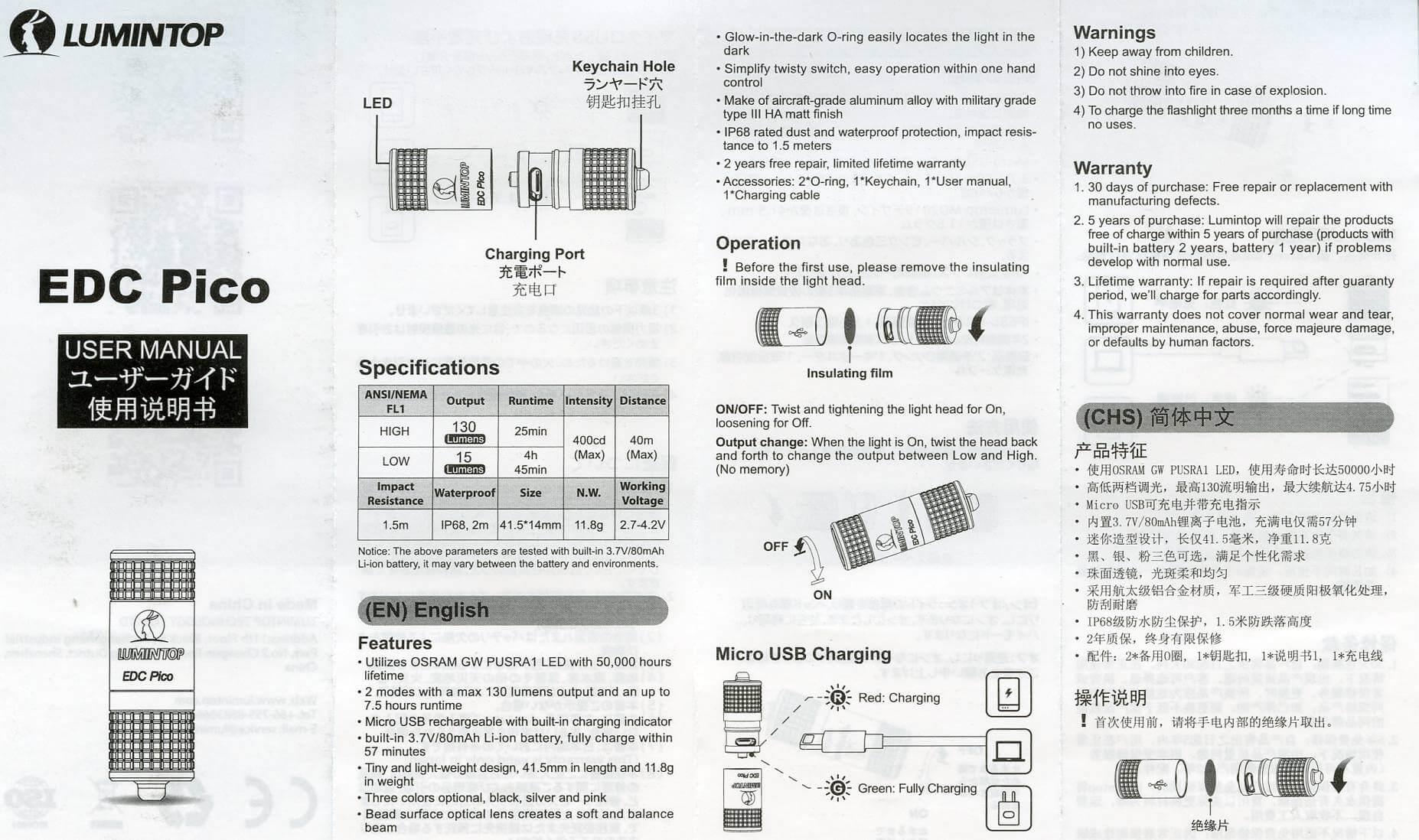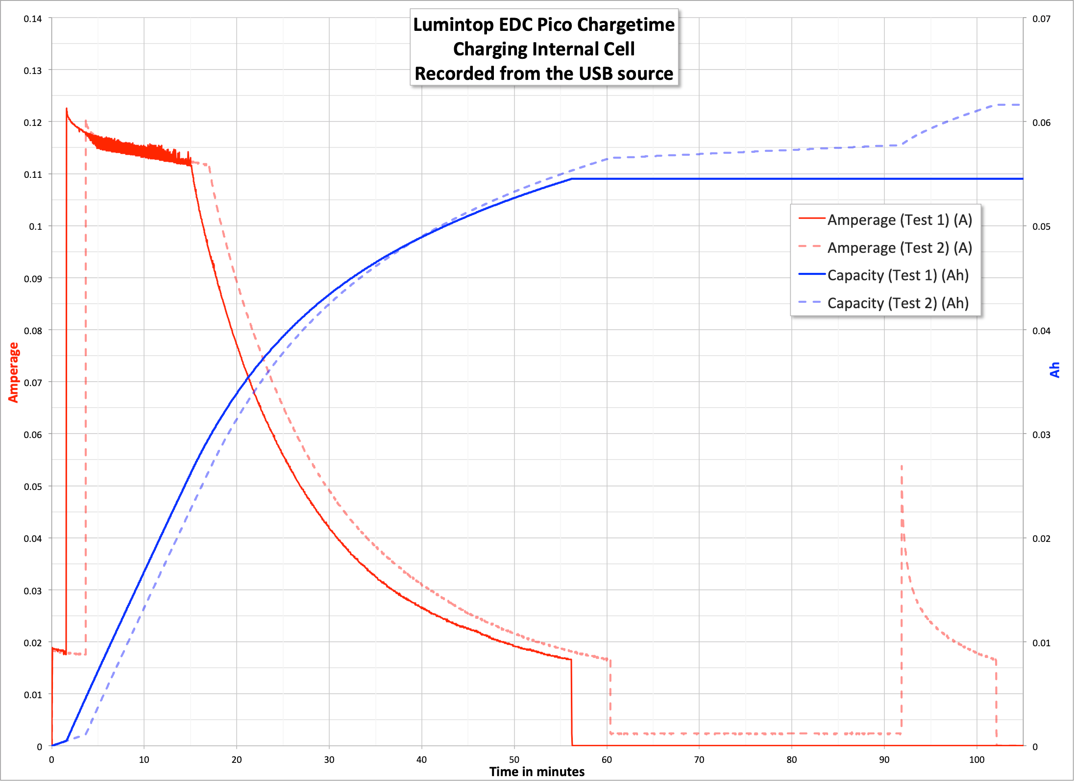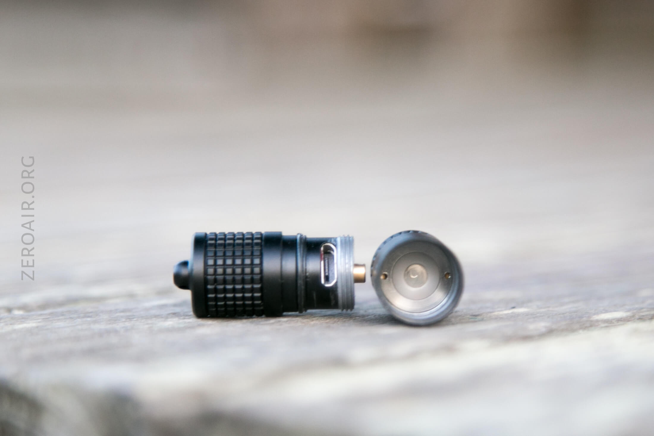 Power comes to the EDC Pico by an internal and built-in cell. The cell is not replaceable, and is charged via micro-USB. The claim is that the internal cell is an 80mAh 10180.