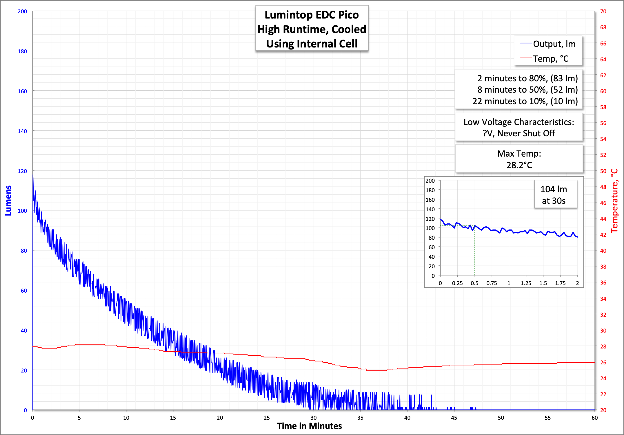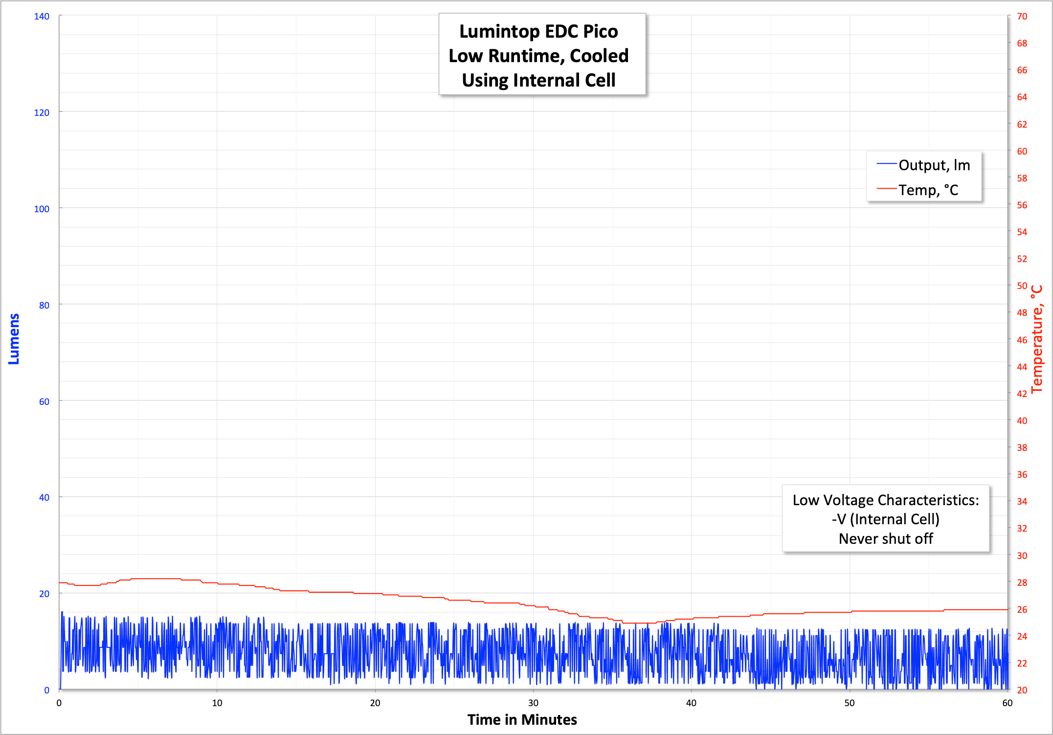 I performed a runtime test for both modes. Don’t read much into the squiggly lines – my lux meter just doesn’t like these low modes…. The runtime is unremarkable. Output is unregulated, and drops to almost nothing within 40 minutes. There does not appear to be low voltage protection.