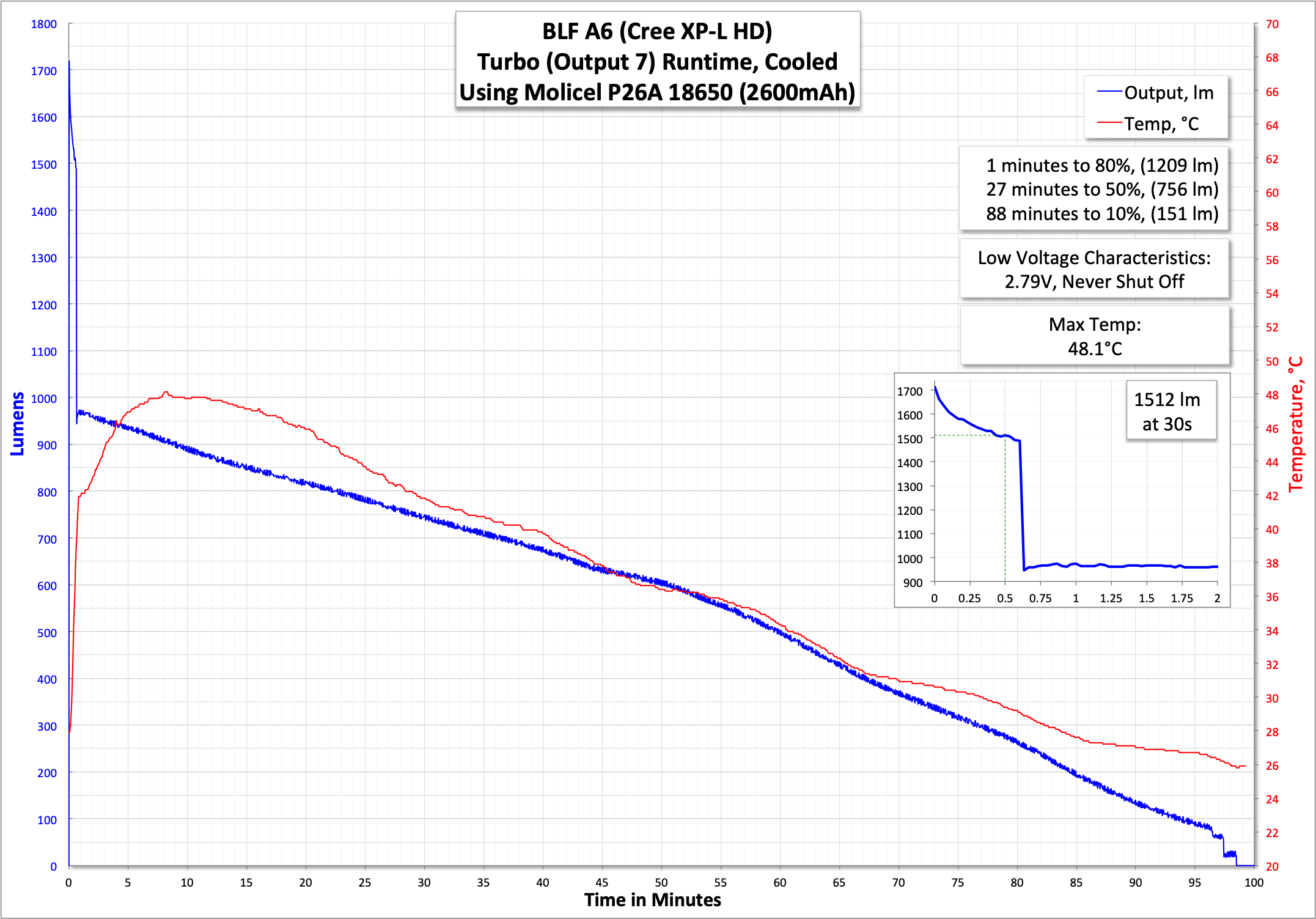I tested the light with two different, capable cells. First, turbo with a Molicel P26A, which should easily provide the current needed for Turbo. BangGood states: