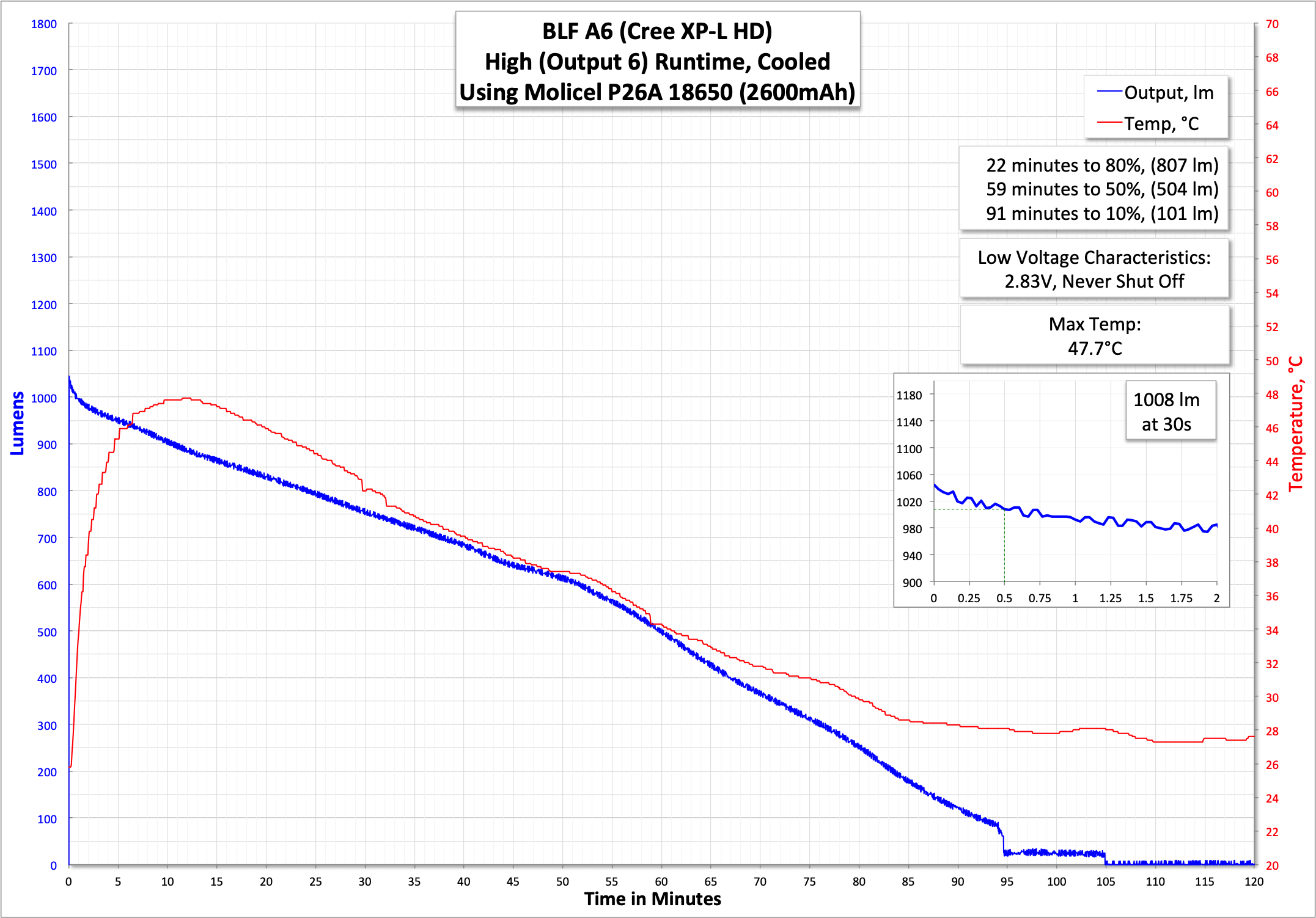 The light has LVP. On bench power, the light shuts off electronically at 2.6V or so, but in the test, the output is very low some time before 2.6V.
