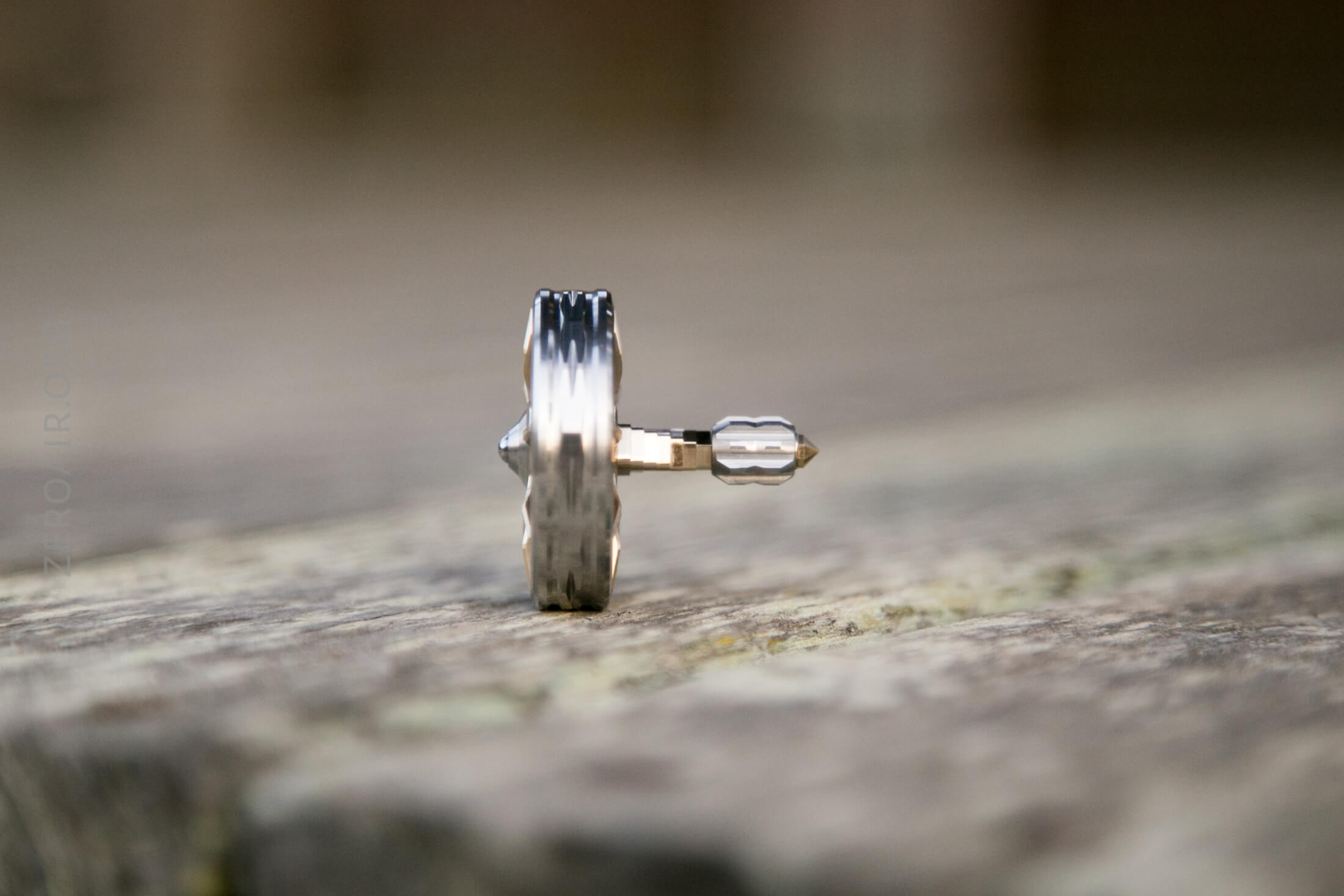 This top is near to the Stainless Steel / Bronze / Stainless Steel / Bronze Xeno – my specific top isn’t even listed on their site. There are a bunch of options! However, that name is specific to the parts here, and in order. First, the biggest ring is Stainless. Then the “facehugger” part is bronze. Then a stainless steel shaft, and finally a bronze grip. (The name of my top would be “SS/Bronze/Bronze/SS” since that’s the order of my parts.)