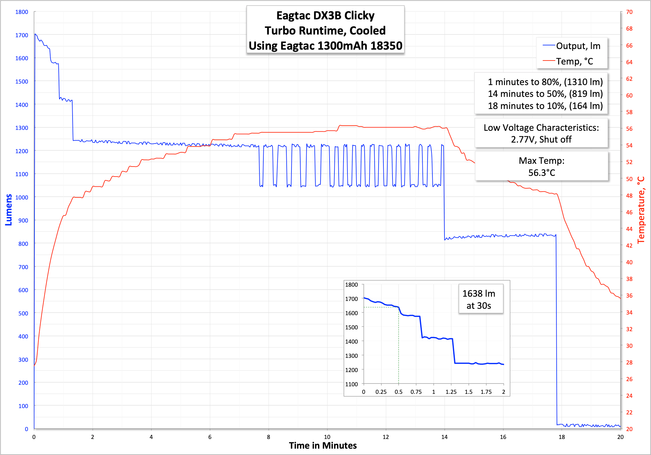 Using the provided cell, I achieved the following results. First Turbo. The runtime is…. quite short – under 18 minutes after a reasonable stepdown (likely, hopefully temperature-based). The light shuts off with LVP and a cell voltage of 2.77V, which is good, proper LVP. The runtime does match the specification, though, so this is nothing to complain about.