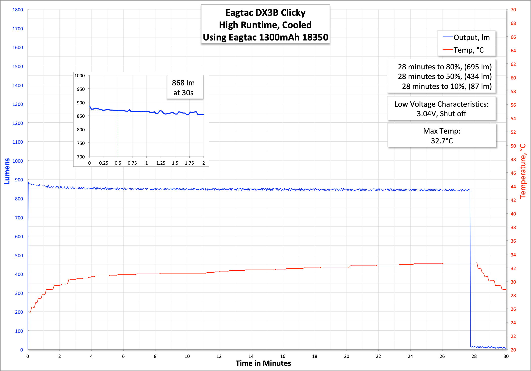 High of around 900 lumens (claimed 905) is pleasantly flat for the duration, and while I show a cutoff of 3.04V, it’s likely lower (it was only checked after a bit of bounceback). The claim for this mode is “0.55h” so practically close enough to meeting spec here, too.