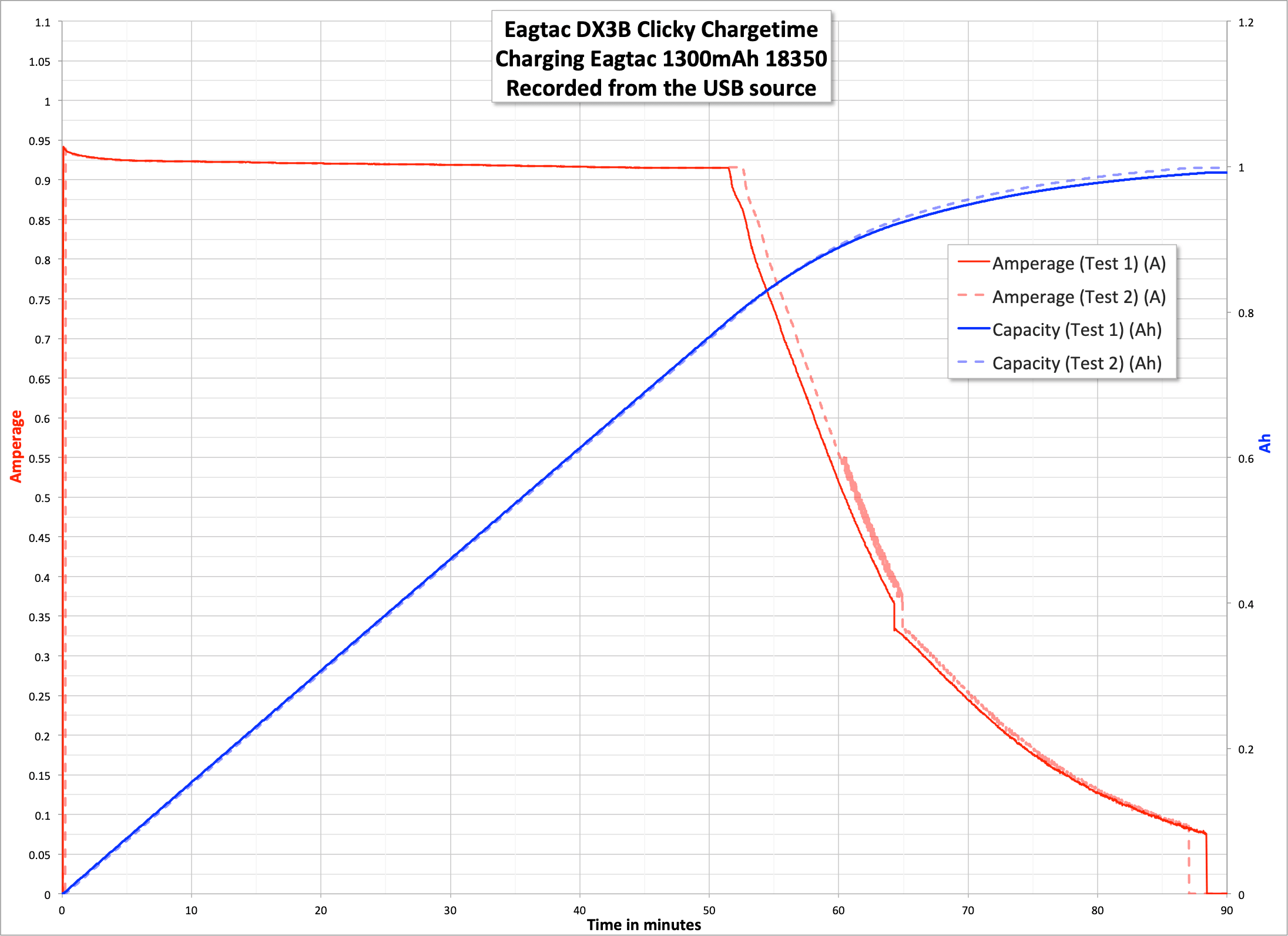 Charging is very good, at 1A. Also very consistent, which is another great bonus. This charge rate would be good even if the light was a 18650 light (and while I haven’t looked yet to see if there is a 18650 version, knowing Eagtac, there is. I’d expect it to be called the DX6B, and it looks like [/me searches] that there isn’t one past the extension tube offered for one of the DX3B models.) The charge test below is only a display of how the charge circuit works; it’s not a test of the actual capacity of the cell. There are number of things that can make the cell capacity different from what is shown below, besides the fact I’m logging at the USB source. I’ll call the cell a 1000-1100mAh cell and I’d be satisfied with it at that capacity. It’s not impossible that Eagtac branded these when Efest was still labeling their 18350 cells as 1300mAh, so I can’t really fault too badly them for the mislabel. But I hope future versions will have an accurate specification.
