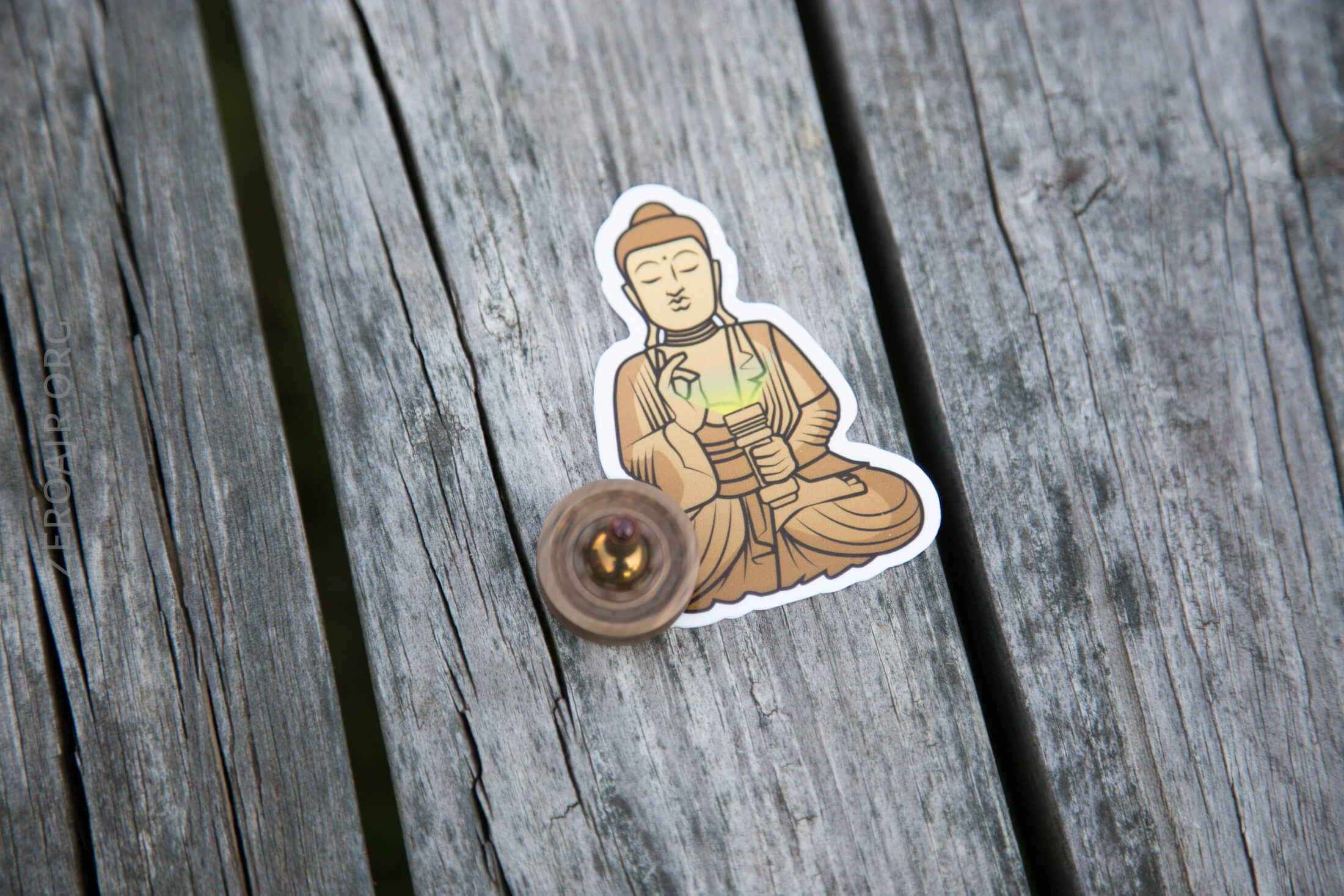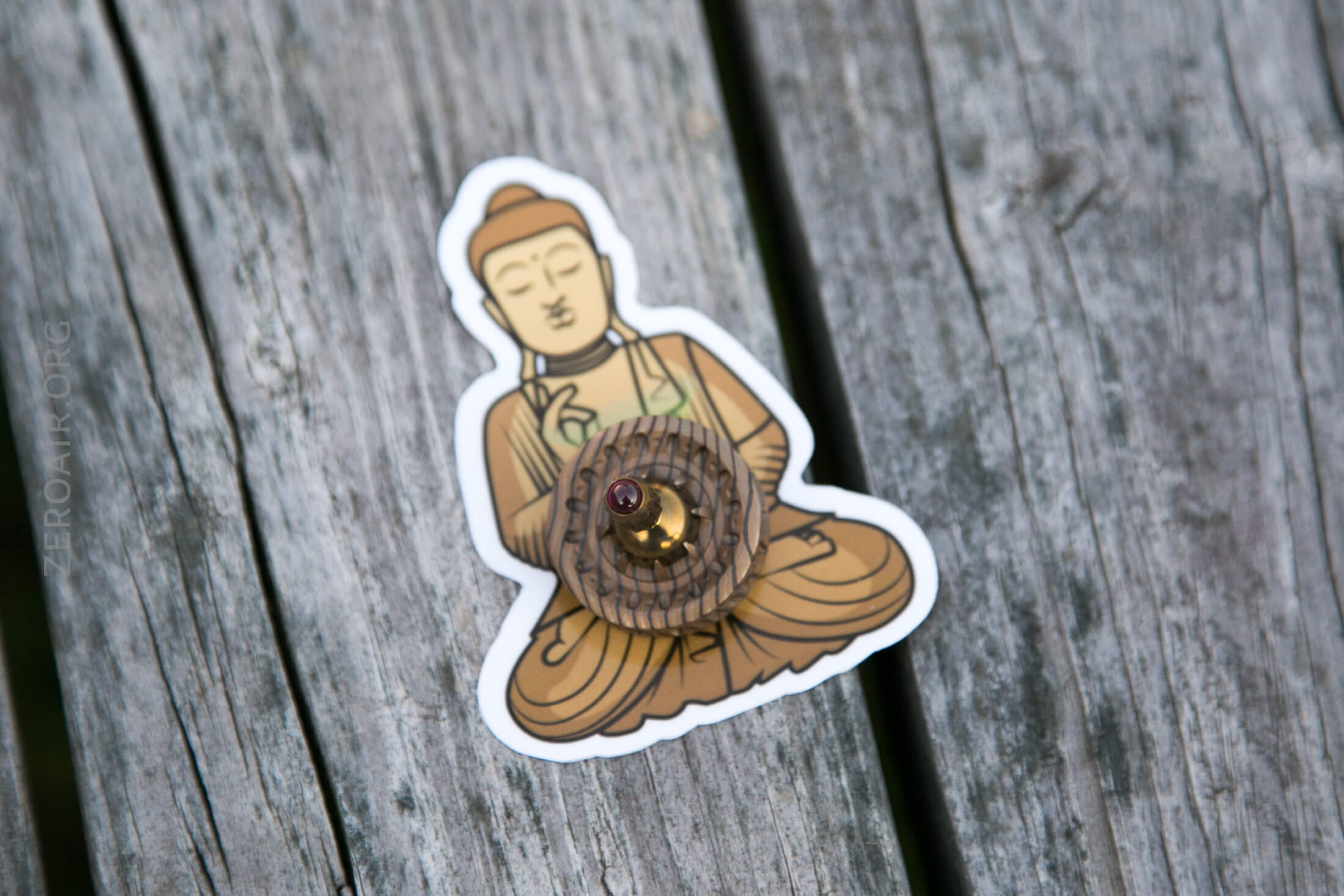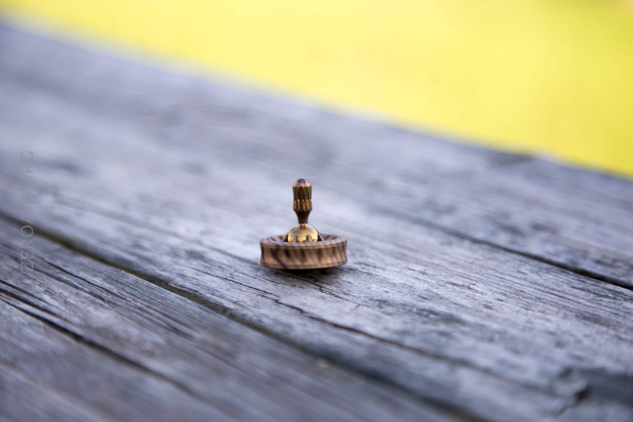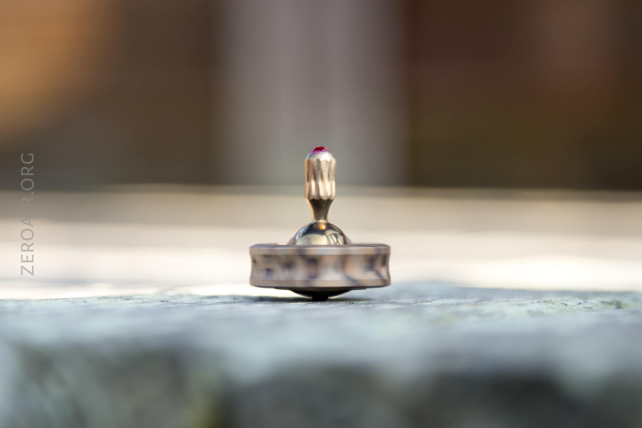 Why do I have that comment in this category? Because the main way this top feels is a result of the blasted Mokume outer disk. It’s very supple, and the blast provides just a bit of grip. That’s nice if you choose to spin this top “upside down” but in my case, I didn’t because of the ruby sphere. The hardness of the ruby would make for great spinning – but that hardness is exactly what also makes it brittle, which would not make for great results if the drop was careless…. (As a sidenote, the first top I was notably excited about was the Lambda by Prometheus Lights, which had a ruby contact point, and I never had any issues with it.)