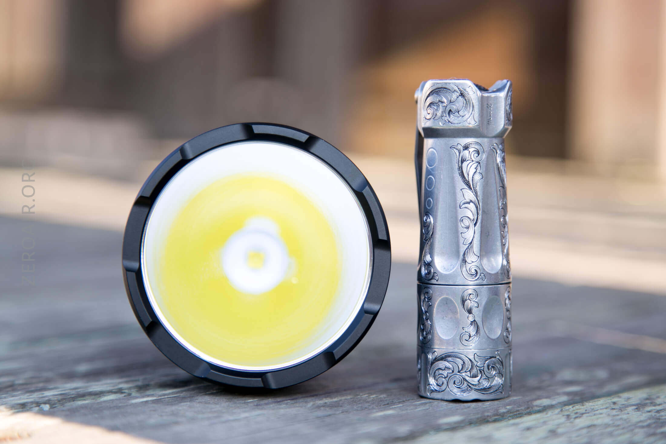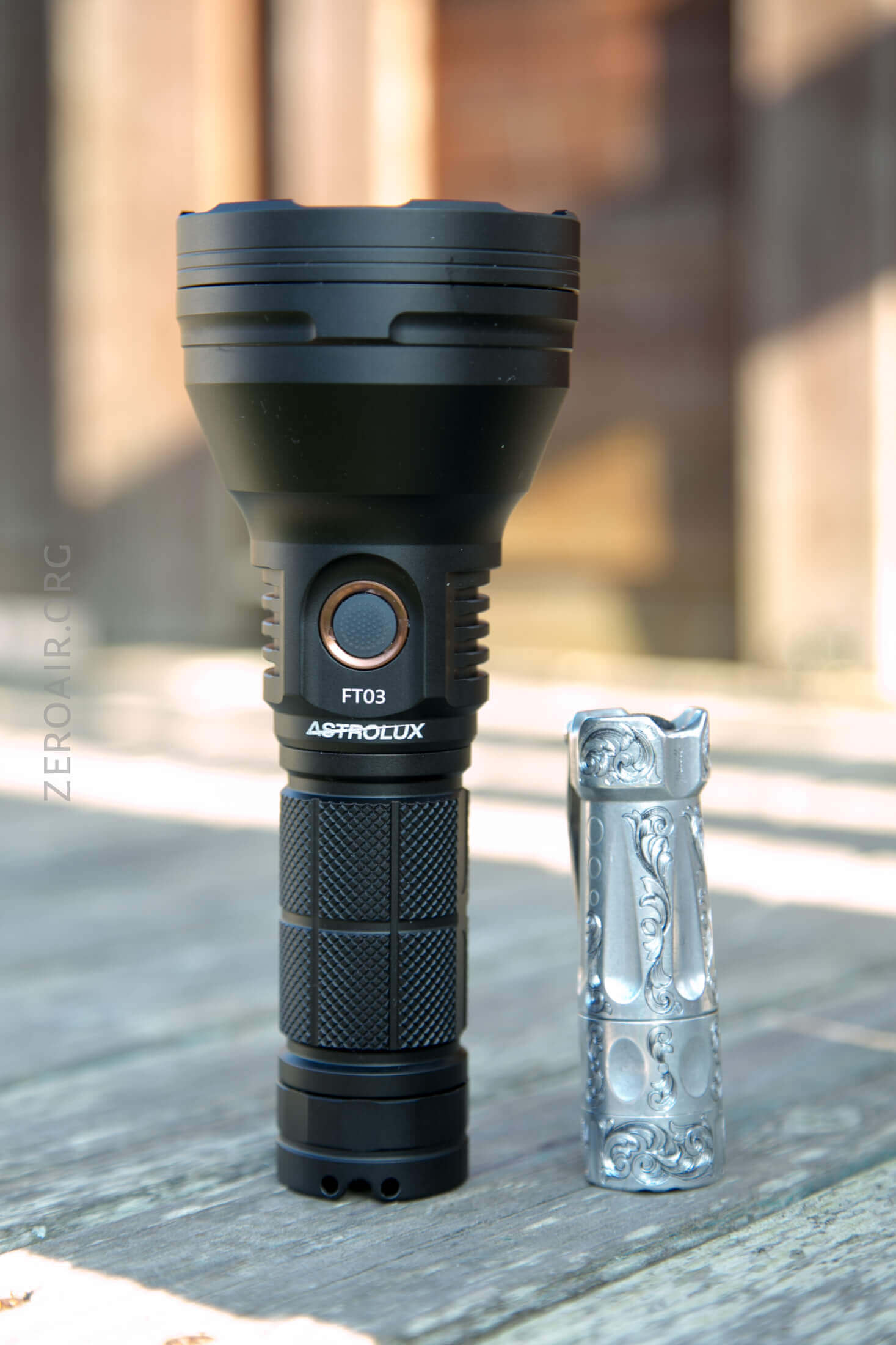 And here’s the light beside my custom-engraved TorchLAB BOSS 35, an 18350 light. I reviewed the aluminum version of that light in both 35 and 70 formats.