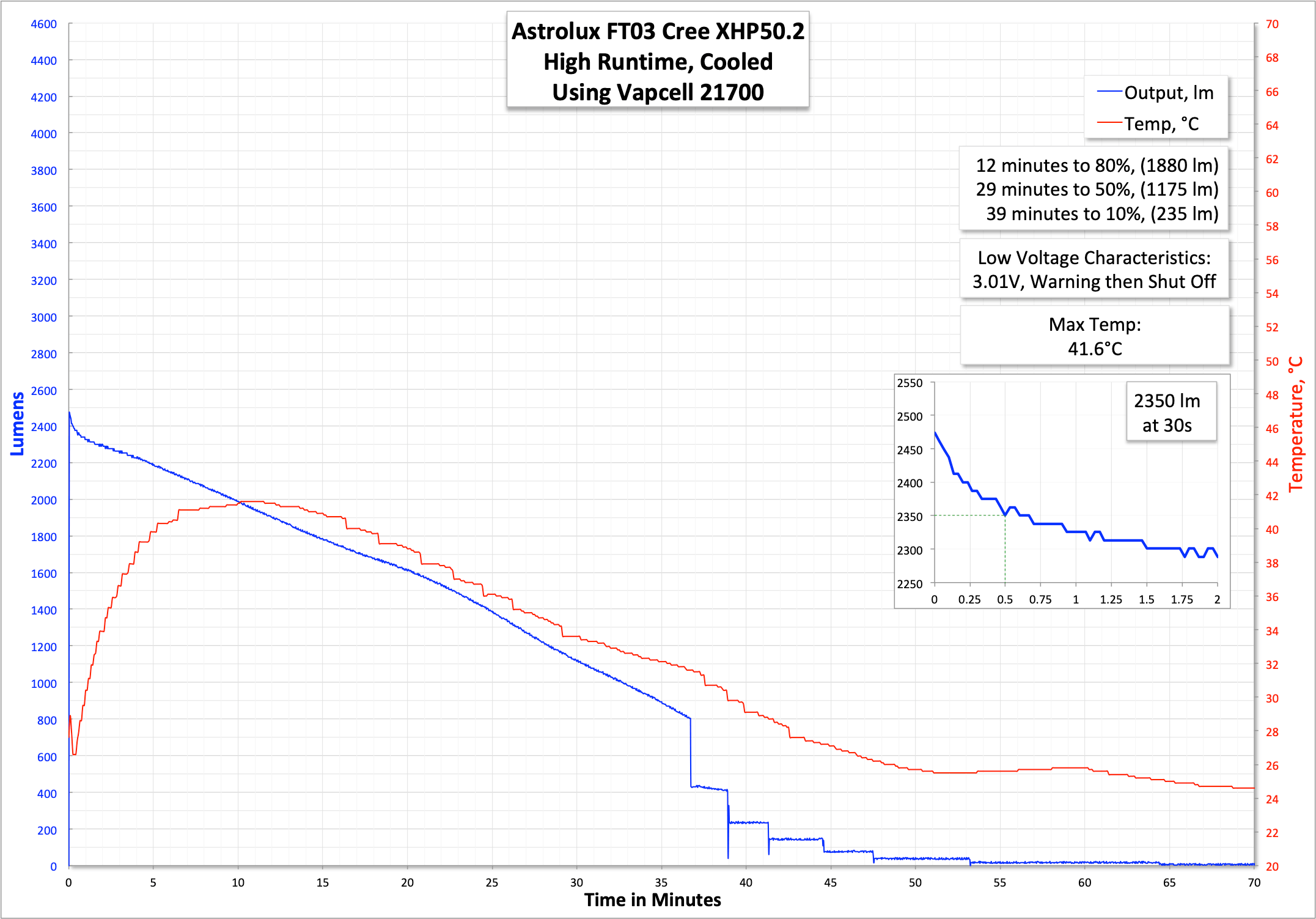 The light has LVP at around 2.7V, at which point the main emitter flashes and then the light goes off. Interestingly, this LVP warning isn’t from the switch….
