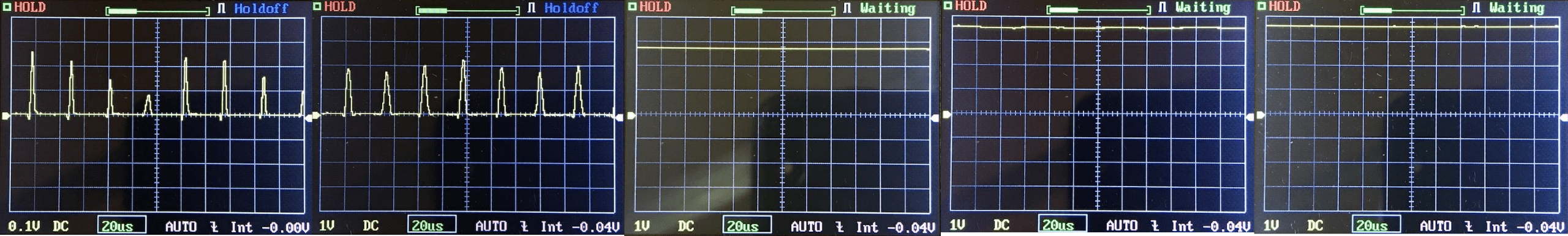 Then there’s the Ultrafire WF-602C flashlight, which has some of the worst PWM I’ve seen. It’s so bad that I used a post about it to explain PWM! Here are multiple timescales (10ms, 5ms, 2ms, 1ms, 0.5ms, 0.2ms) to make comparing this “worst” PWM light to the test light easier. That post also explains why I didn’t test the WF-602C at the usual 50us scale. And here’s the worst PWM light I have ever owned. Also, one of the very first lights I ordered directly from China!