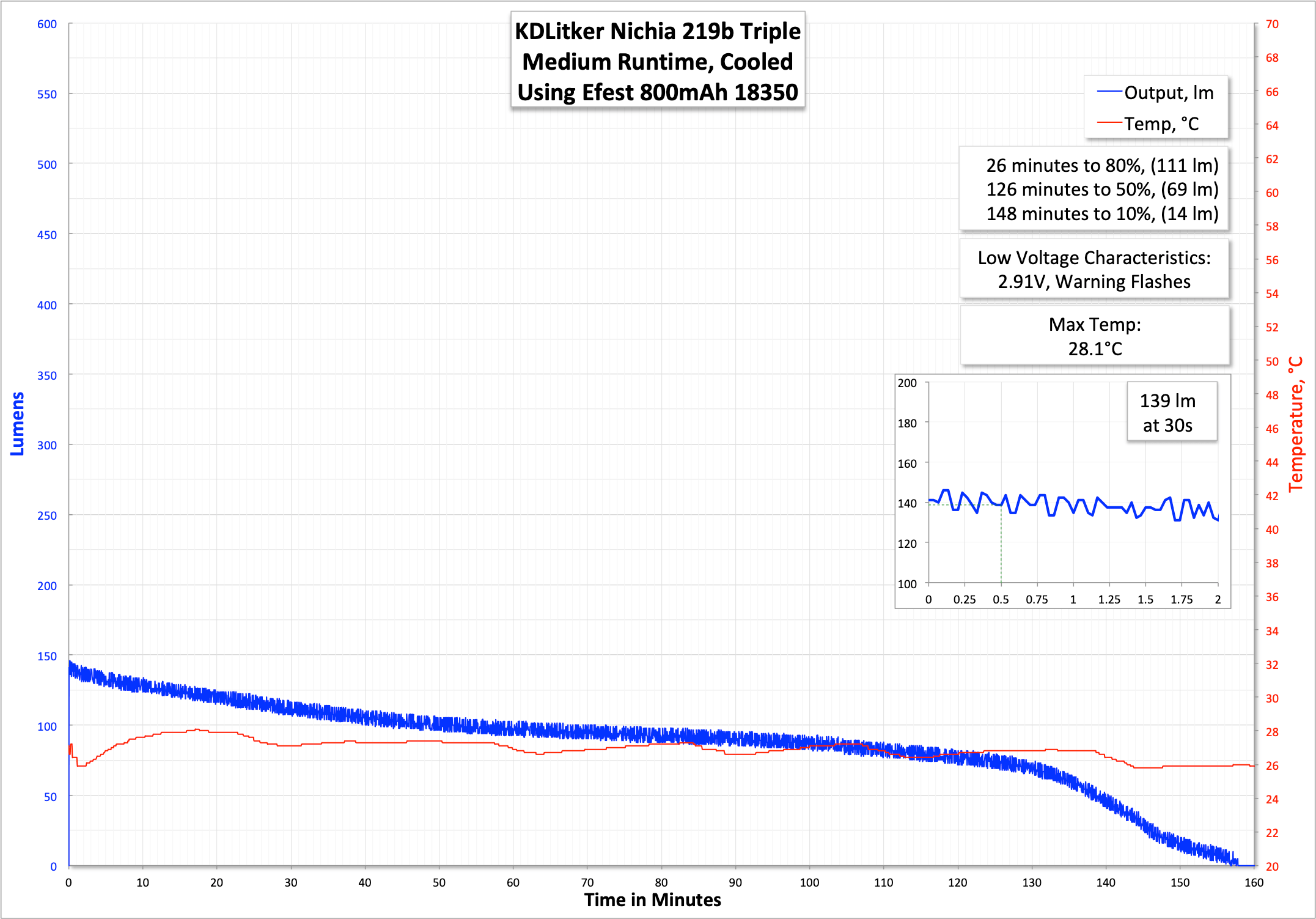 ^ Measurement disclaimer: Testing flashlights is my hobby. I use hobbyist-level equipment for testing, including some I made myself. Try not to get buried in the details of manufacturer specifications versus measurements recorded here; A certain amount of difference (say, 10 or 15%) is perfectly reasonable.