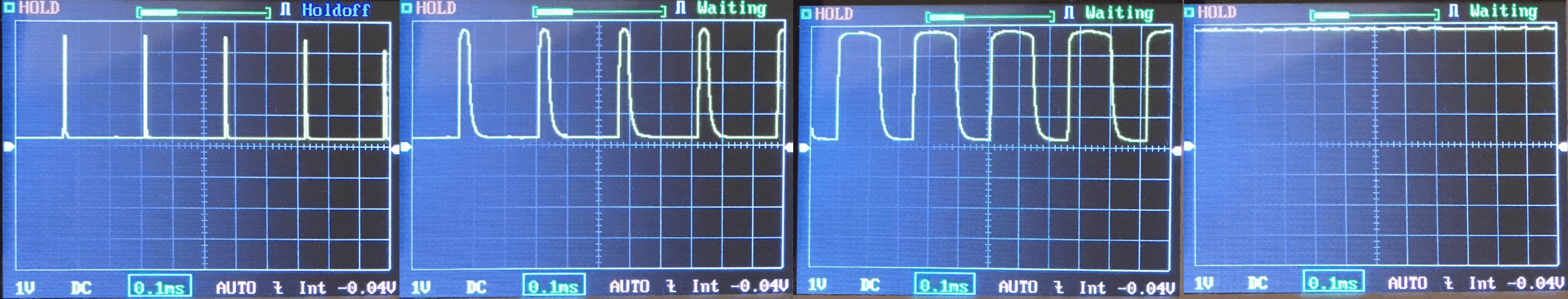 Then there’s the Ultrafire WF-602C flashlight, which has some of the worst PWM I’ve seen. It’s so bad that I used a post about it to explain PWM! Here are multiple timescales (10ms, 5ms, 2ms, 1ms, 0.5ms, 0.2ms) to make comparing this “worst” PWM light to the test light easier. That post also explains why I didn’t test the WF-602C at the usual 50us scale.