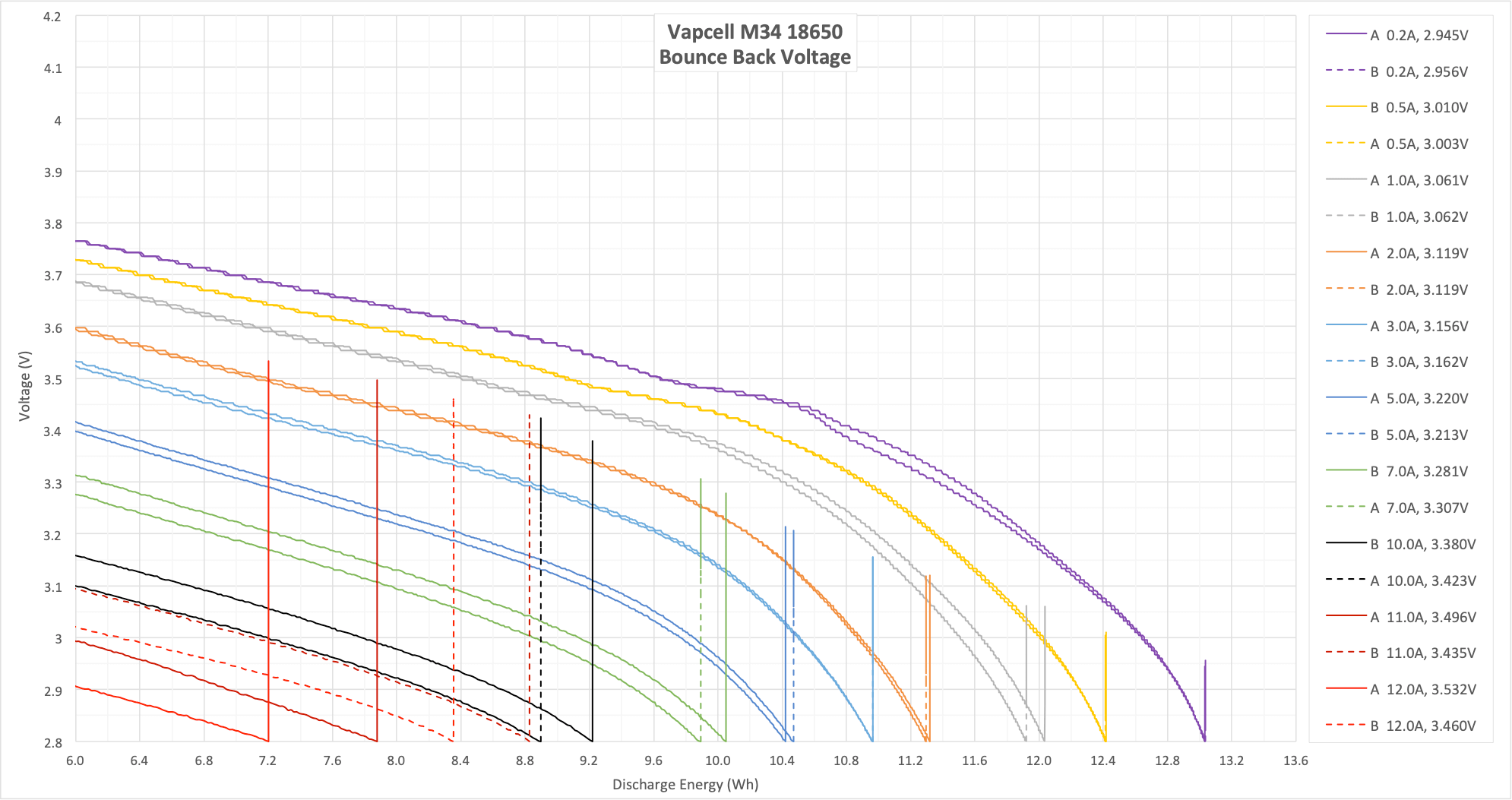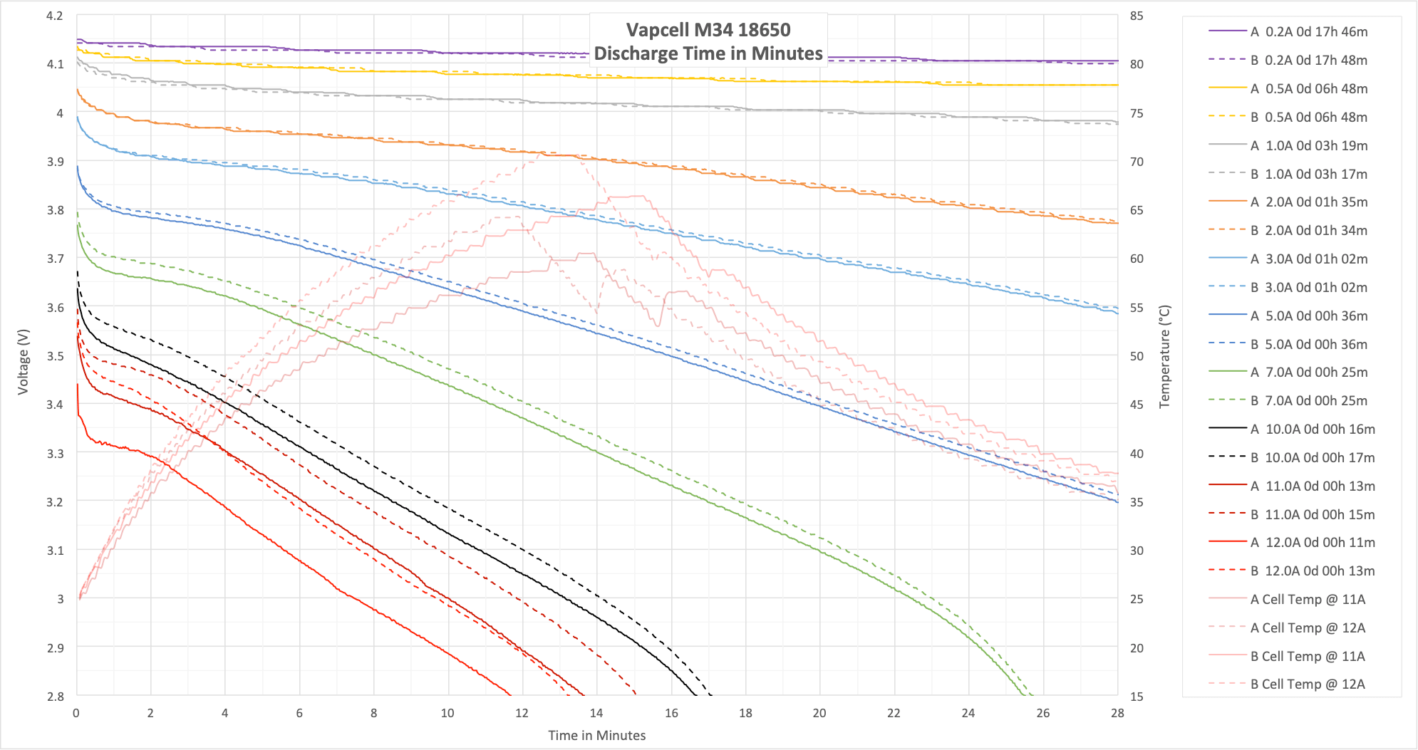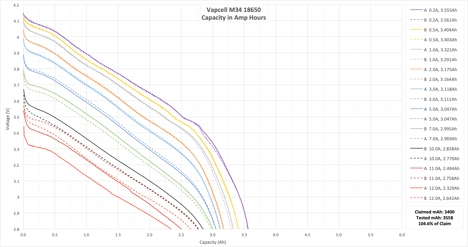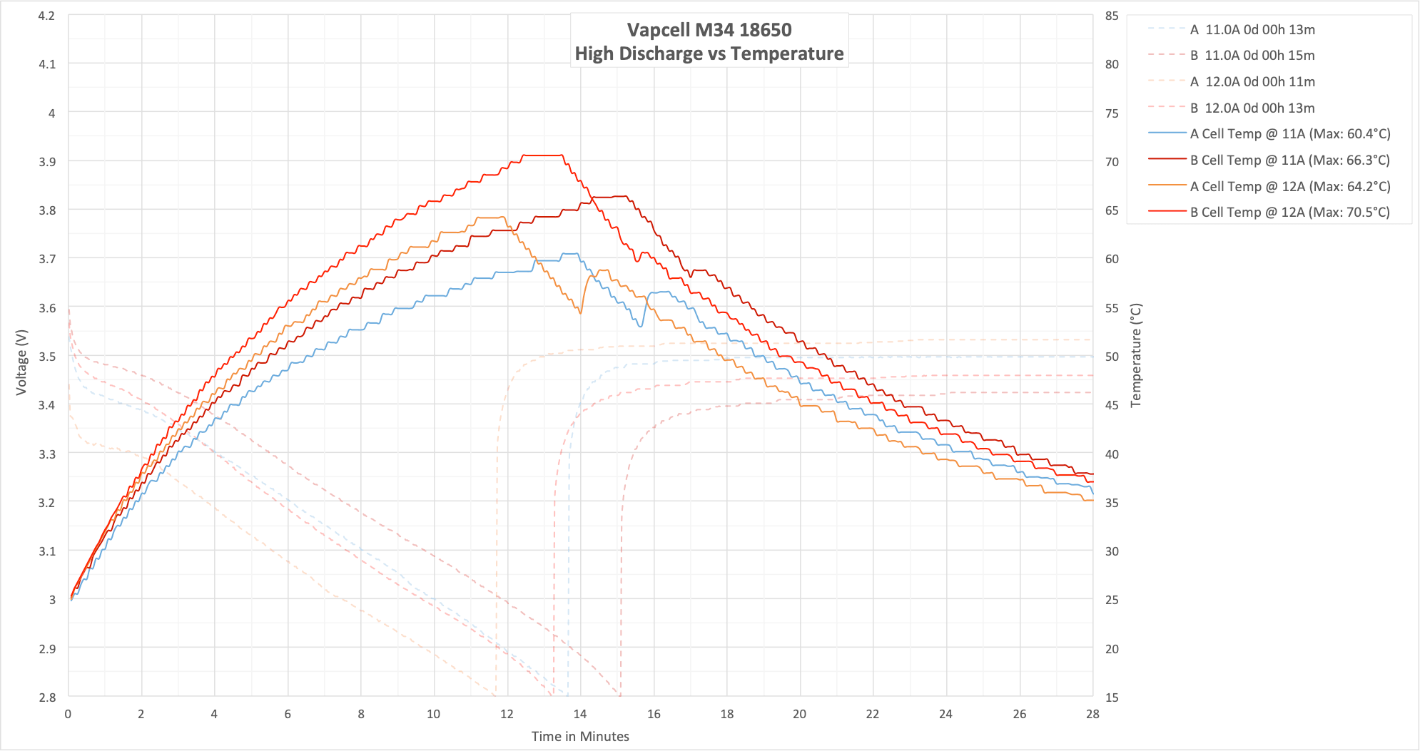 These two tests aren’t my normal 15/20A test, since the M34 is rated to only 10A. I did run these at 11A and 12A, though, which is outside the specs of the cell. The result here shows that 10A is a good hard max for this cell.
