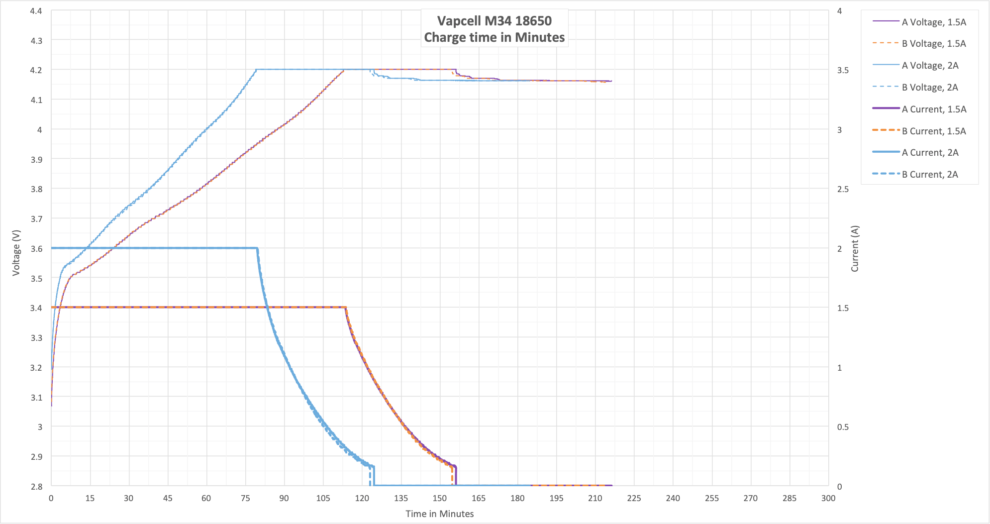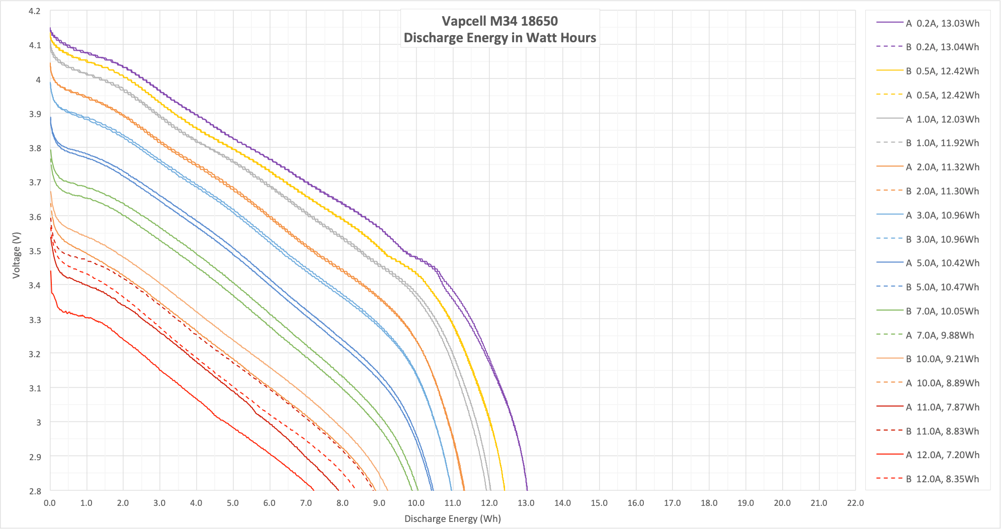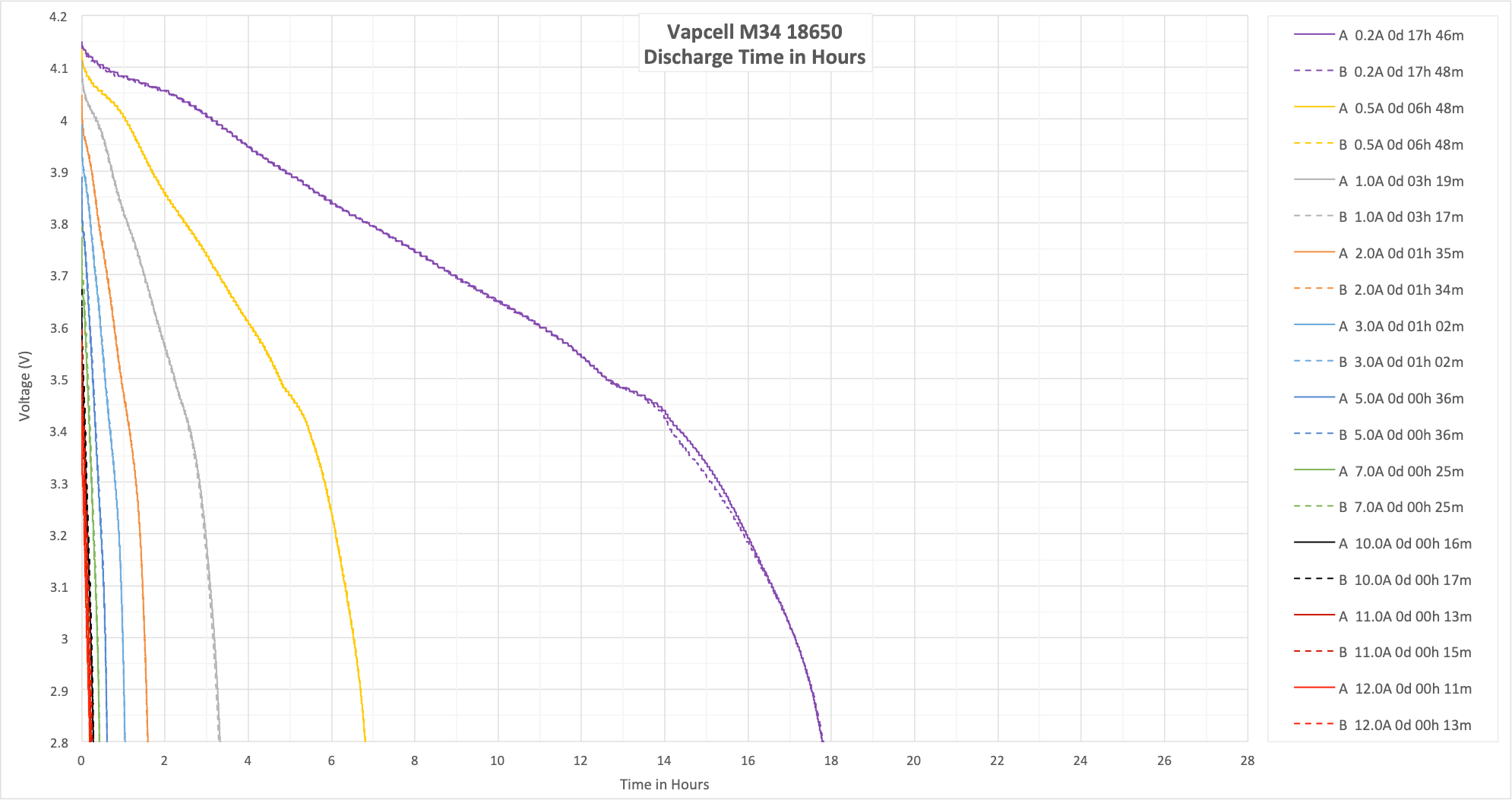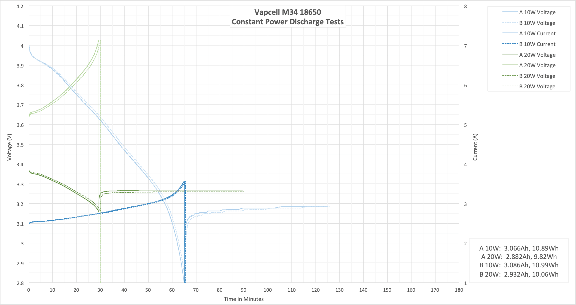 These two tests aren’t my normal 15/20A test, since the M34 is rated to only 10A. I did run these at 11A and 12A, though, which is outside the specs of the cell. The result here shows that 10A is a good hard max for this cell.