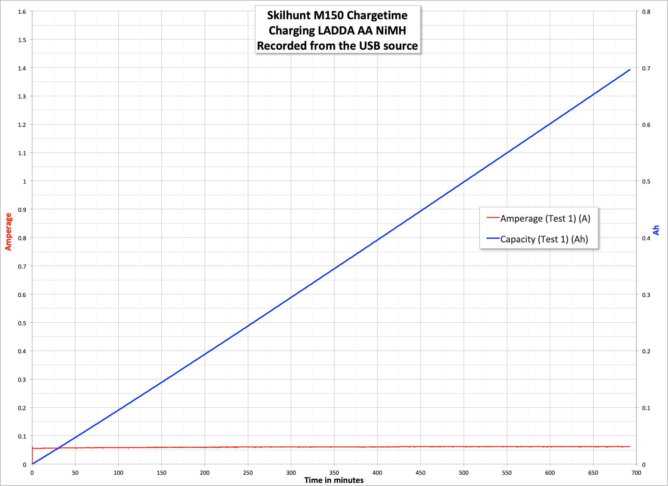 The manual states a bit ambiguously that only Li-ion cells should be charged in this light, but I found that NiMH can be charged, but it’s not “real charging.” Basically, it seems that the light provides non-trivial but minimal power to a cell, so eventually you’ll have a charged cell. Since that’s a terrible way to charge a NiMH cell, I do not recommend it (and to be clear, Skilhunt doesn’t either). BUT in a pinch, it can be done. The graph below is over 10 hours of charging, and only ~700mAh has been put into the cell.