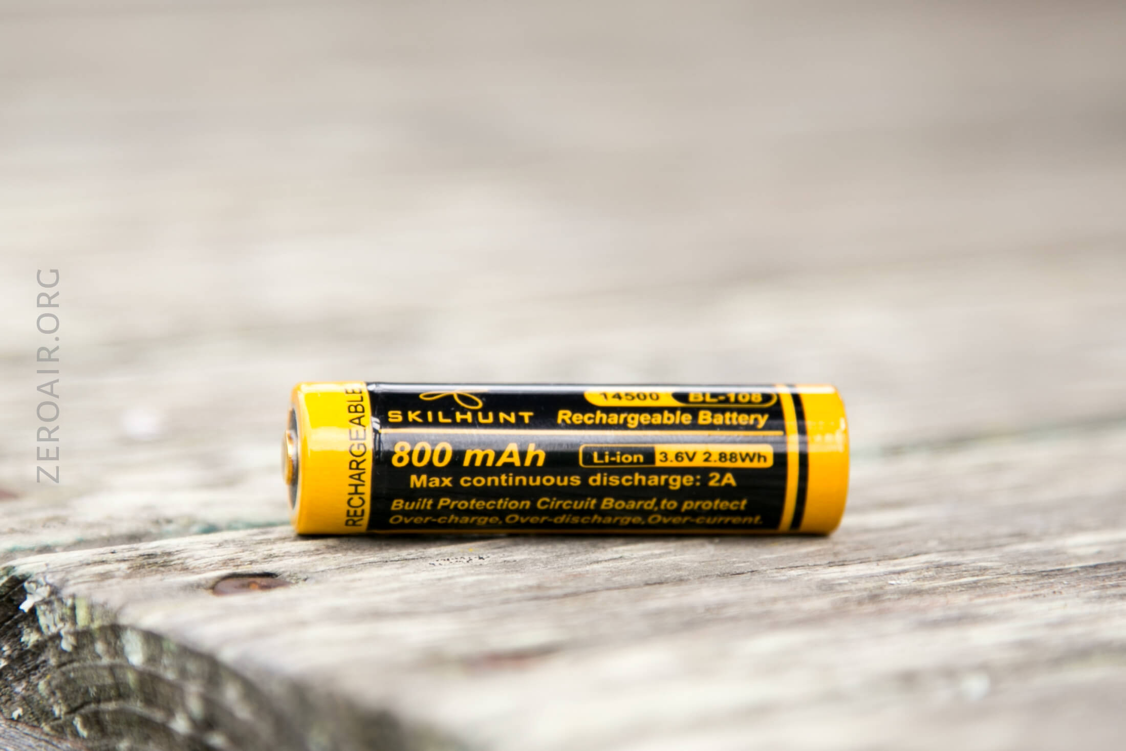 The M150 runs on a single li-ion cell. It uses a 14500 cell, and Skilhunt includes an 800mAh version.