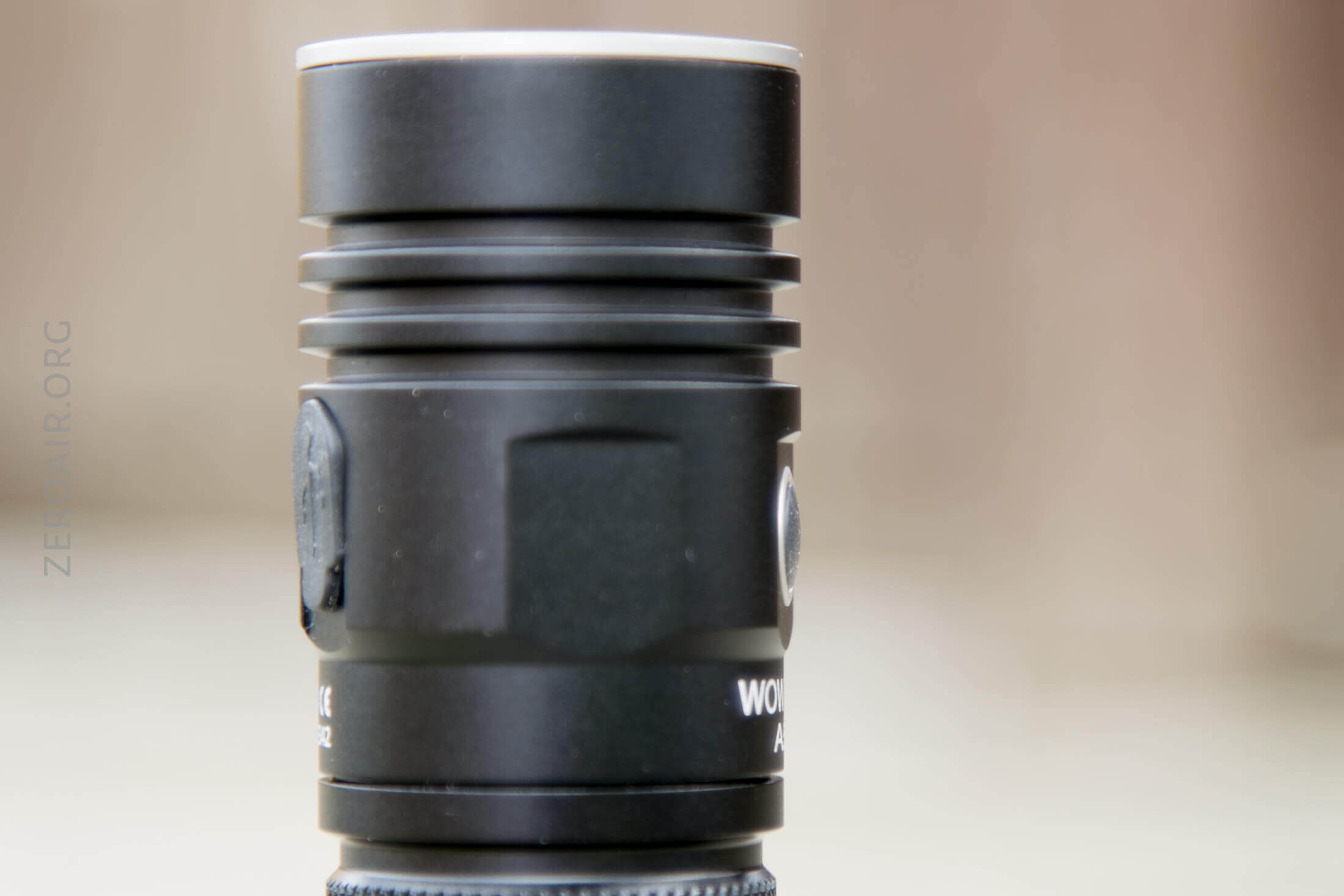 This Wowtac has a single side switch, which is an indicating e-switch. There are two emitters, displaying red and blue. The cover is clear silicone, and a little low and hard to find for my tastes – I prefer these side switches to be a bit proud like on the A4.