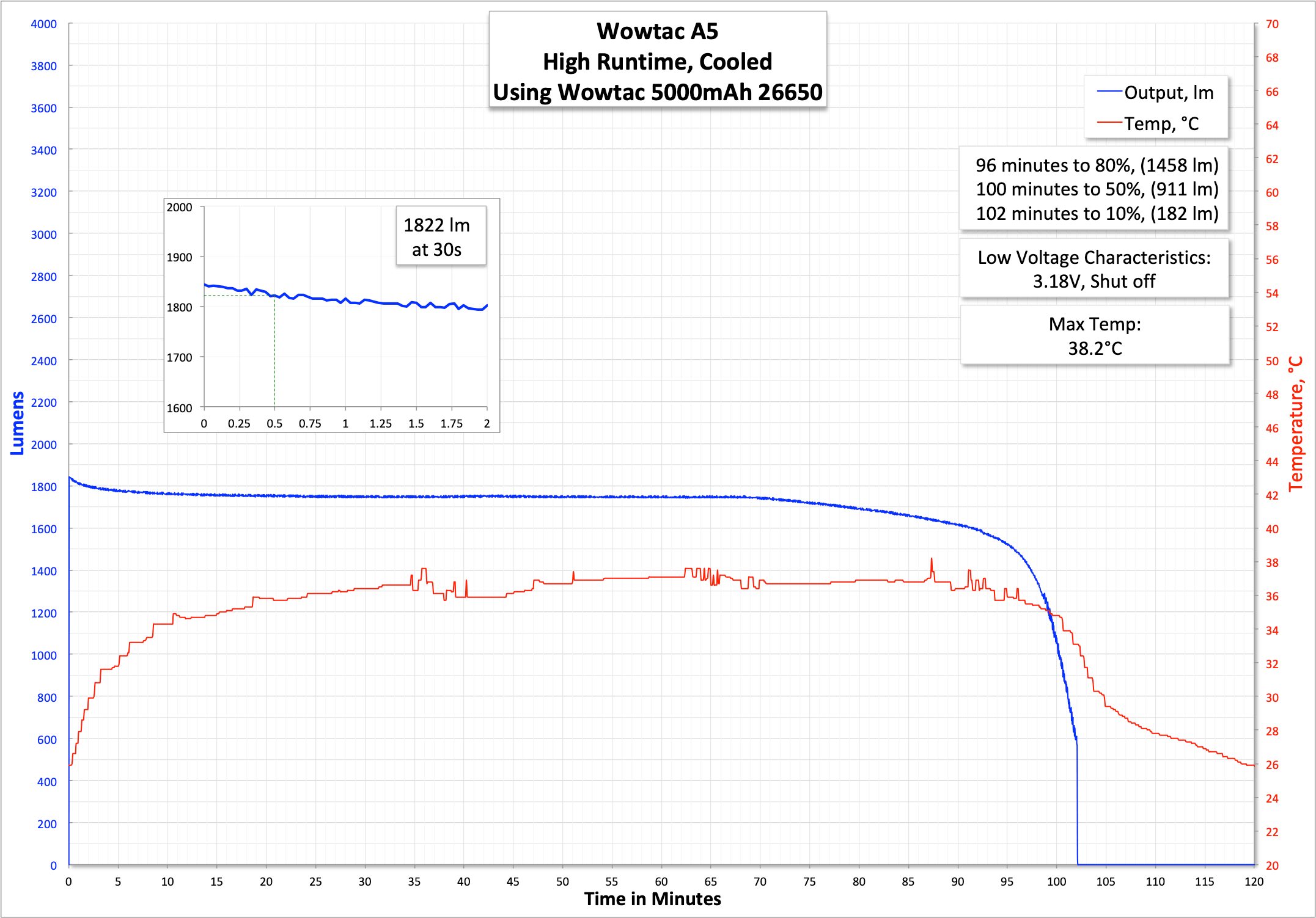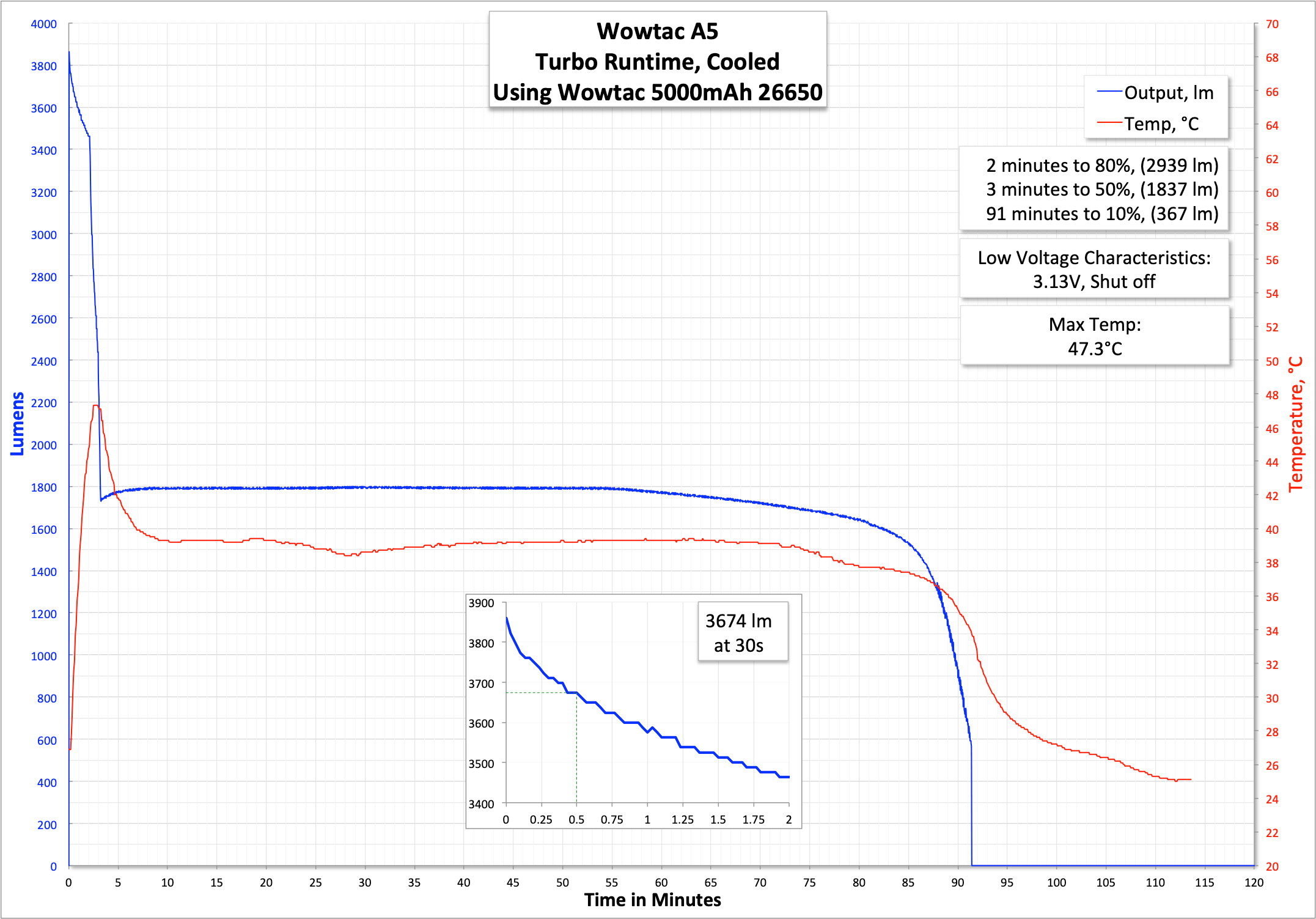 Here’s a runtime on Turbo. Output holds for around 3 minutes before dropping, likely due to temperature. At 30 seconds, the output is much higher than the claim, at >3700 lumens. The light steps down to around 1800 lumens, which isn’t a trivial output, for 90 or so minutes. This level is the same as High.