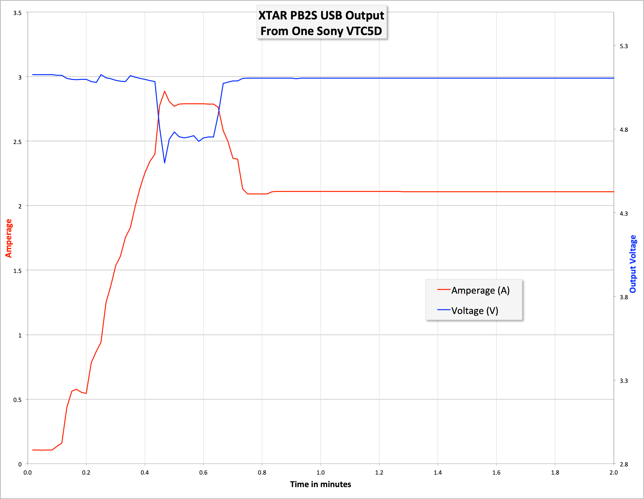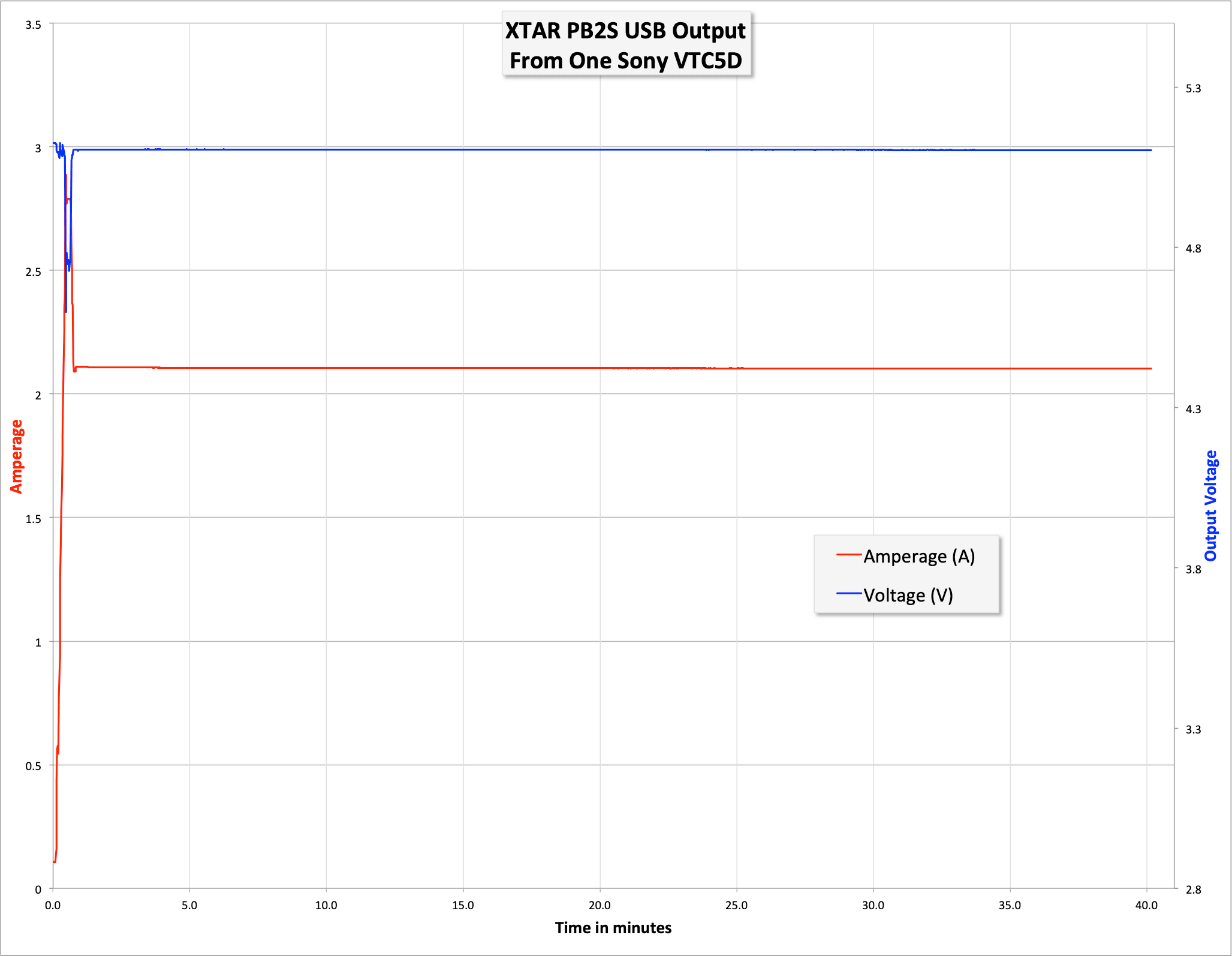 Here’s the USB output from the USB-A port. First, just a couple of minutes, so you can see how high current can go – In this case, only up to just under 3A out, and the voltage drops and output stops.