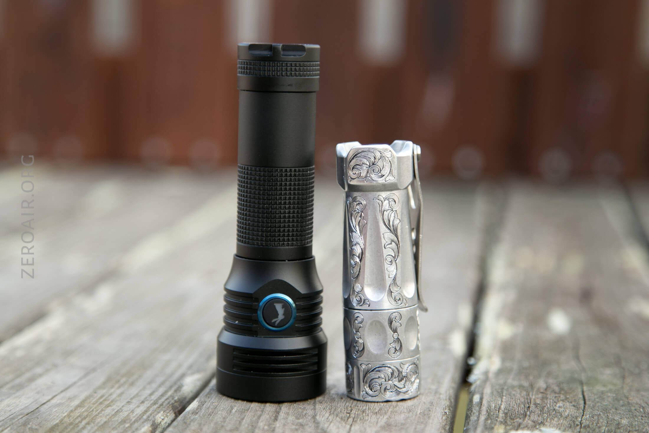 And here’s the light beside my custom-engraved TorchLAB BOSS 35, an 18350 light. I reviewed the aluminum version of that light in both 35 and 70 formats.