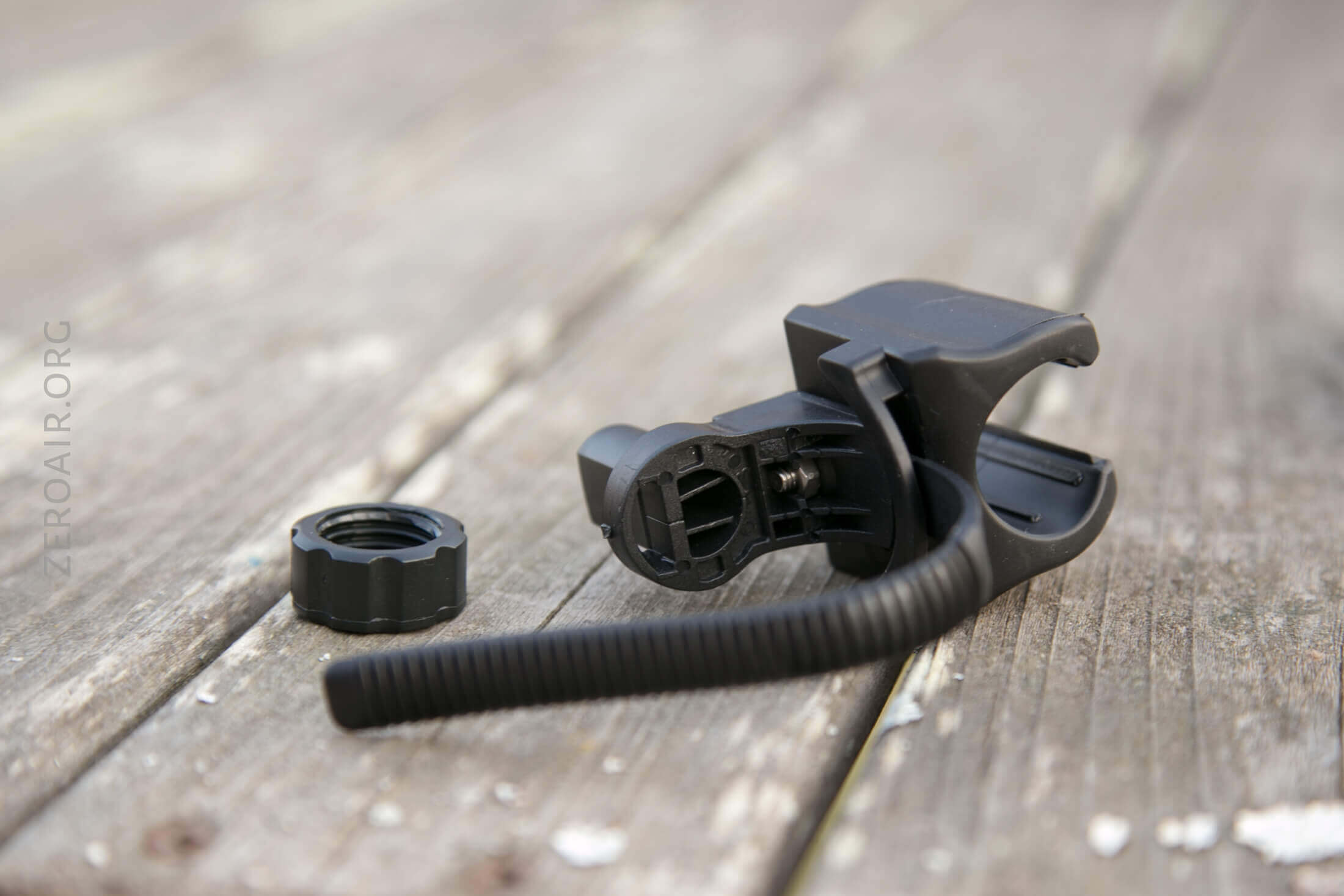 Also included, and the primary way for mounting the light is a novel mounting system. On the left below is the device together. On the right is a better idea of how it goes over a handlebar. It’s very simple and also requires no tools.