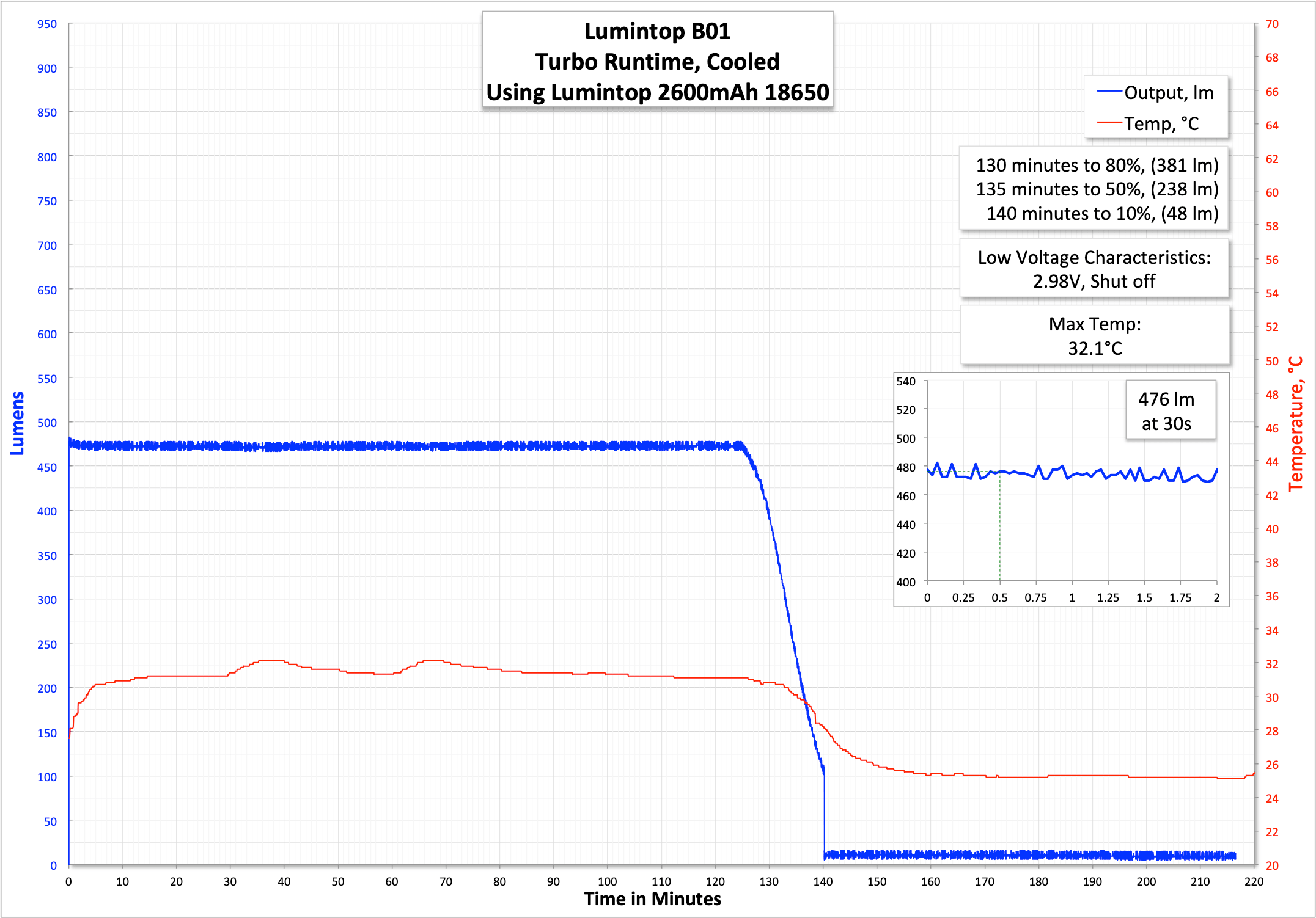 Turbo steps down after 3-4 minutes to around 475 lumens, which it holds for over 2 hours.