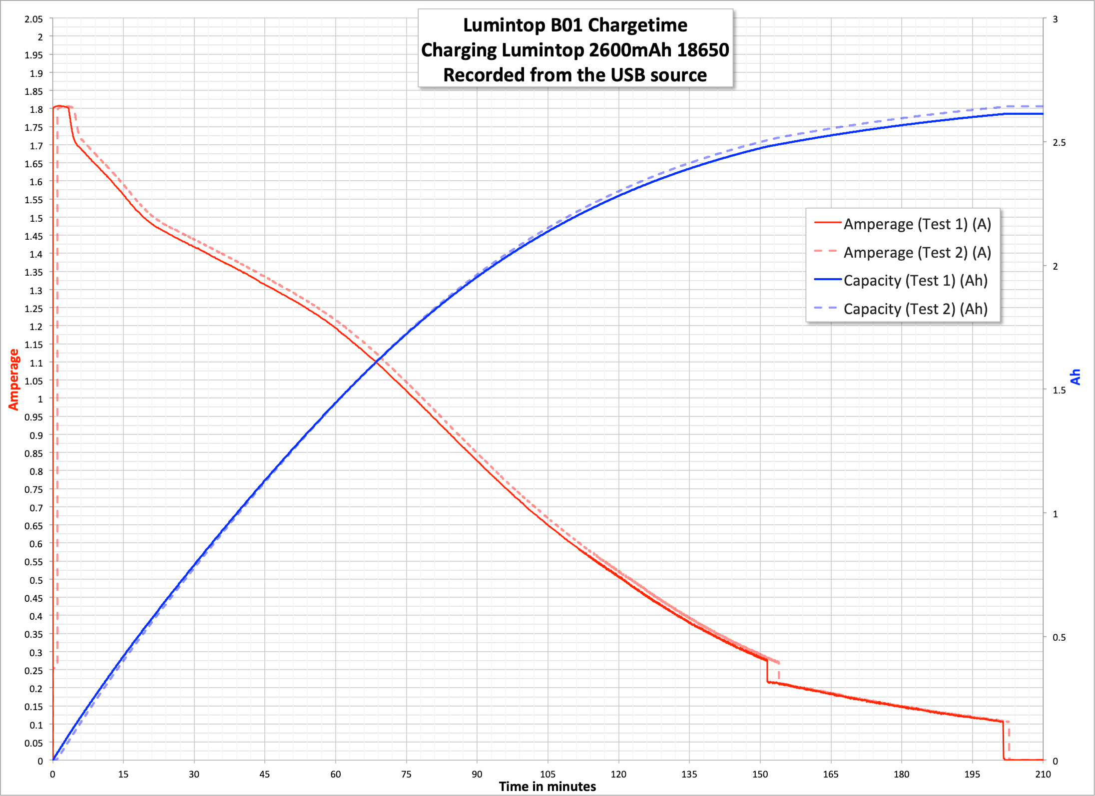 Charging is a bit weird, with an extremely short CC phase and a long, drawn-out CV phase. This makes charging take around 3.5 hours.