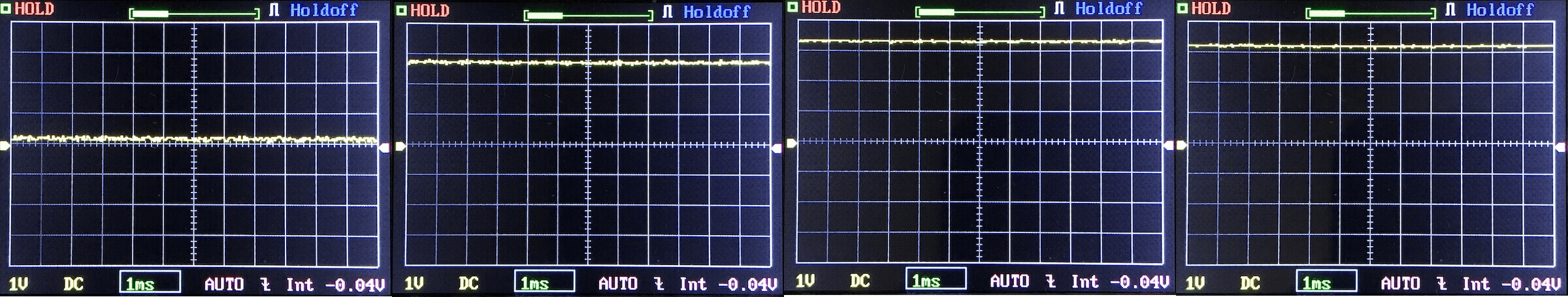 Then there’s the Ultrafire WF-602C flashlight, which has some of the worst PWM I’ve seen. It’s so bad that I used a post about it to explain PWM! Here are multiple timescales (10ms, 5ms, 2ms, 1ms, 0.5ms, 0.2ms) to make comparing this “worst” PWM light to the test light easier. That post also explains why I didn’t test the WF-602C at the usual 50us scale.