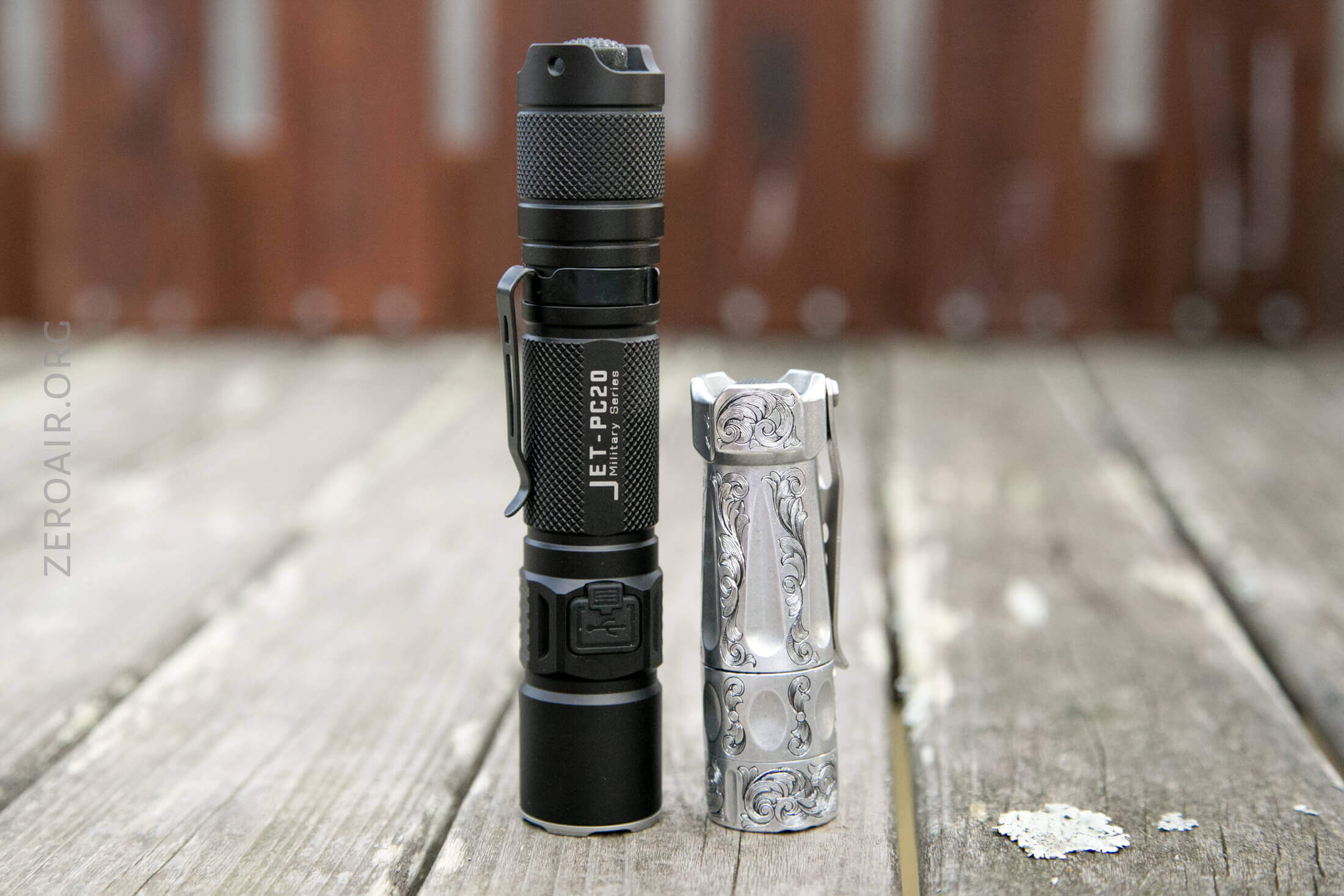 And here’s the light beside my custom-engraved TorchLAB BOSS 35, an 18350 light. I reviewed the aluminum version of that light in both 35 and 70 formats.