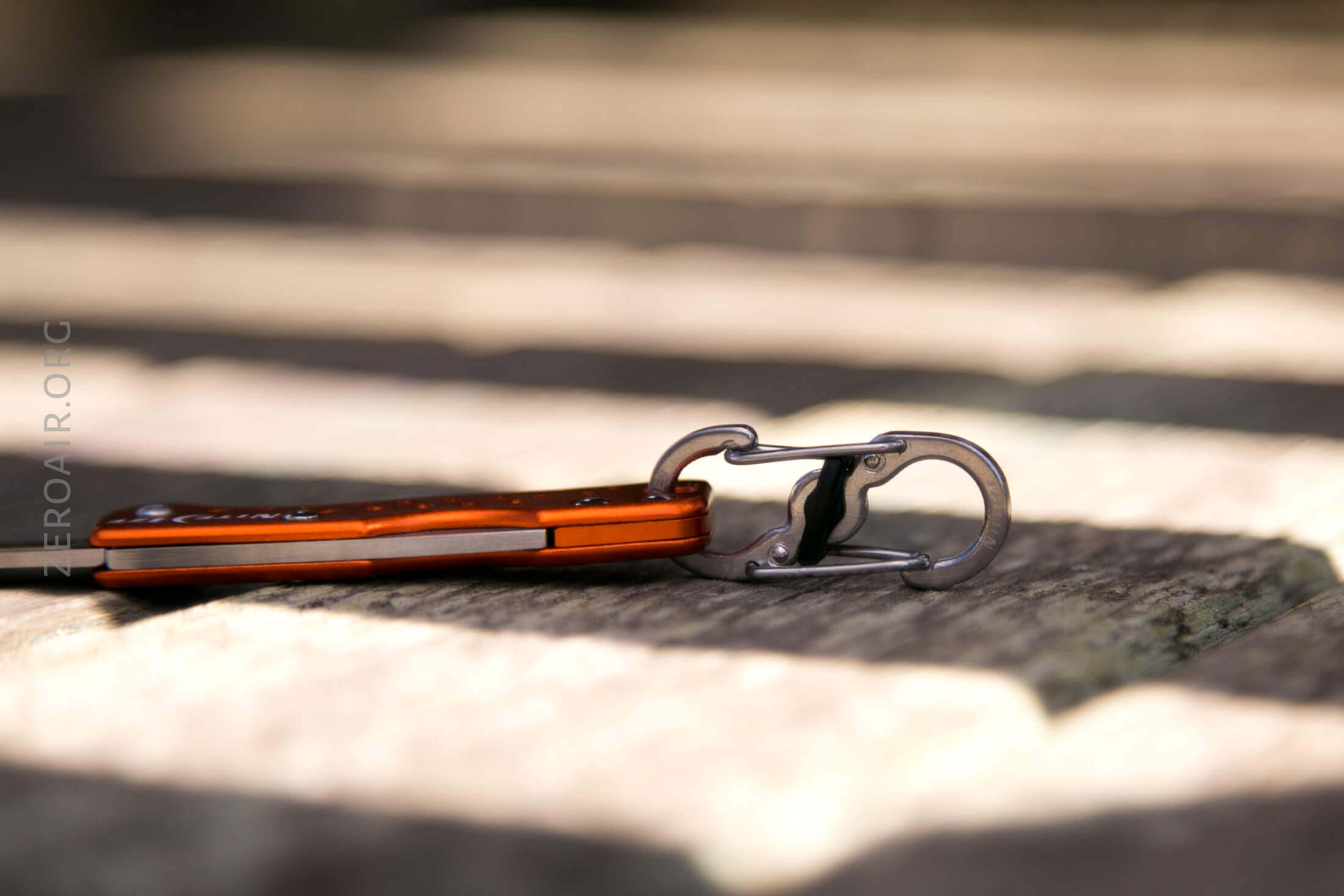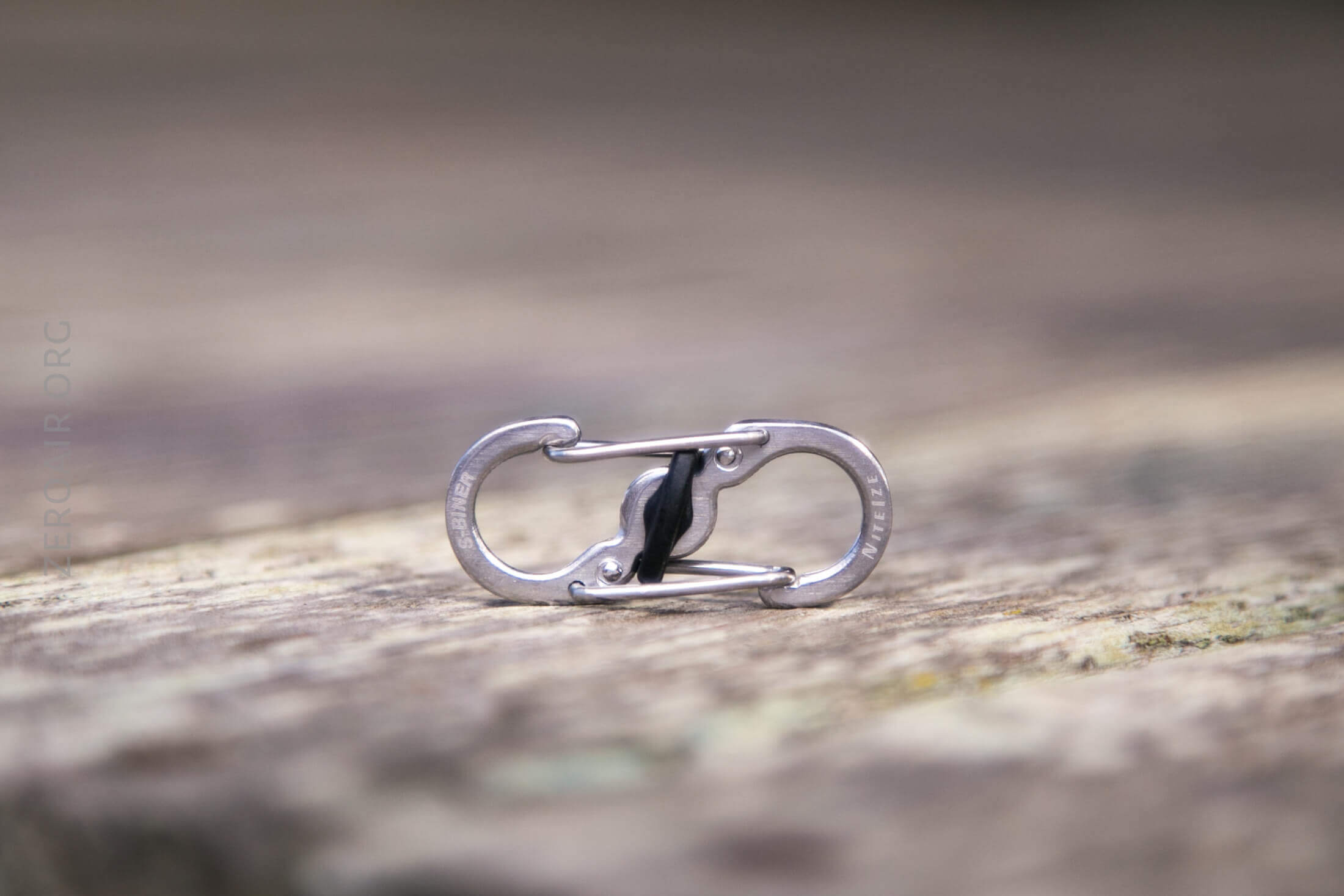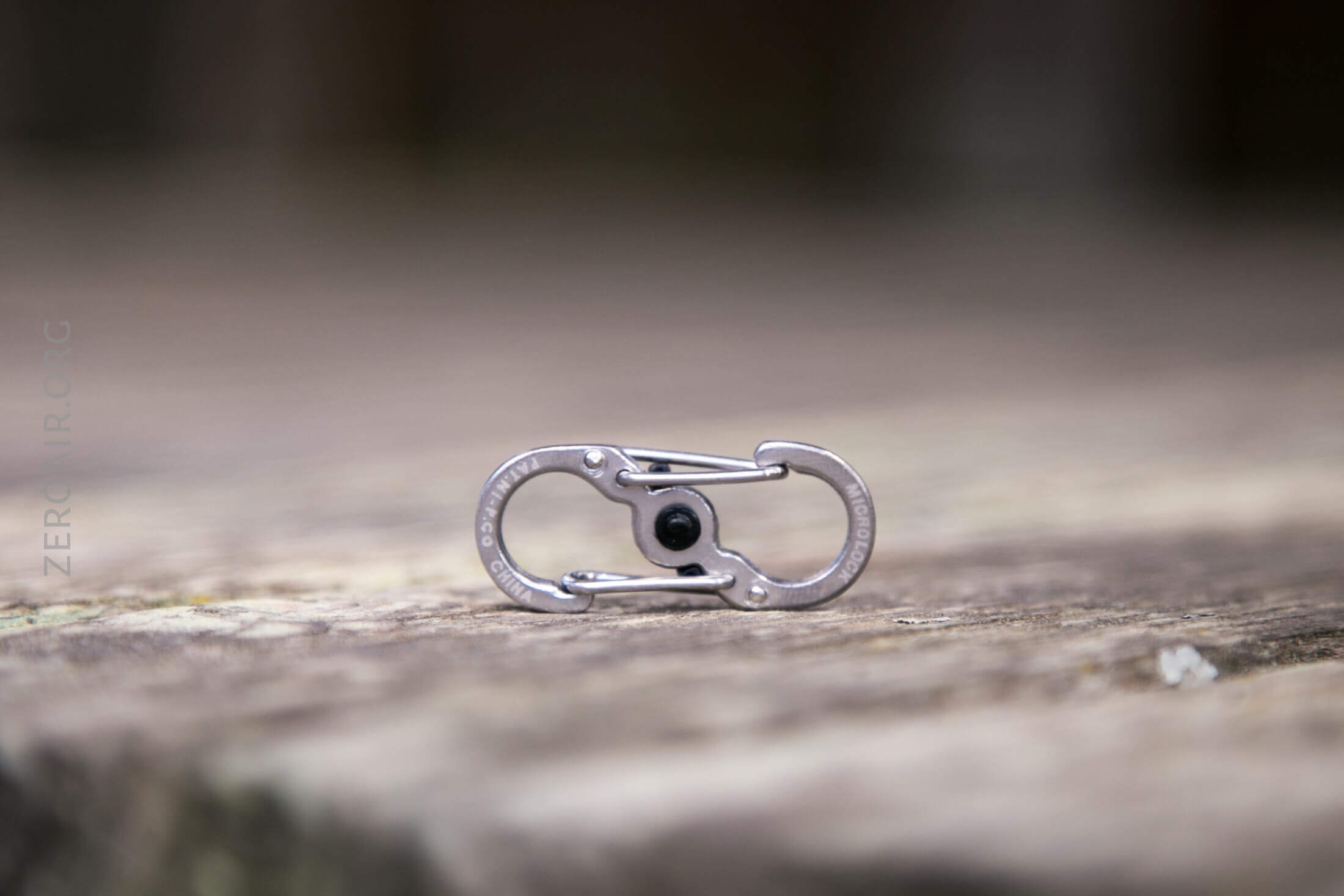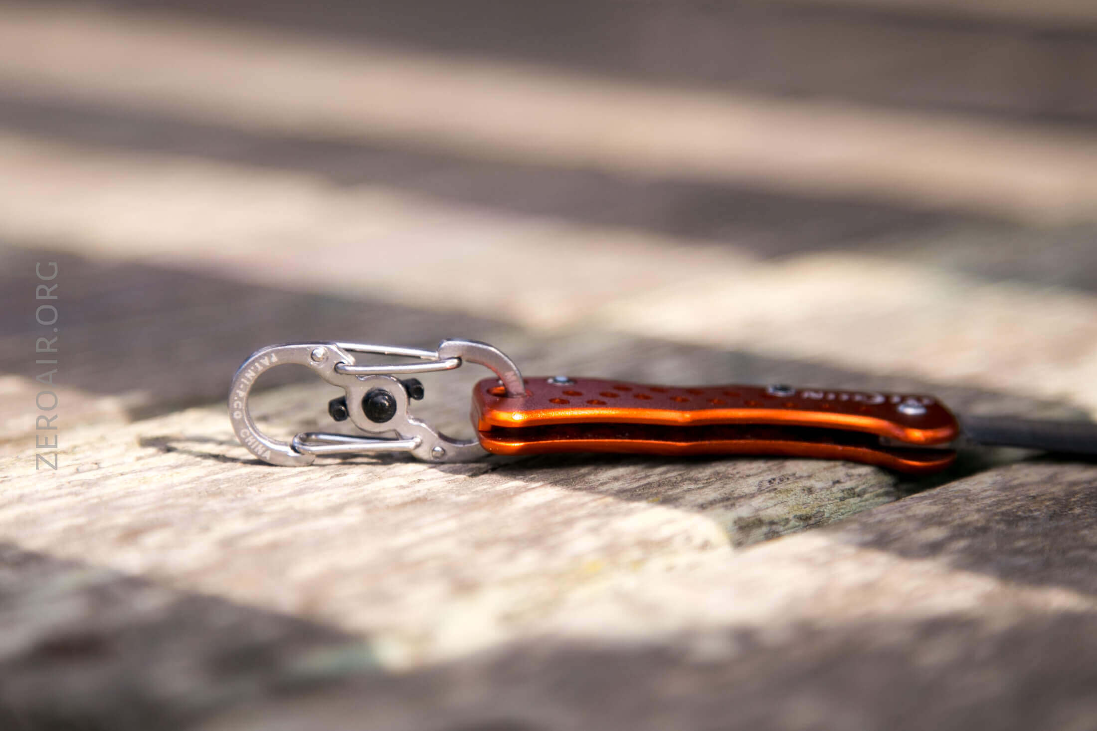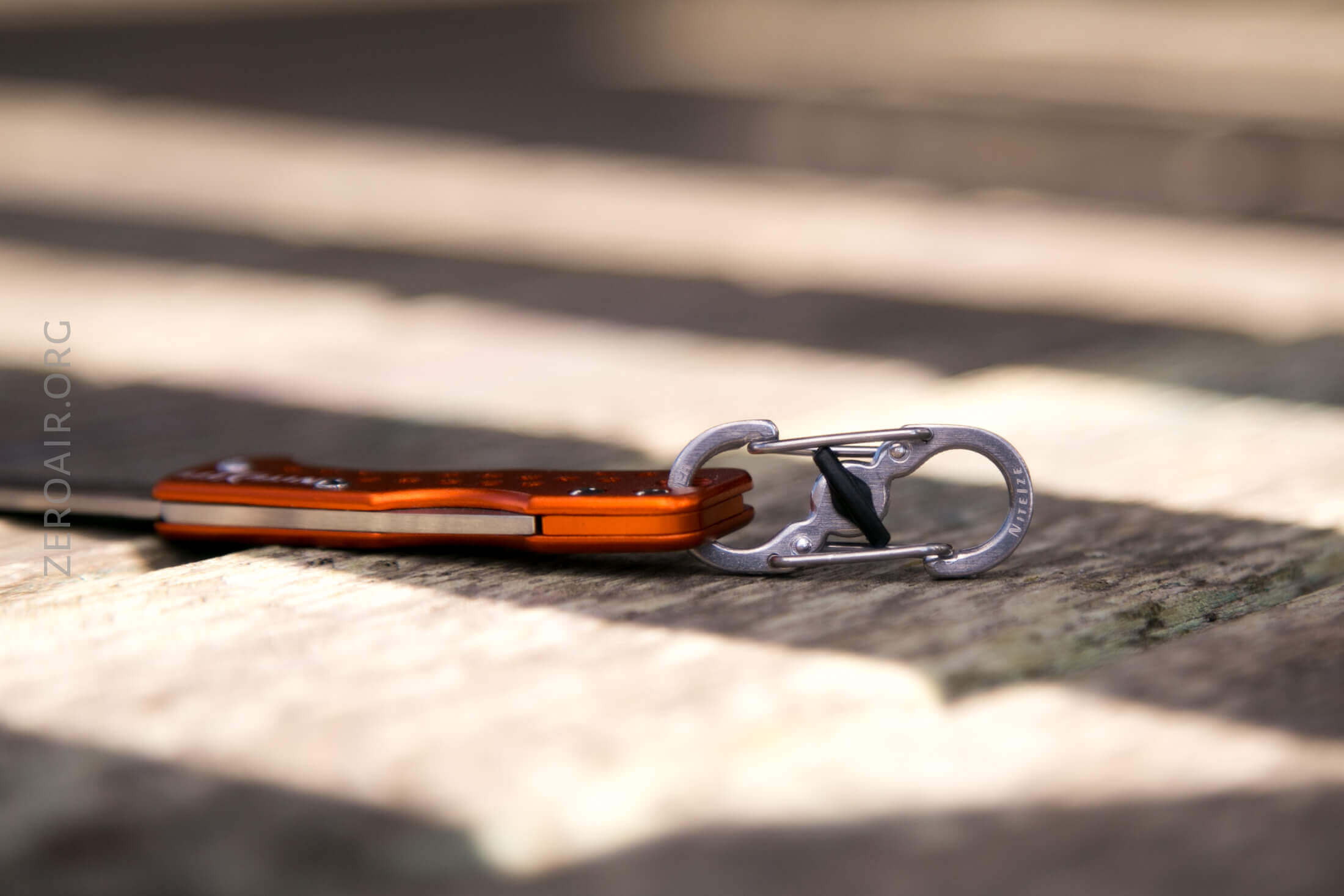 Nite Ize includes this S-Biner microlock, which attaches to the tail end of the knife. The S-Biner can lock, so the gates will not open (seen locked above right).