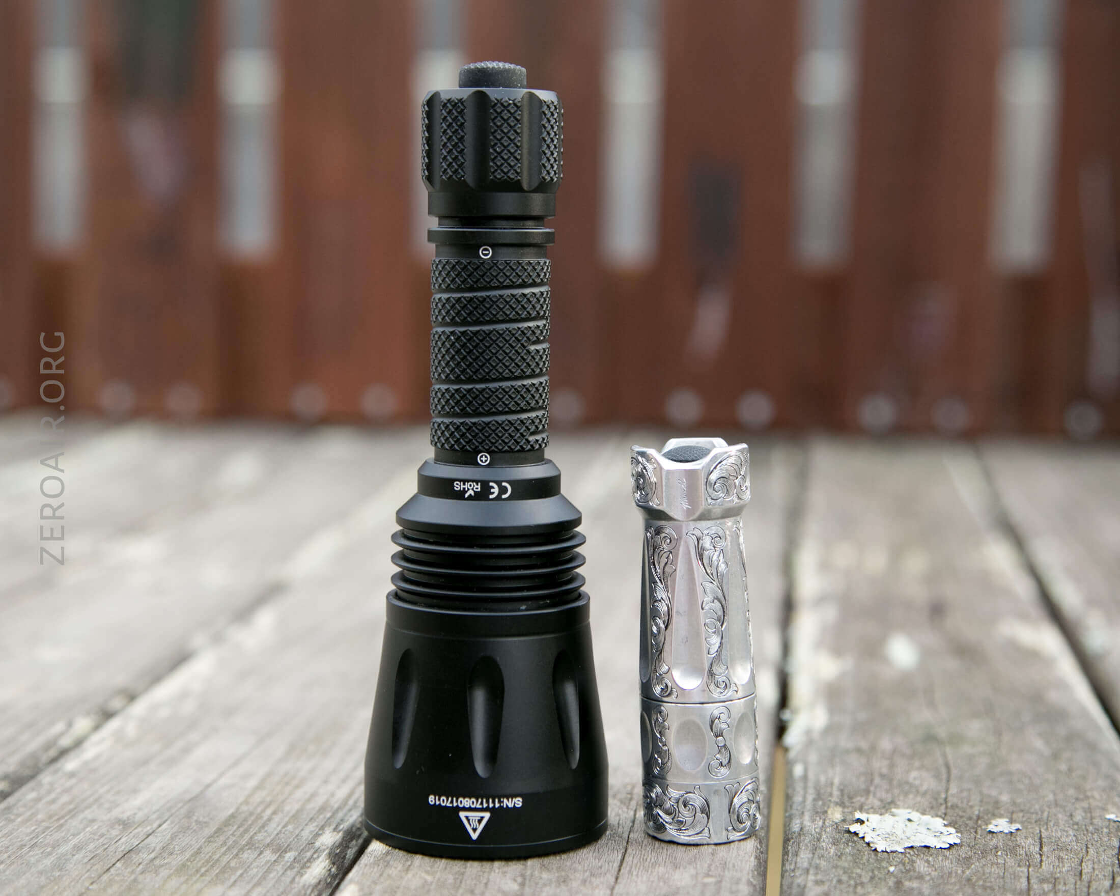 And here’s the light beside my custom-engraved TorchLAB BOSS 35, an 18350 light. I reviewed the aluminum version of that light in both 35 and 70 formats.