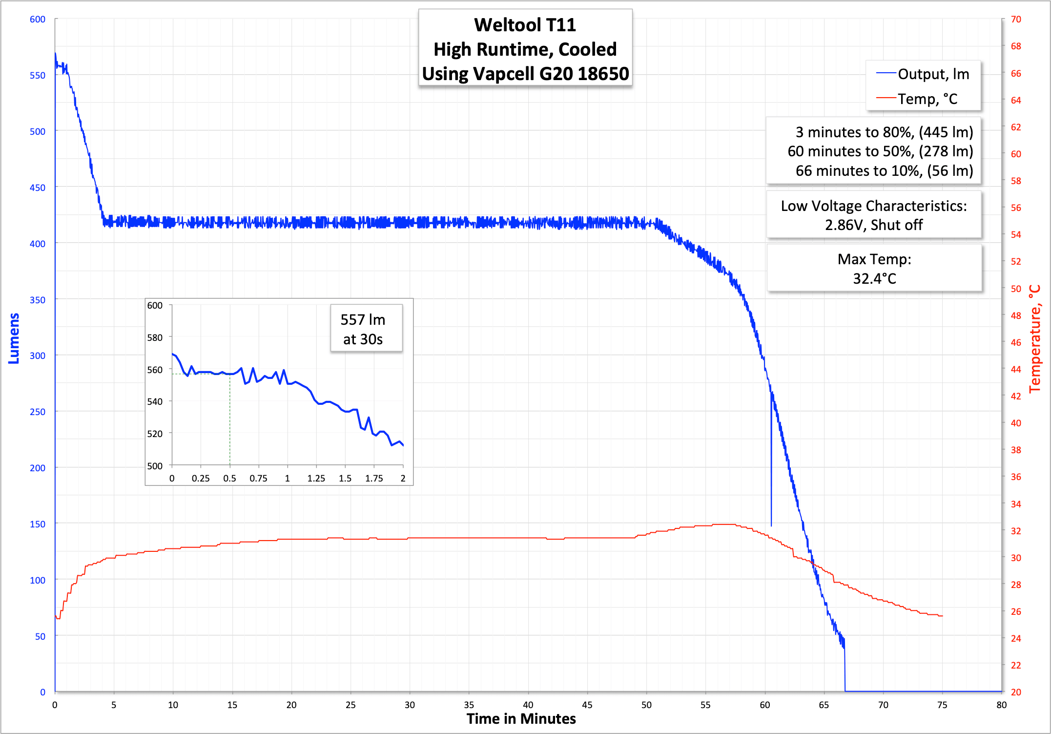 Here’s a runtime on High. I didn’t hit the output specs, but as throwy as this light is, I chalk that up to my PVC tube not responding well to such throw. Either way, I’m not sweating the output because the light hits the throw specs (and throw is much more important on this light).