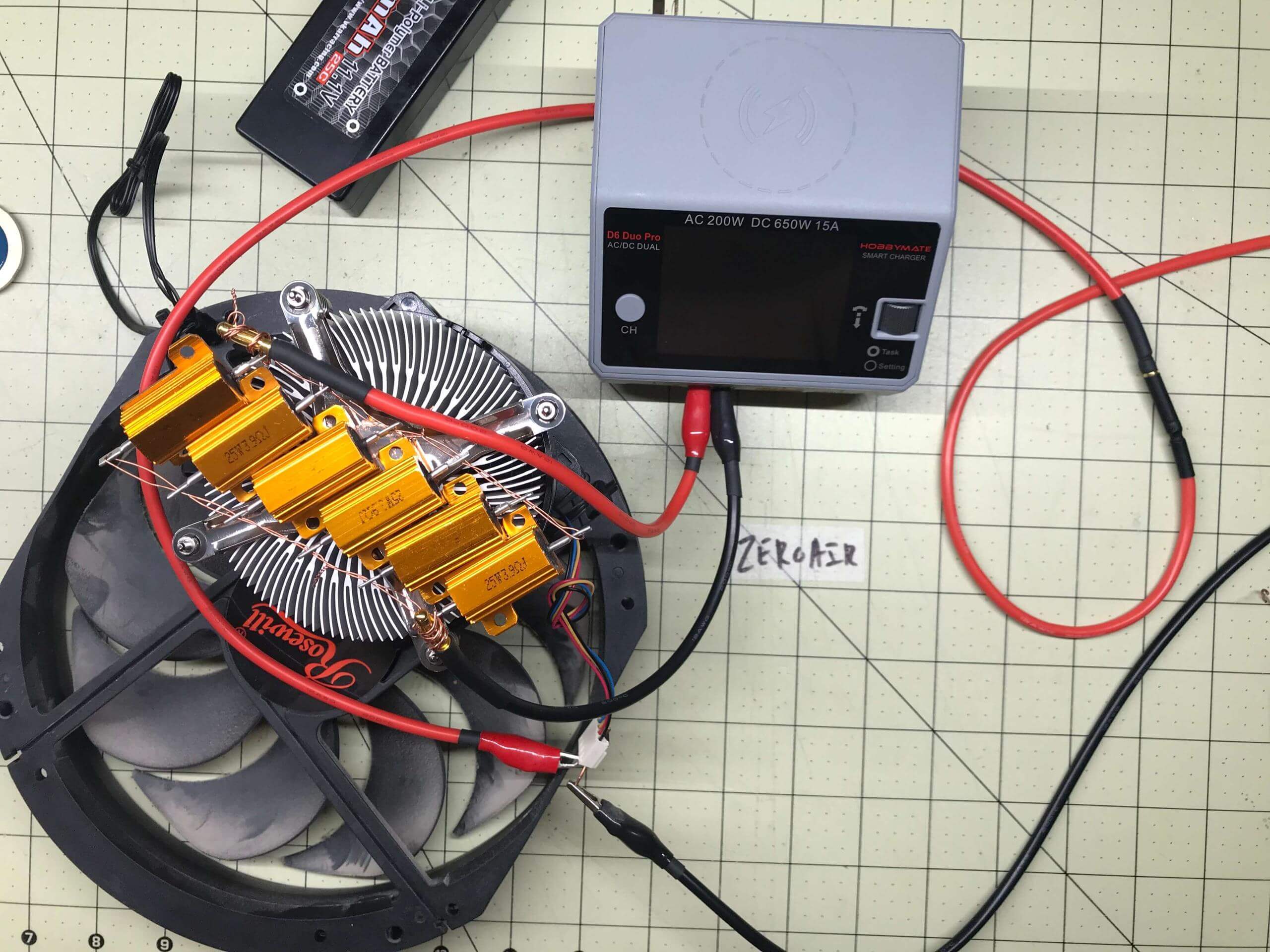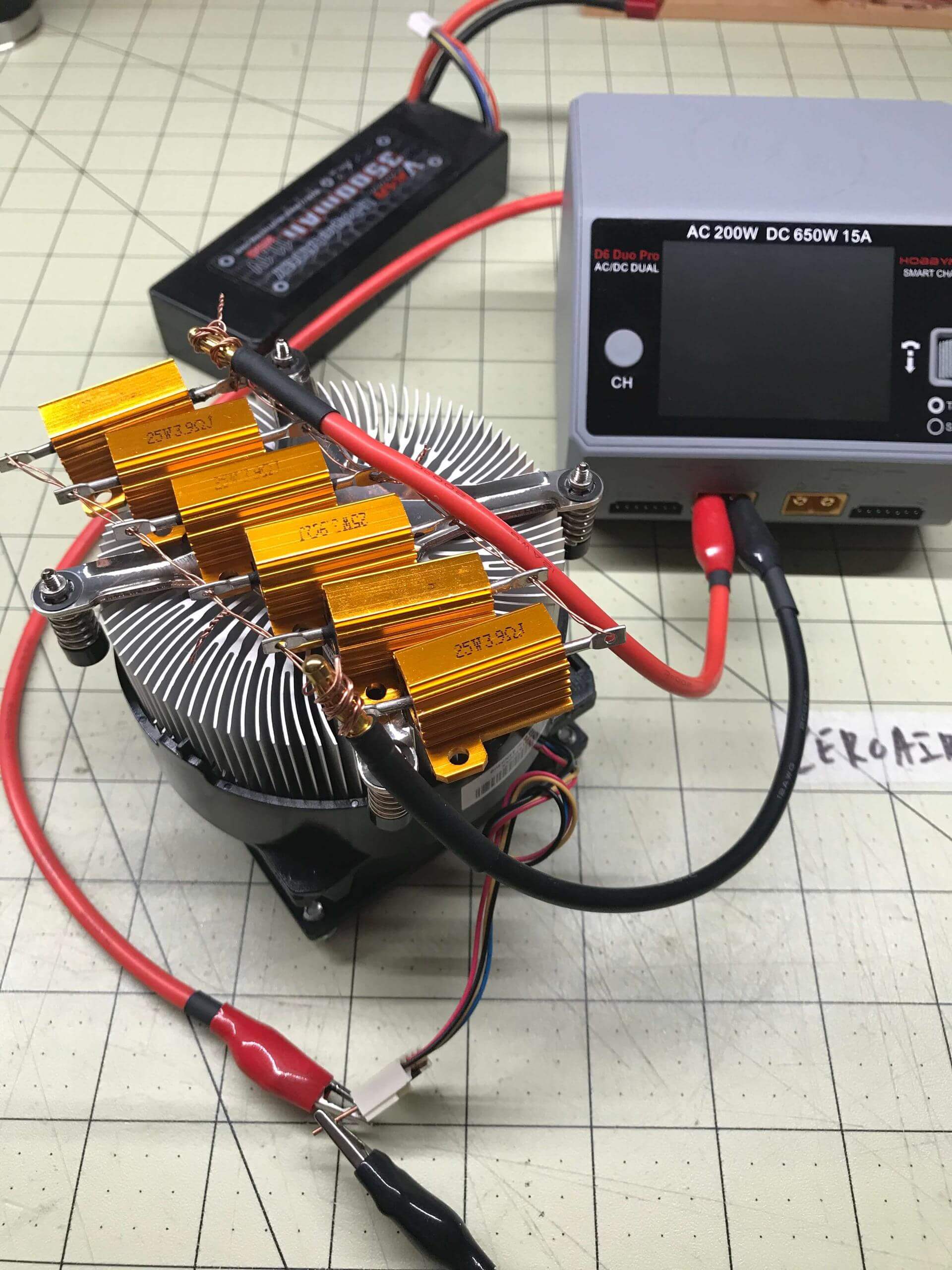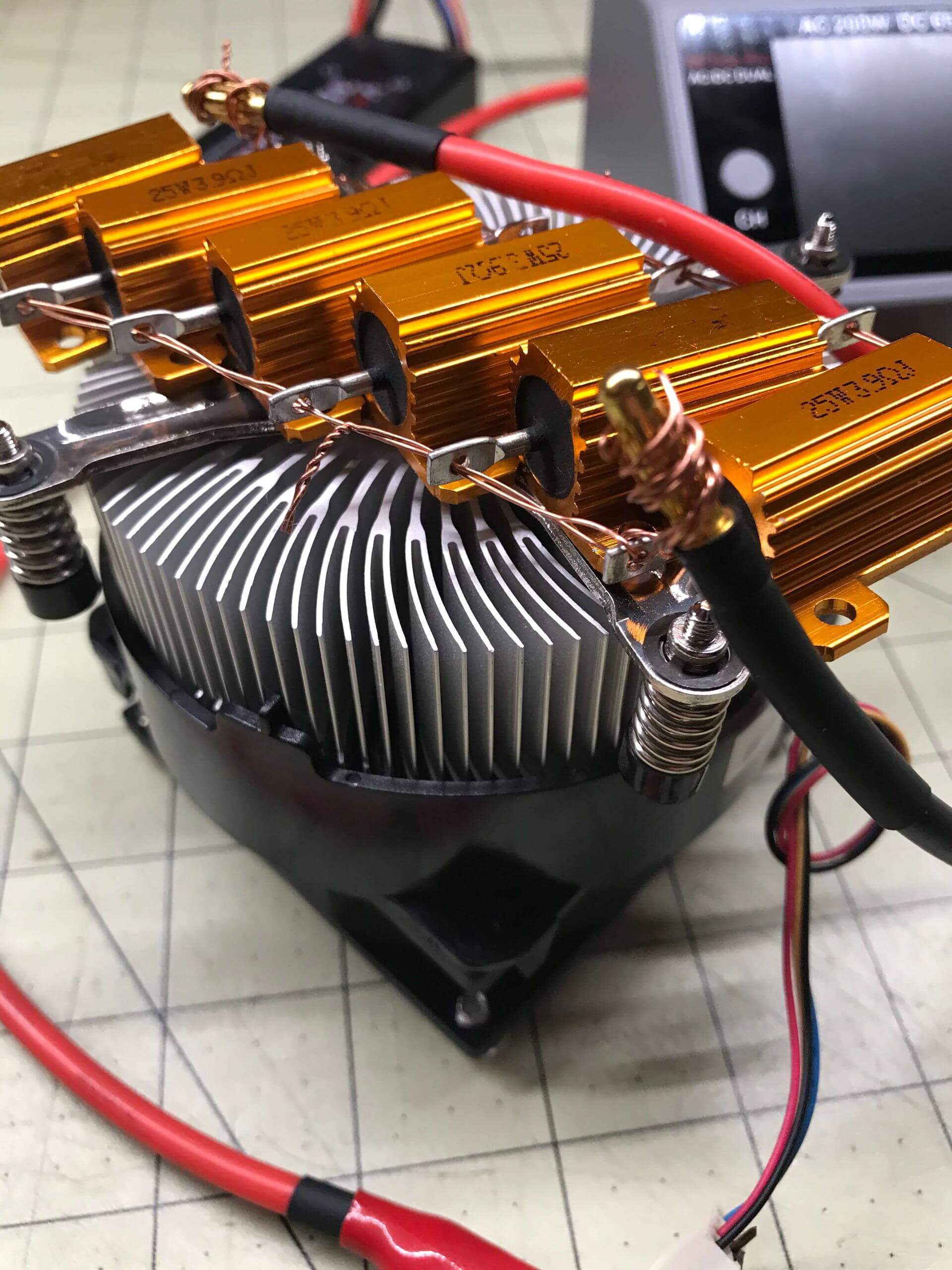 So I managed the heat in this way. Just a random CPU cooler, with the fan running and the resistors resting against the aluminum. It didn’t work that well, but it allowed longer testing.