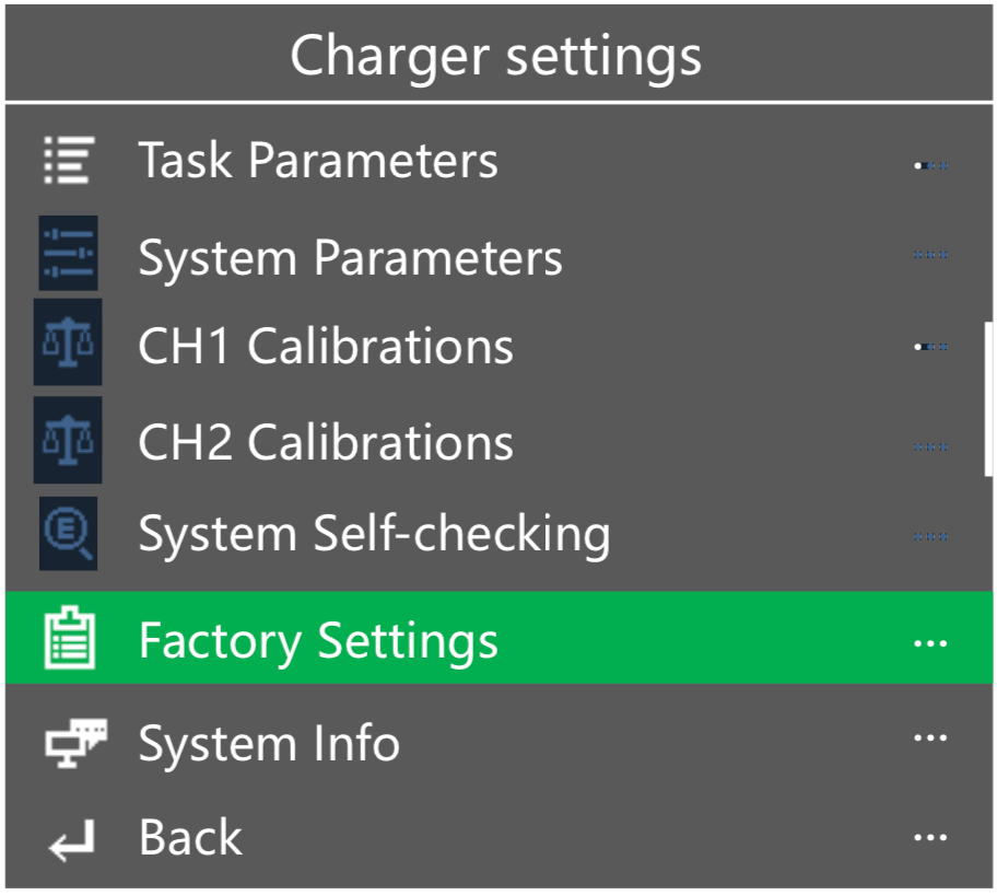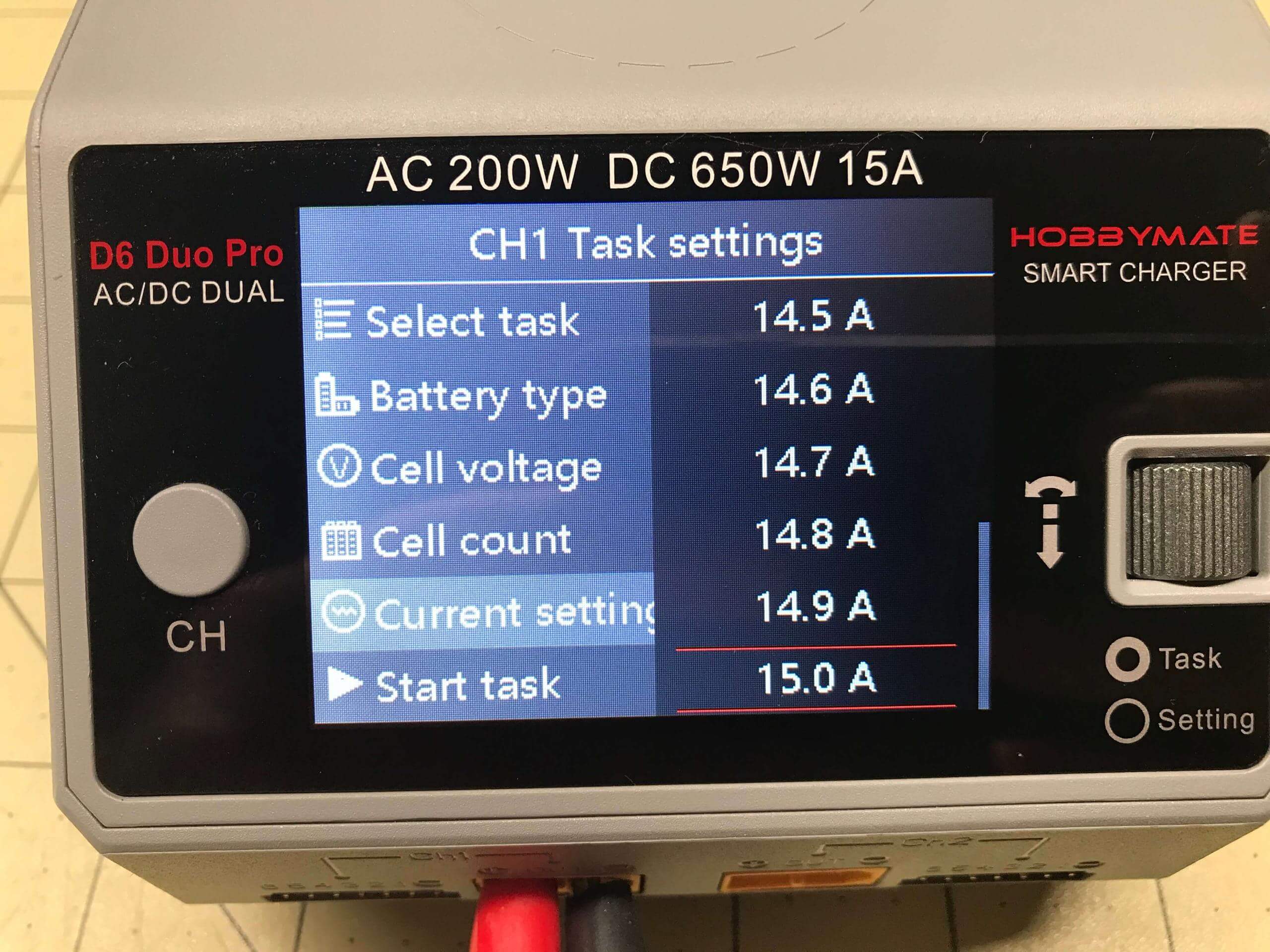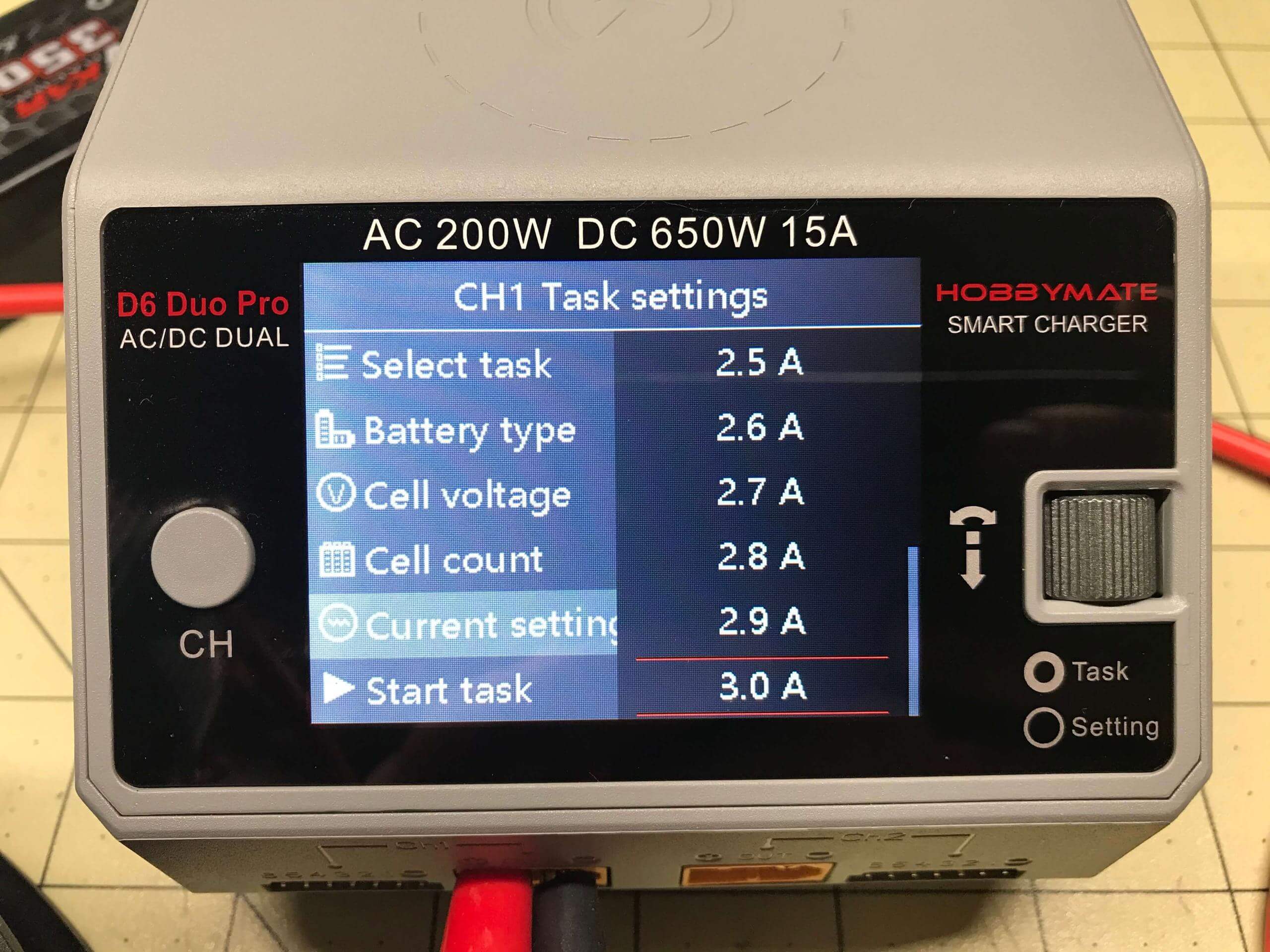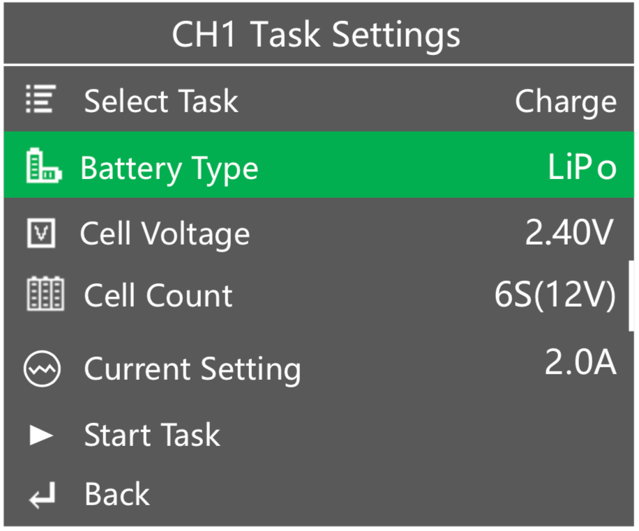 There are probably a hundred thousand processes I could show regarding the UI. But here’s a fairly simple, and probably very common setup. I installed two battery packs. A 2S pack in Channel 1, and a 3S pack in Channel 2. The channels correspond to the screens – the left plugs occupy the left side of the screen, and the right plugs occupy the right side of the screen (and of course, they’re all properly labeled too). Click the CH button to select a channel – the channel must be in the full screen, not split-screen. If the screen is split, changes can not be made.