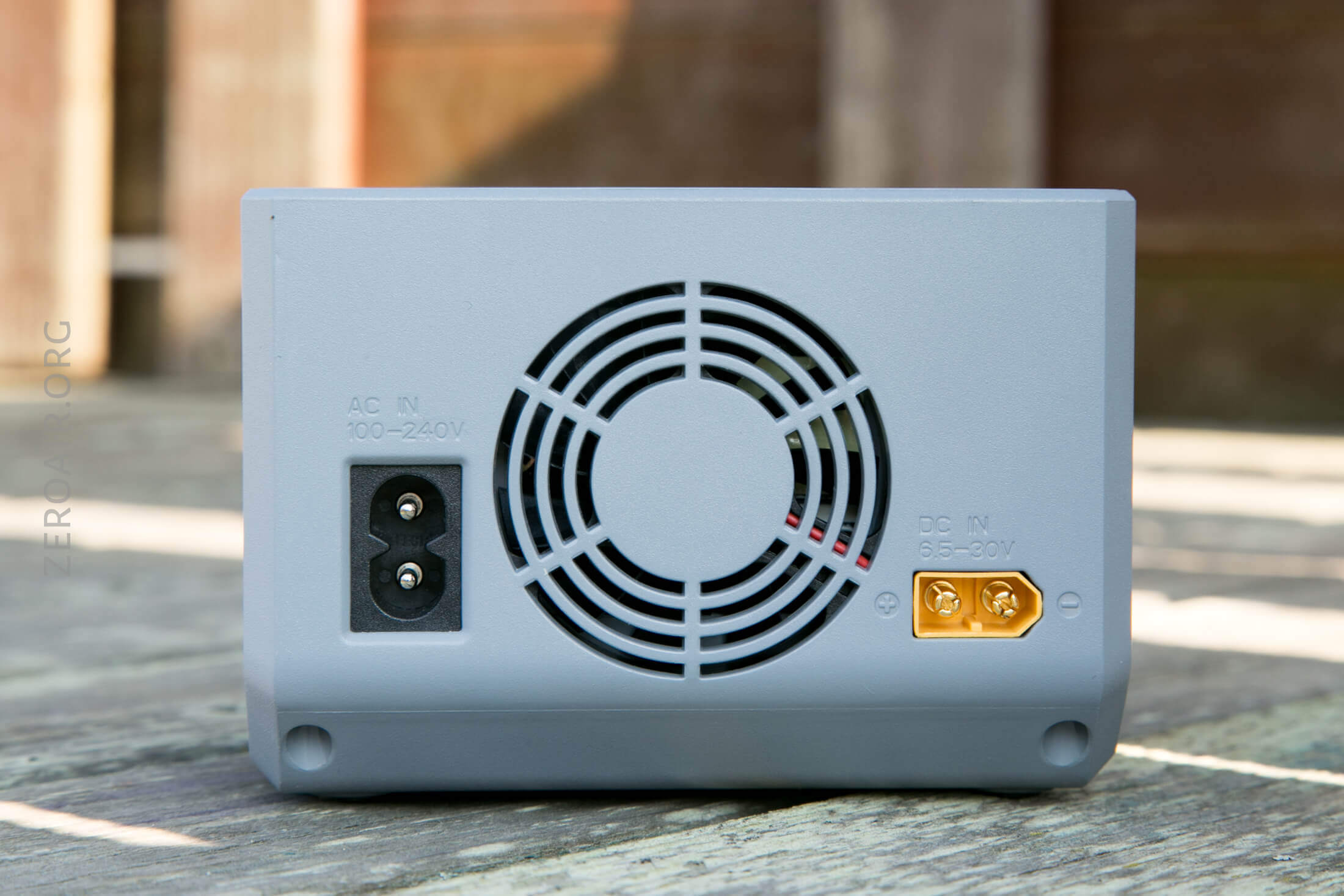 The back has a fairly large fan and also two inputs. On the left is the AC input (again, non-polar). On the right is a polarized DC input. The plug itself is a male XT60 connector. More on that later.