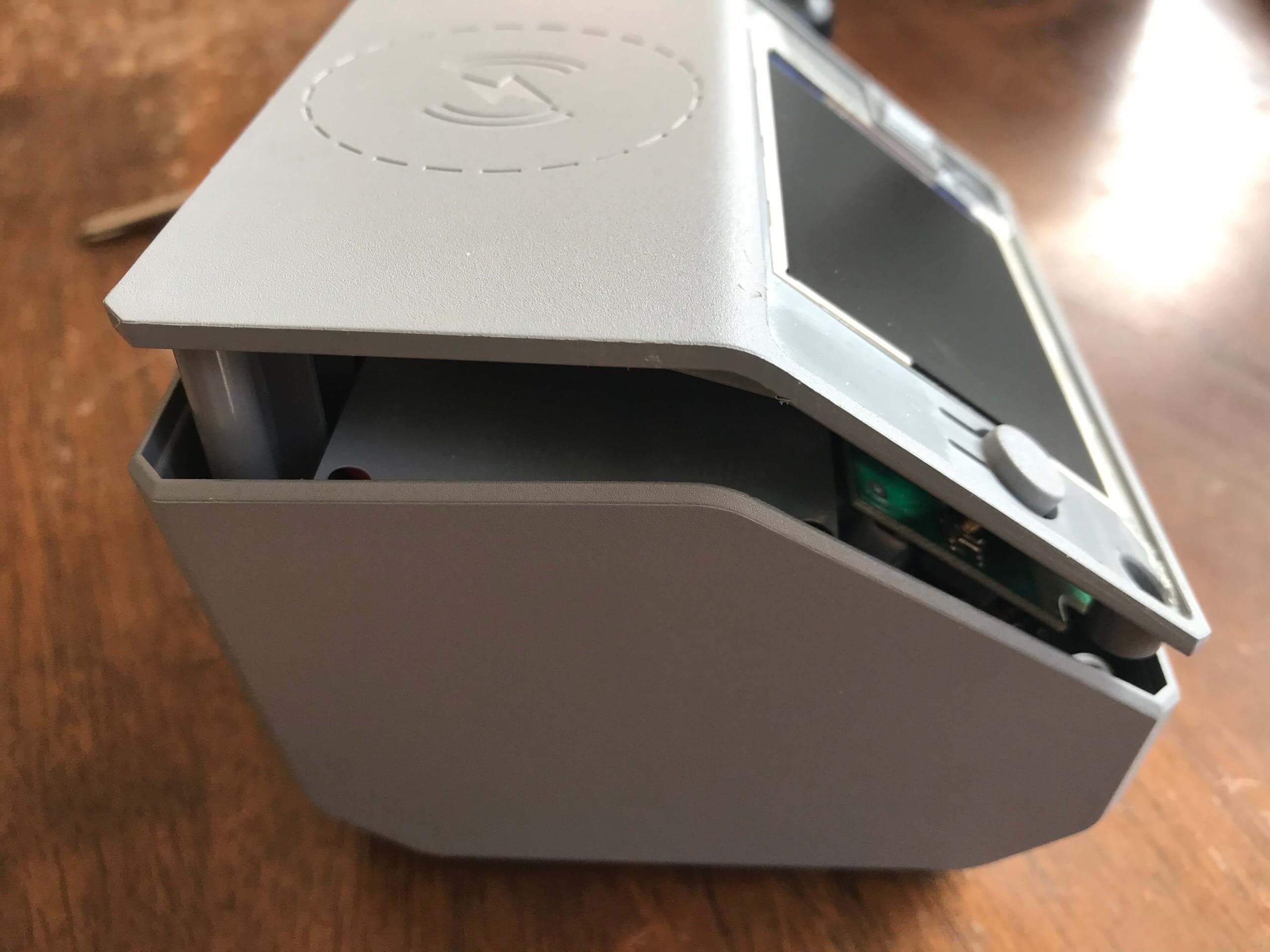 I did a bit of disassembly. There are two screws on the bottom easily accessible. There are two more screws under the screen on the front. So remove that screen as shown below, and drop out those two screws.