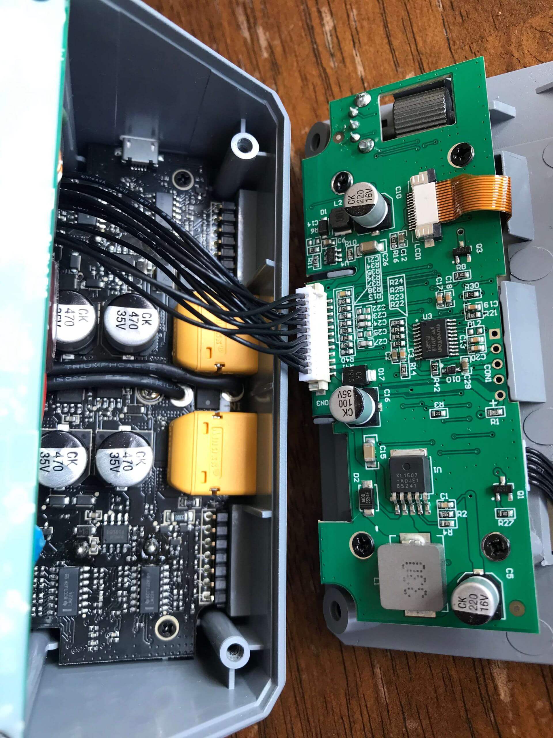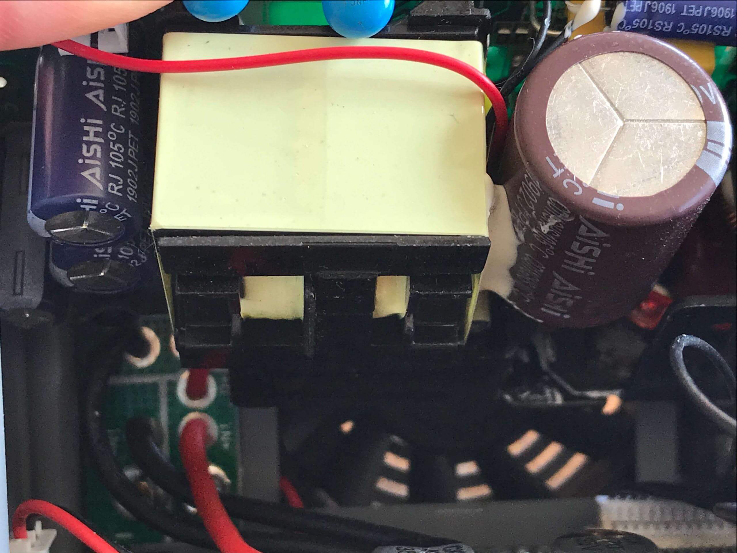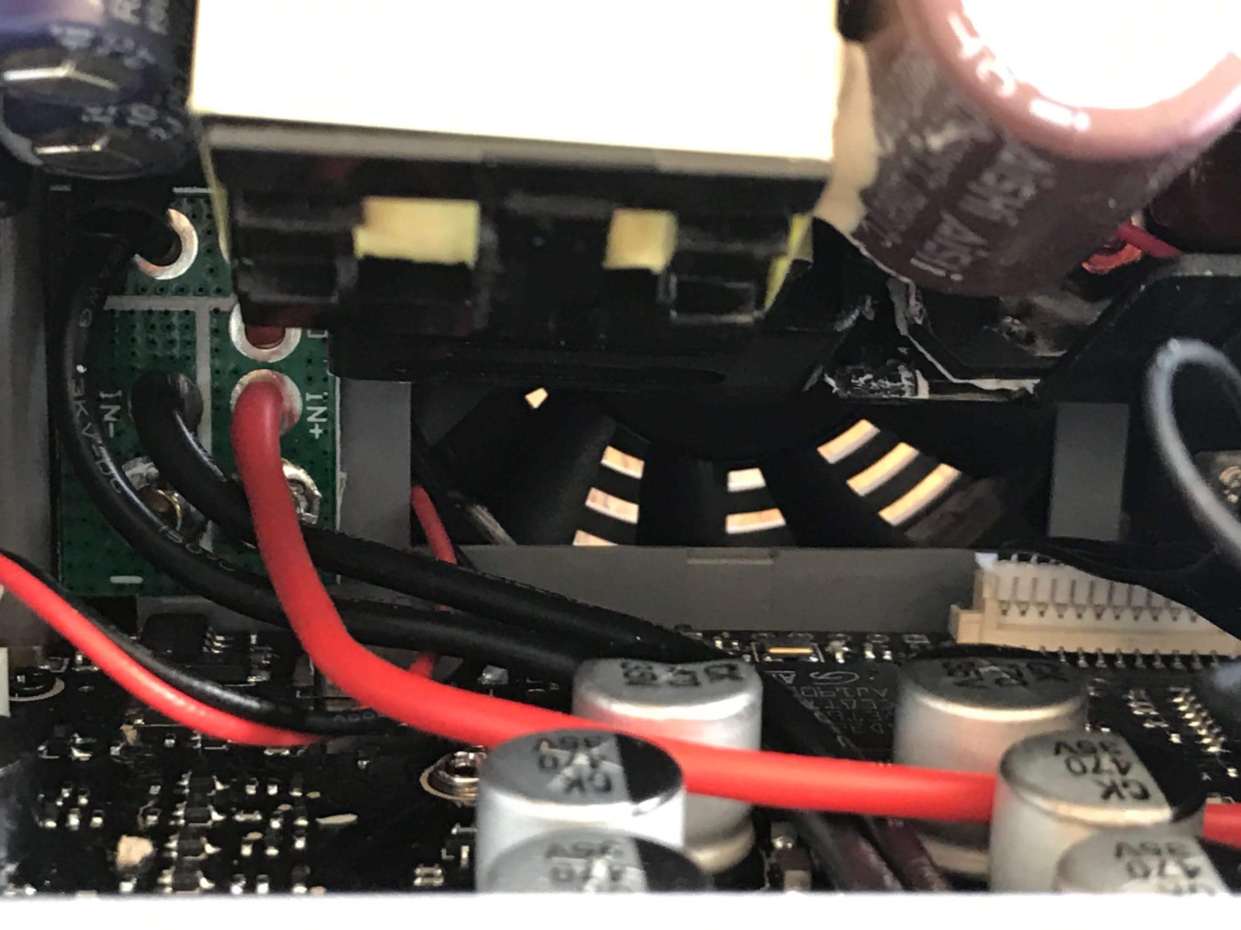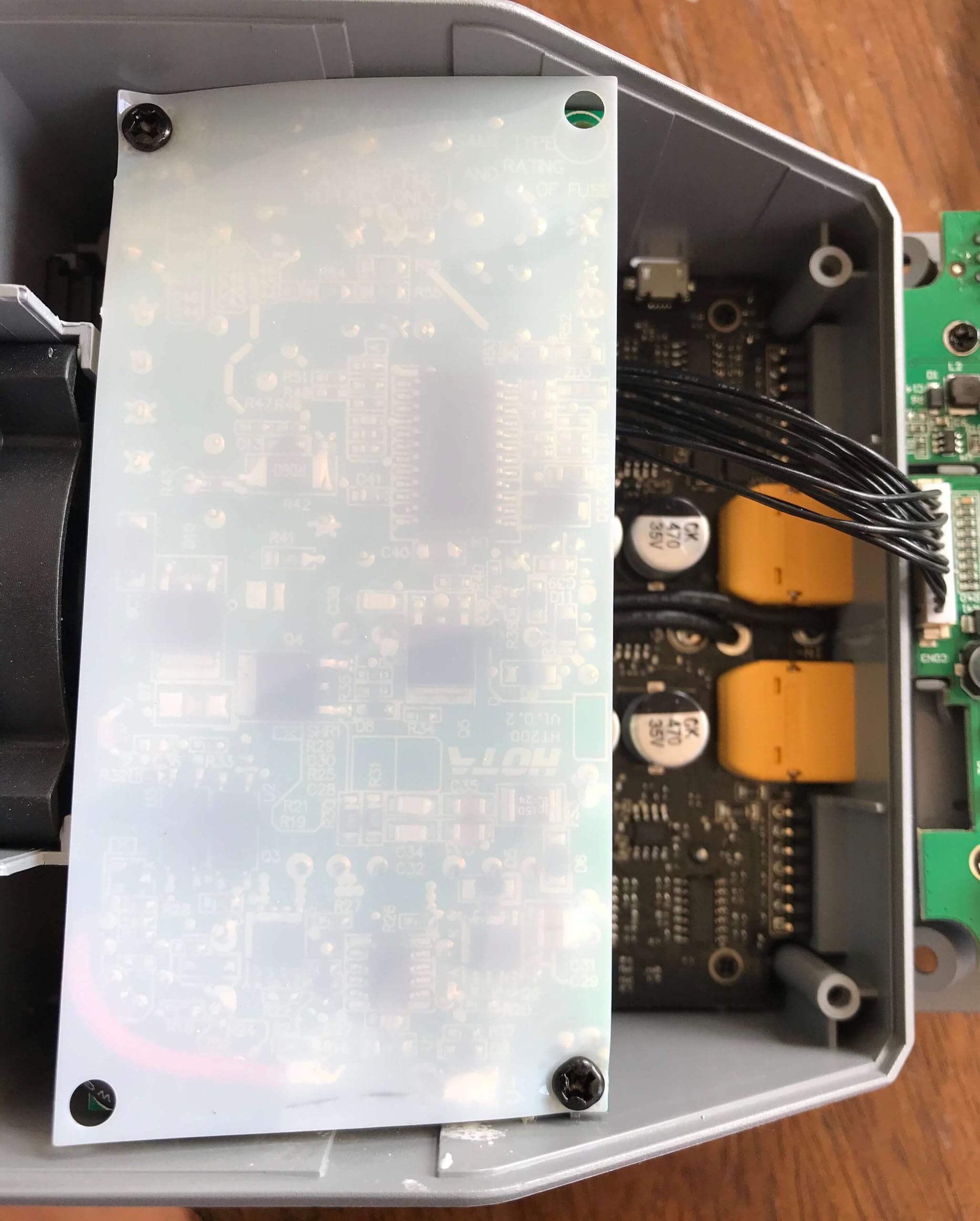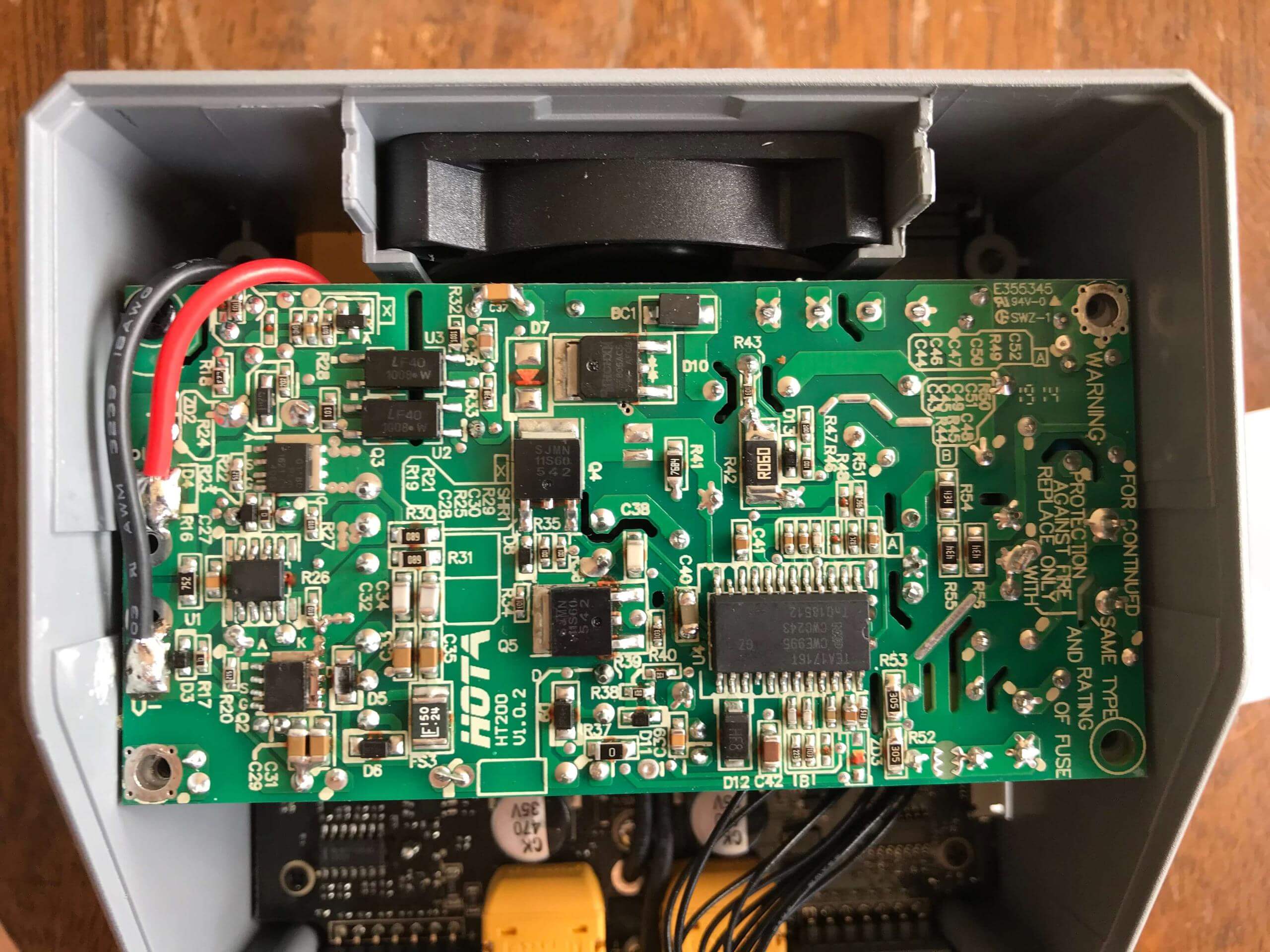 In the back, you can see the fan. It’s a standard-sized fan, but I failed to measure it while I was inside there. It’s 1cm thick, and probably 6mm wide. It’s a bit loud, and I’d recommend replacing it if you want a quieter experience – you’ll need to take the charger apart almost entirely to get to this fan, though. Noctua makes some fans that should fit.