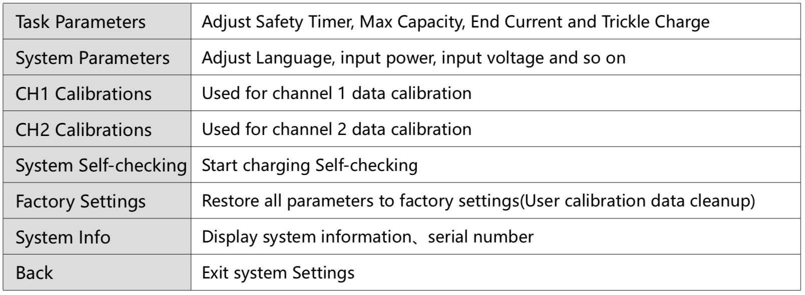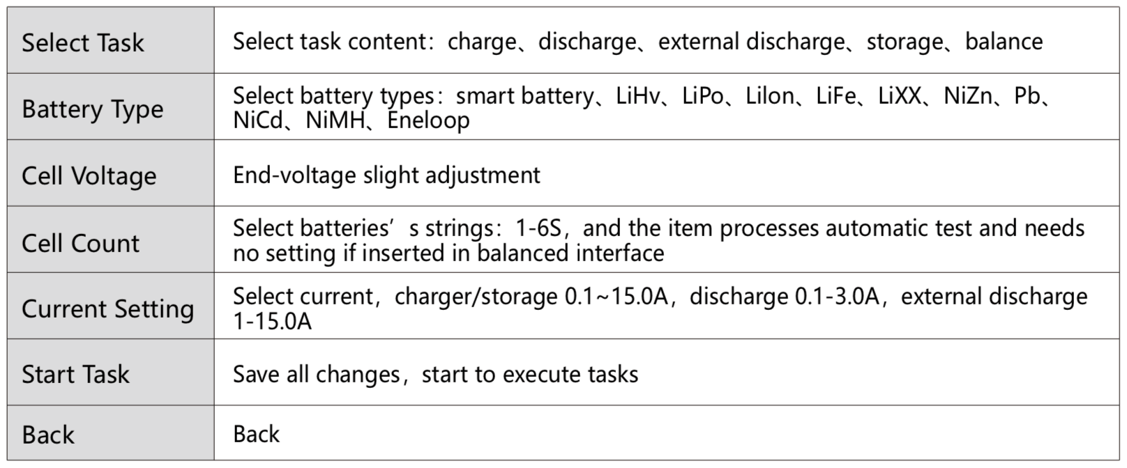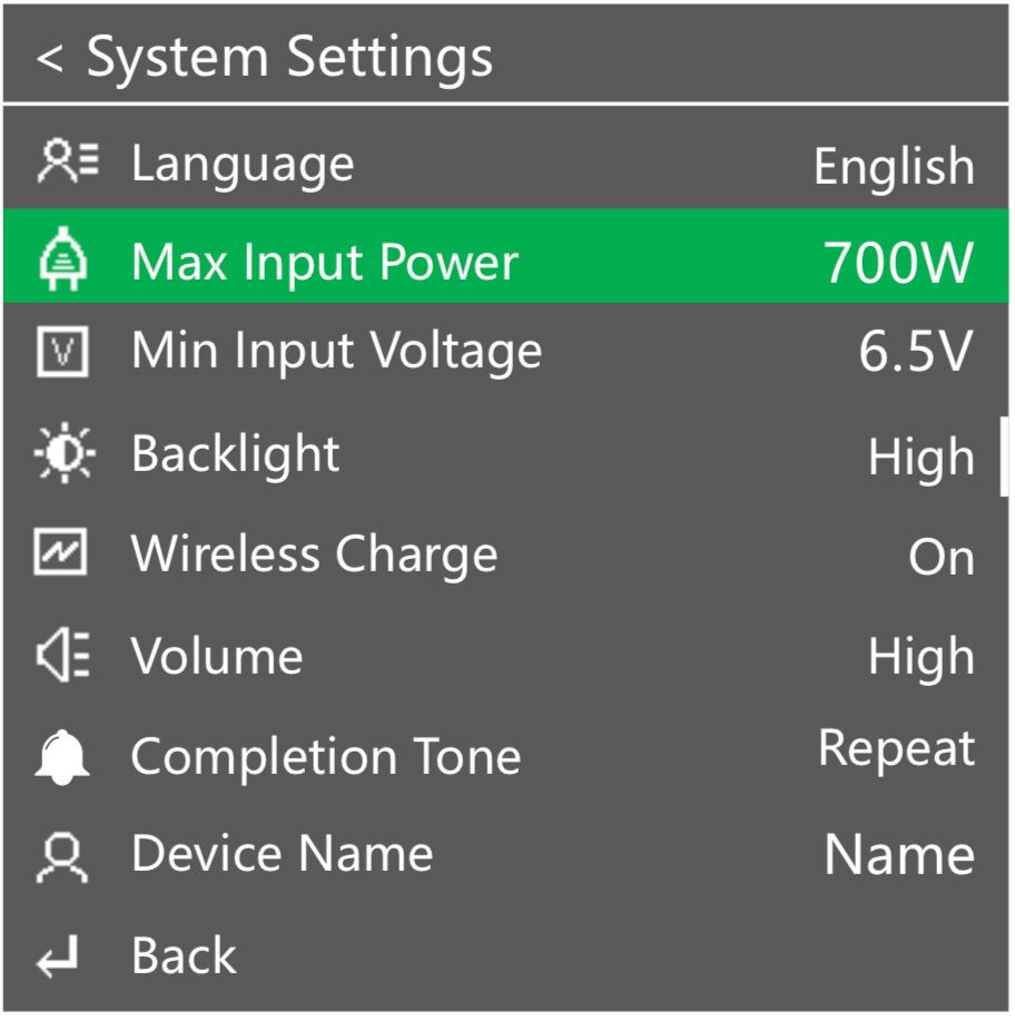 There are a number of sub-menus too. For example, you can manually select what cell voltage to discharge to: