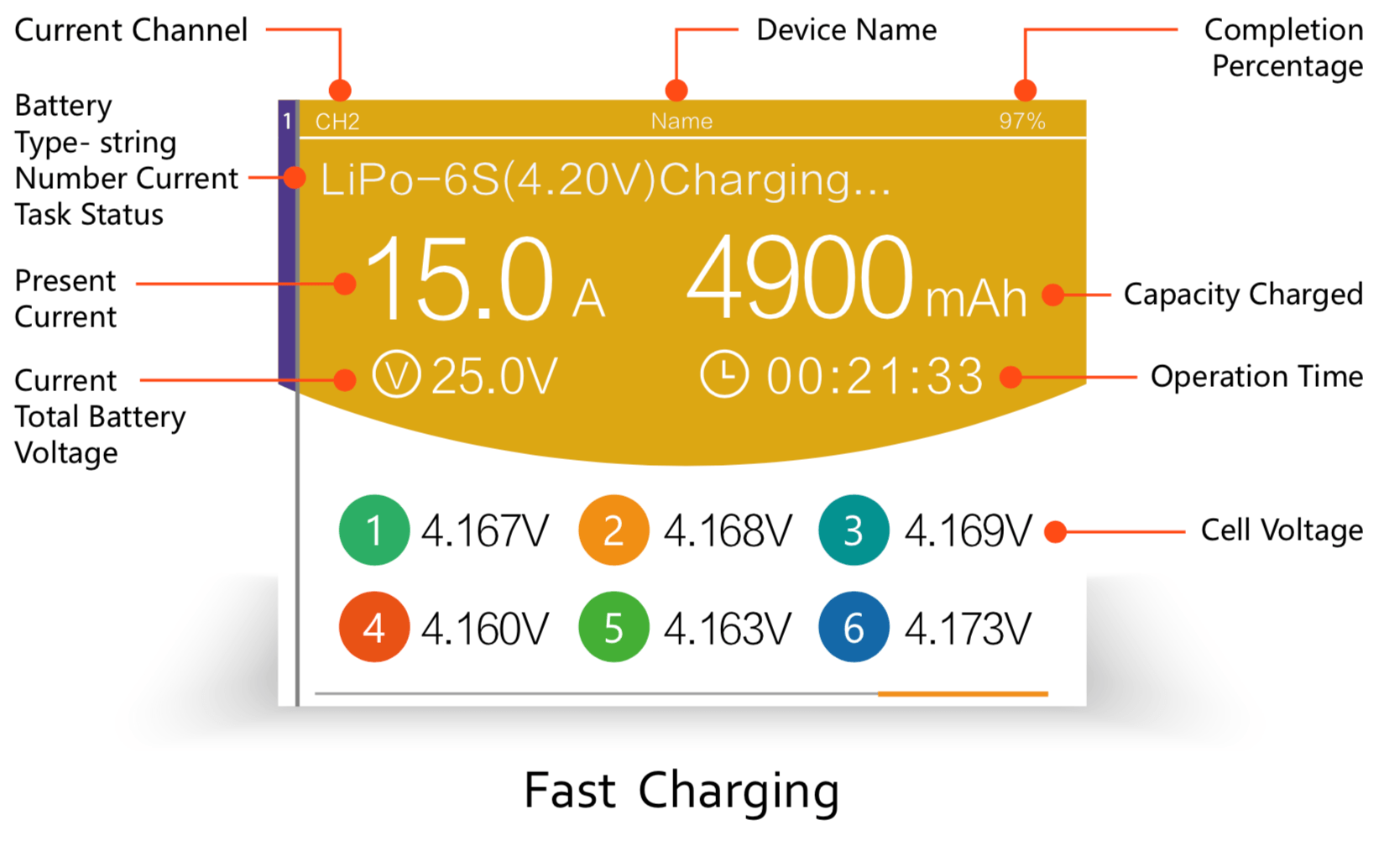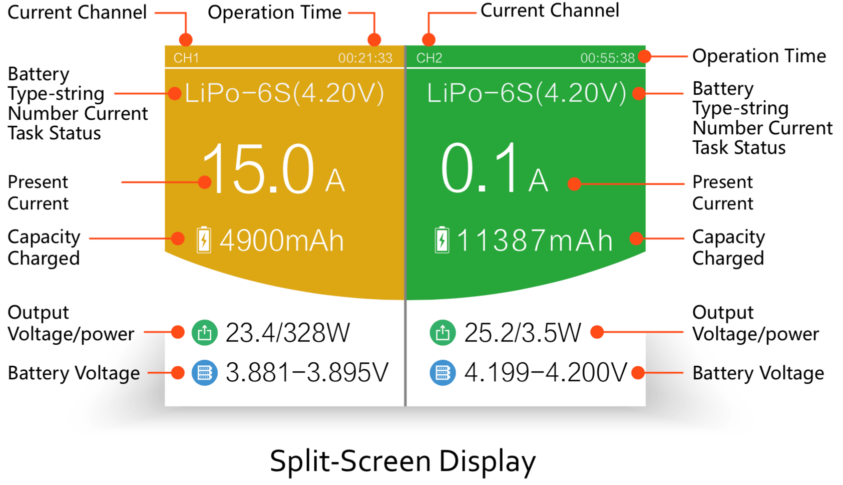 The screen has different colors based on what’s going on. A yellow background means a channel is charging. Below, both channels are charging: