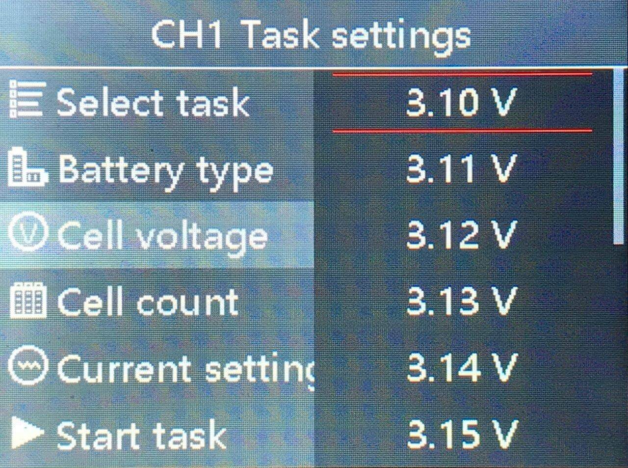 That’s the lowest you can go, too: 3.10V. Maybe a little high, but it’ll do. Past 3.10V, there’s not much energy left in a cell anyway. If you scroll up to “3.20V,” you’ll see a little “thumbs up” – apparently, 3.2V is the optimal voltage, according to Hobbymate.