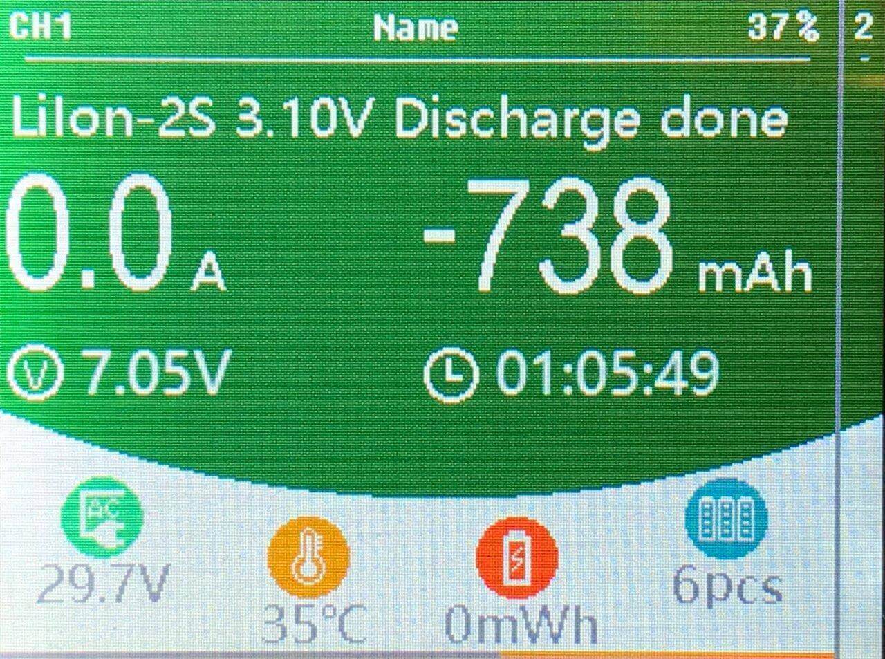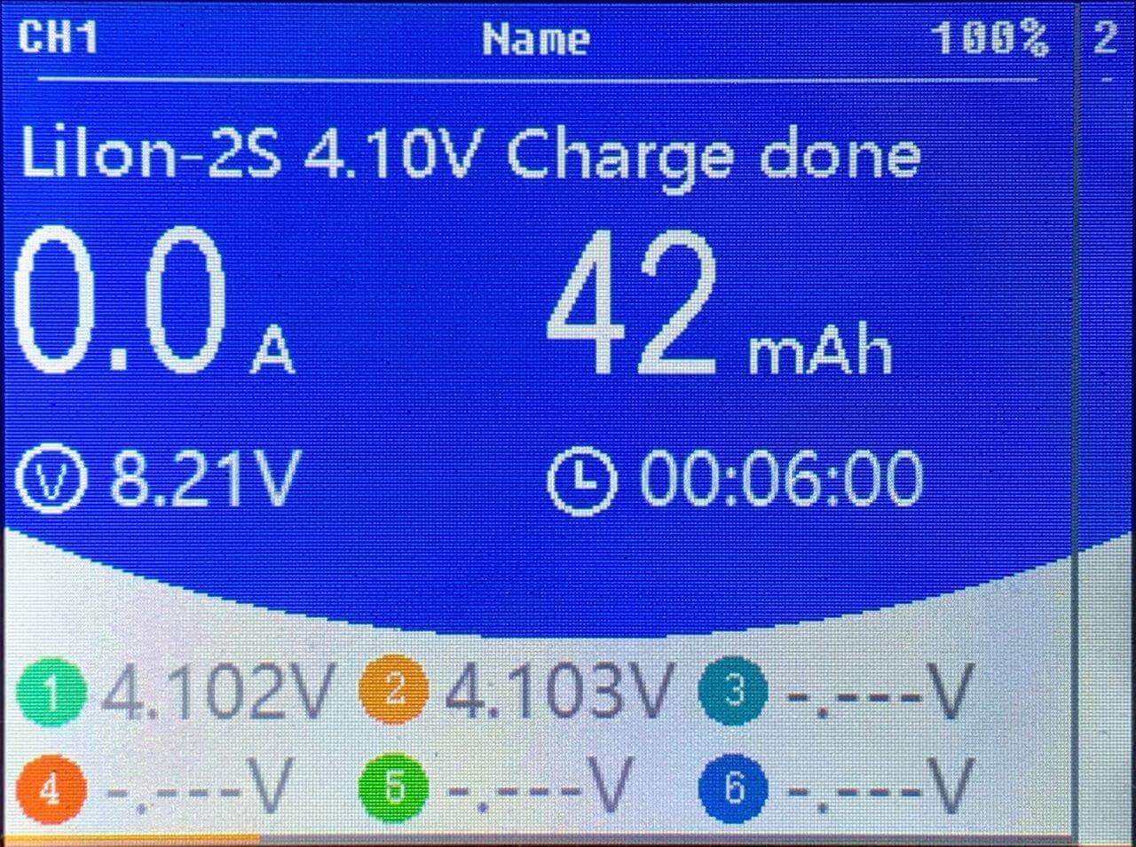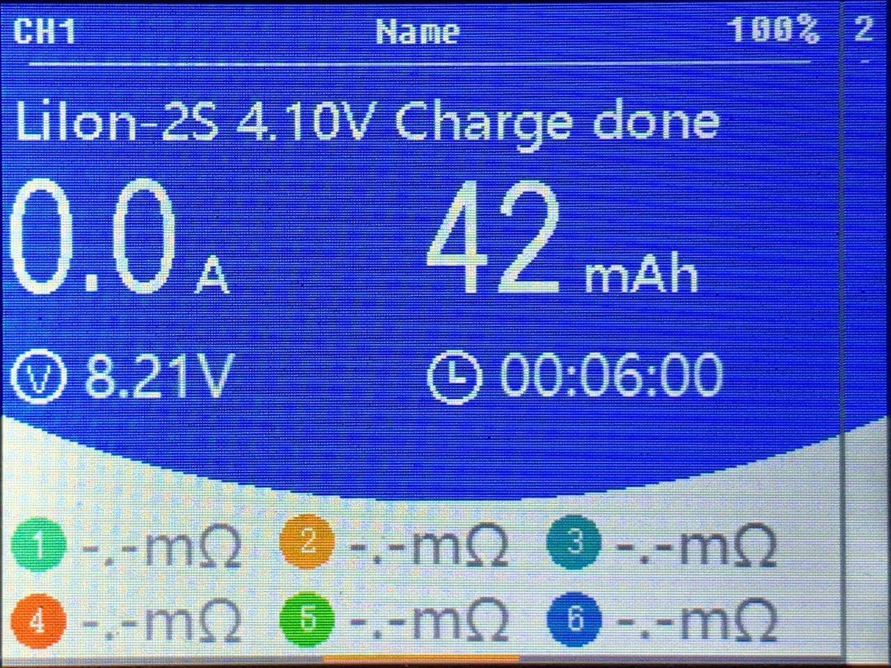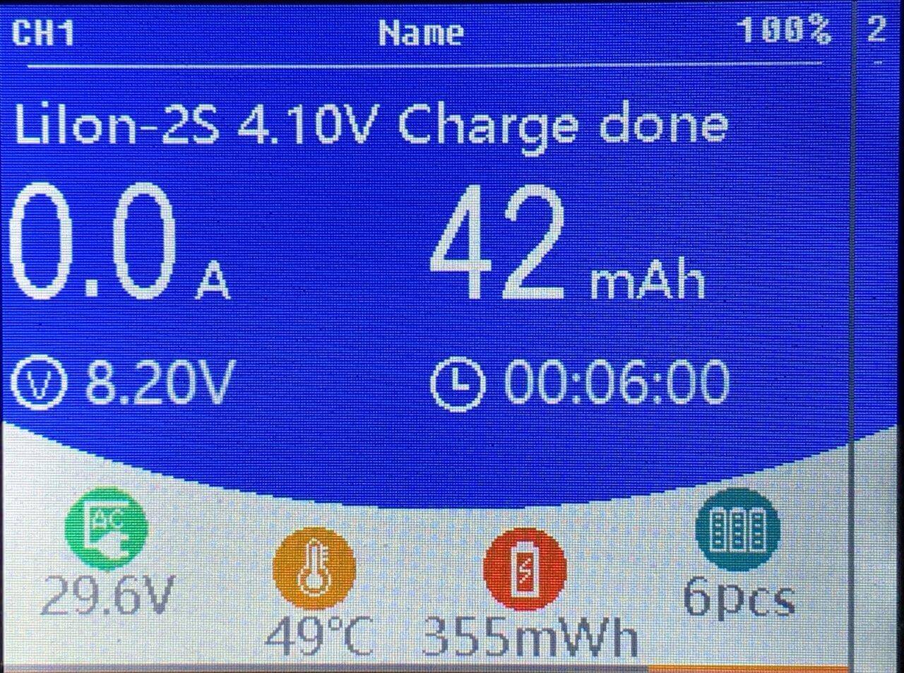 More information can be gained after a cycle is done, and a single channel is selected. The main screen (the blue part) shows the current (in this case, 0.0A). It shows how much energy has been put into the pack (in this case, 42mAh). It shows the voltage of the pack (in this case, 8.21V). And it shows finally how long the pack was charging (in this case, 6 minutes).
