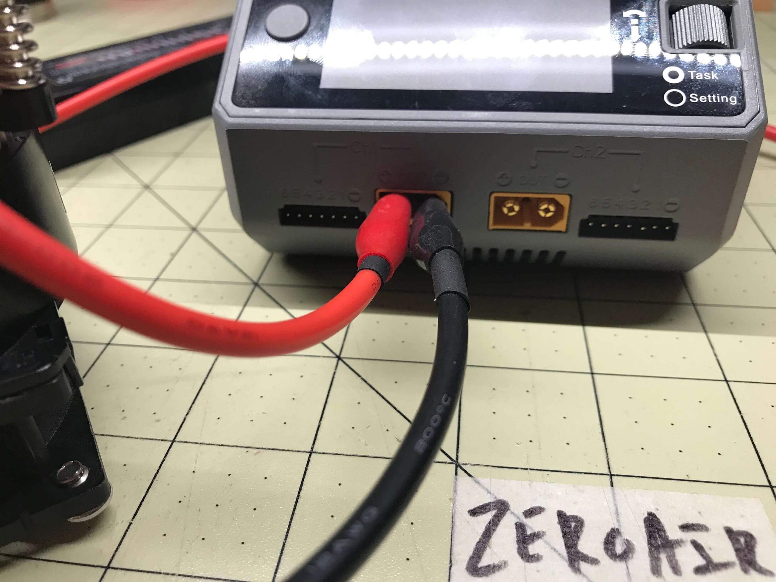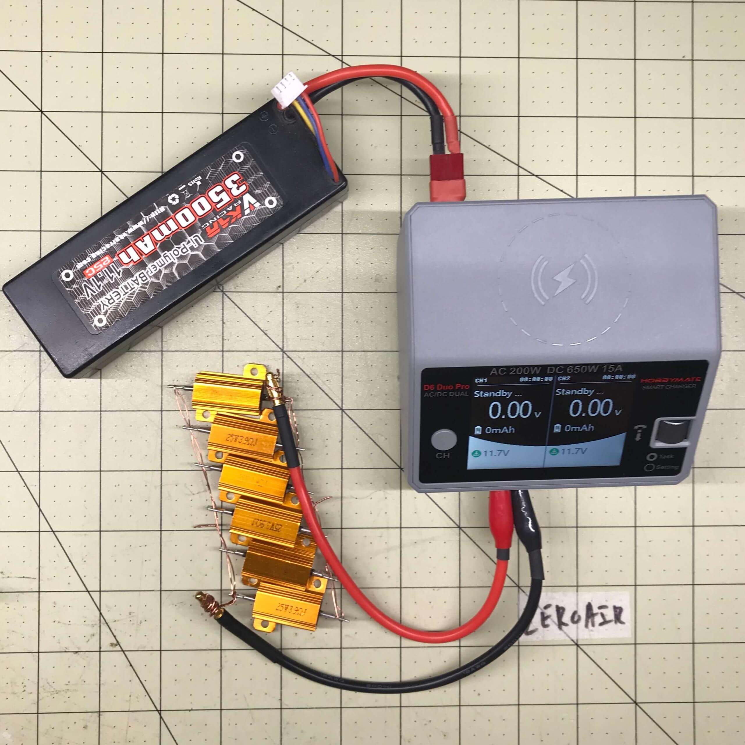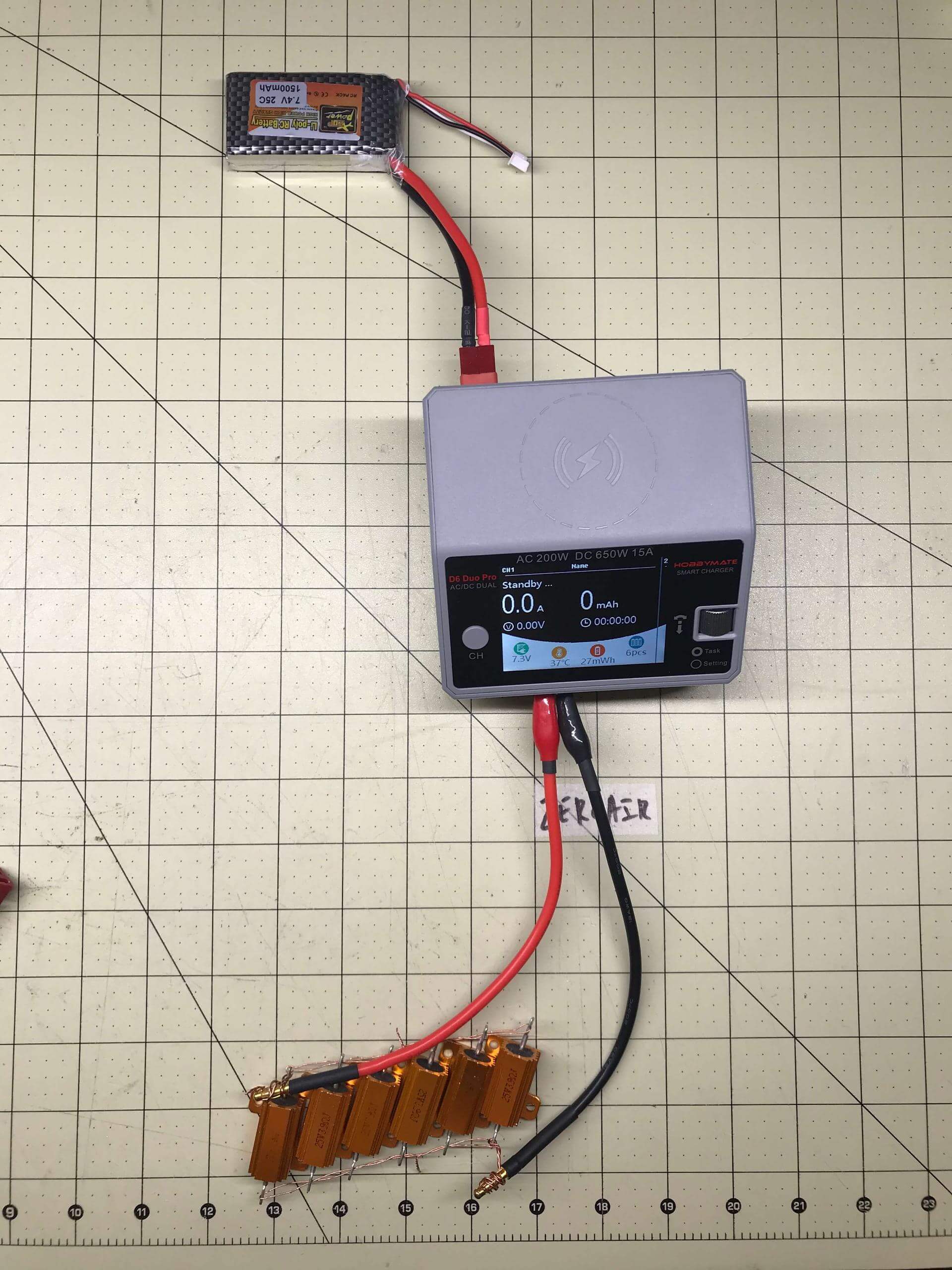So you need anything resistive connected to the positive and negative poles on Channel 1. The setup above is very hacked together – proof of concept only. I have 6x25W 3.9Ω resistors in parallel connected to Channel 1 with just alligator clips. Hobbymate recommends resistors in the 1.5Ω-2.5Ω range. Again, my setup is strictly proof of concept.