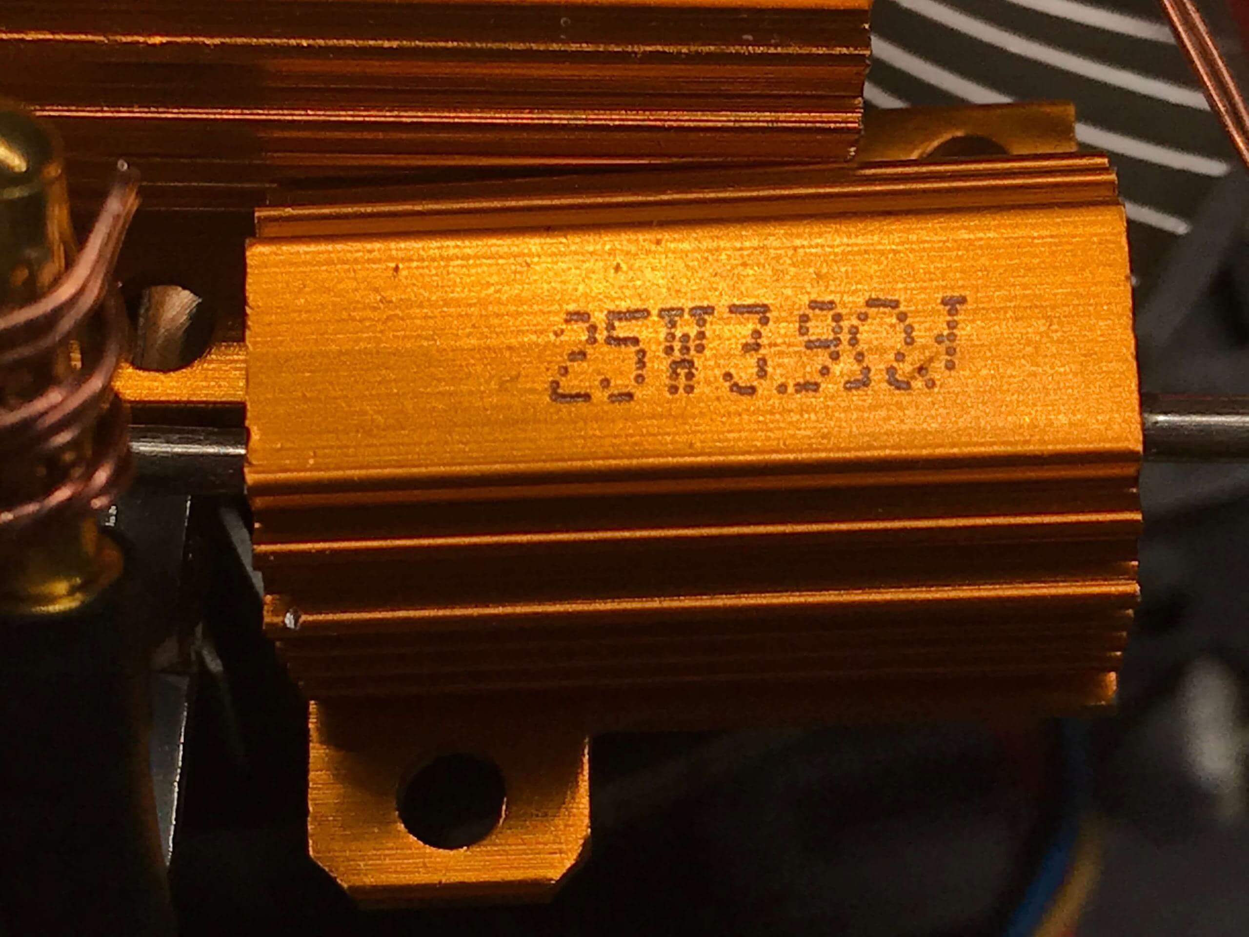 I’m also not using these resistors in their specification. To be capable at 25W, they’d need to be mounted on some sheet metal. So I can’t expect them to take 25W for long. Discharging pretty much any power into these will see them heat up very quickly. And here’s the exact resistor:
