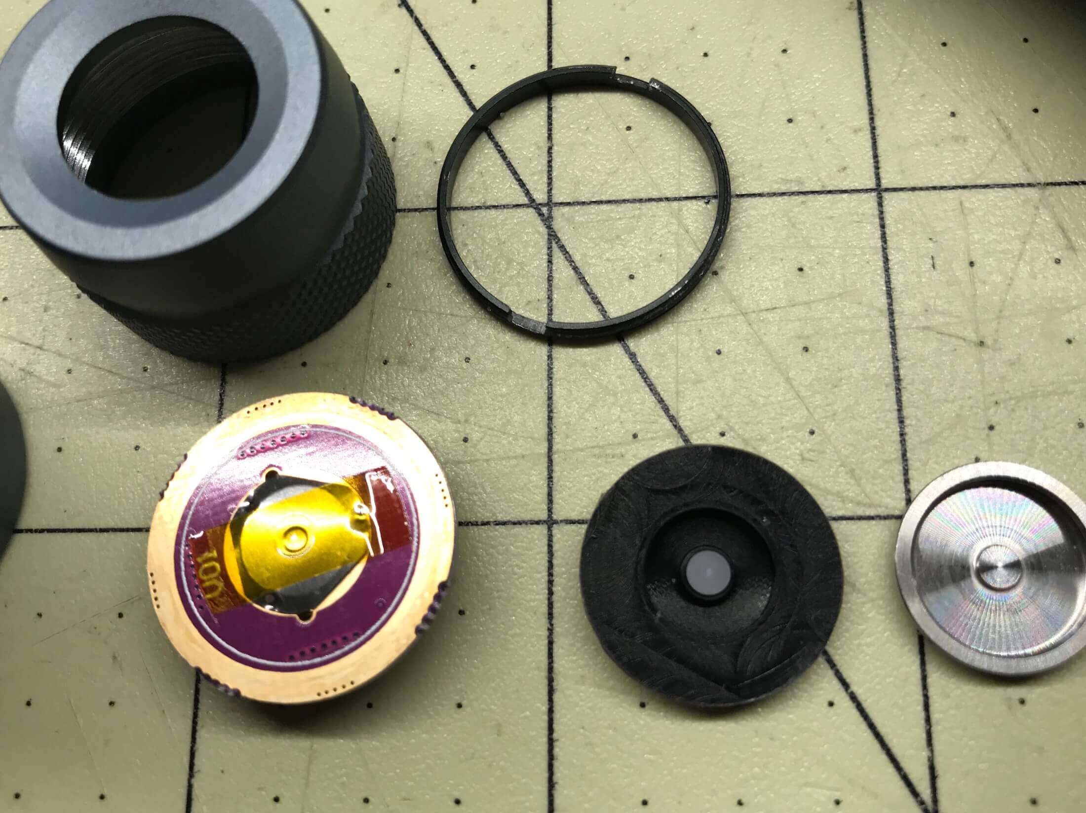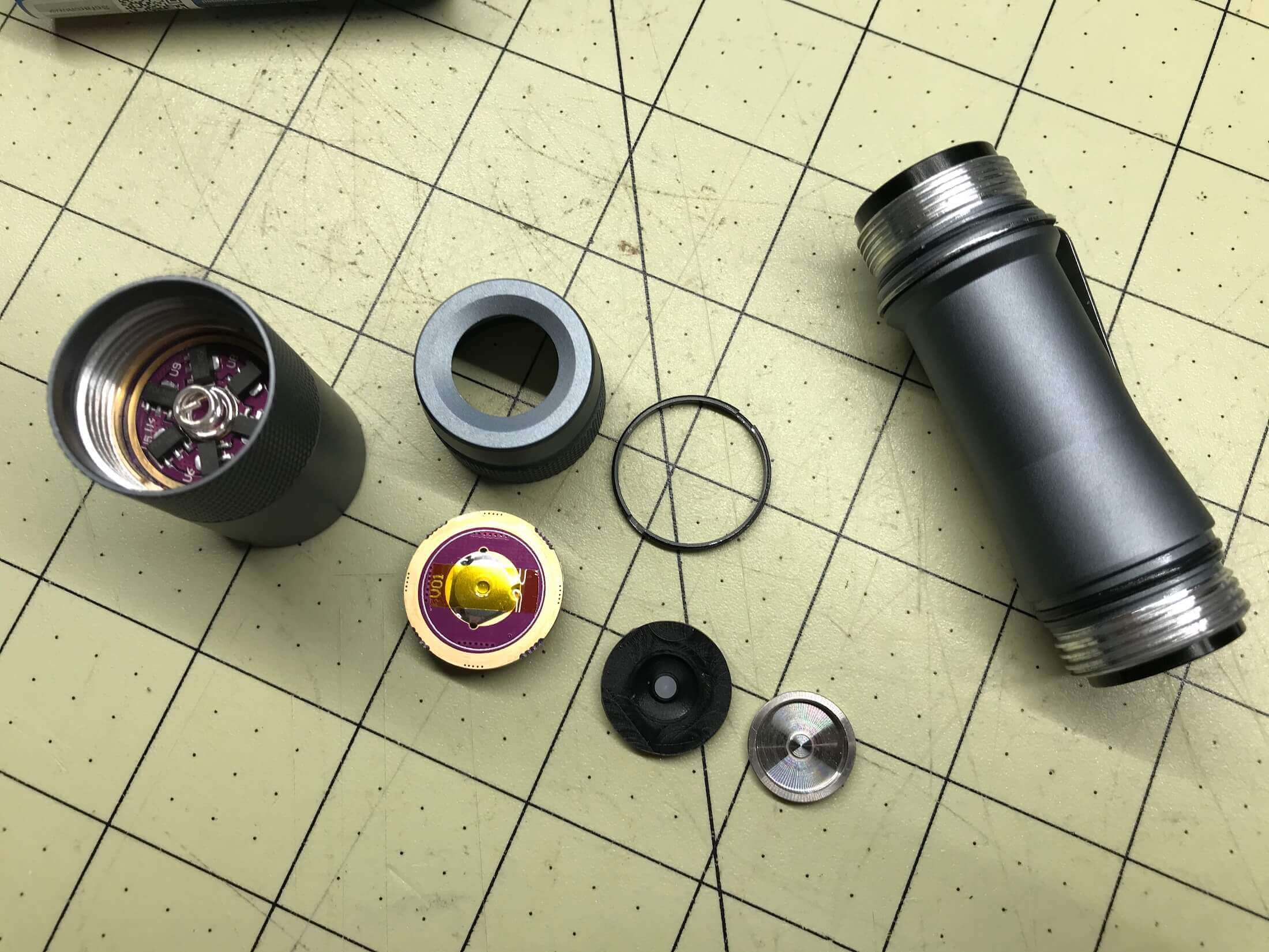 Here’s the tailcap disassembled. The threaded ring is directional, but you’ll find that obvious if you disassemble.