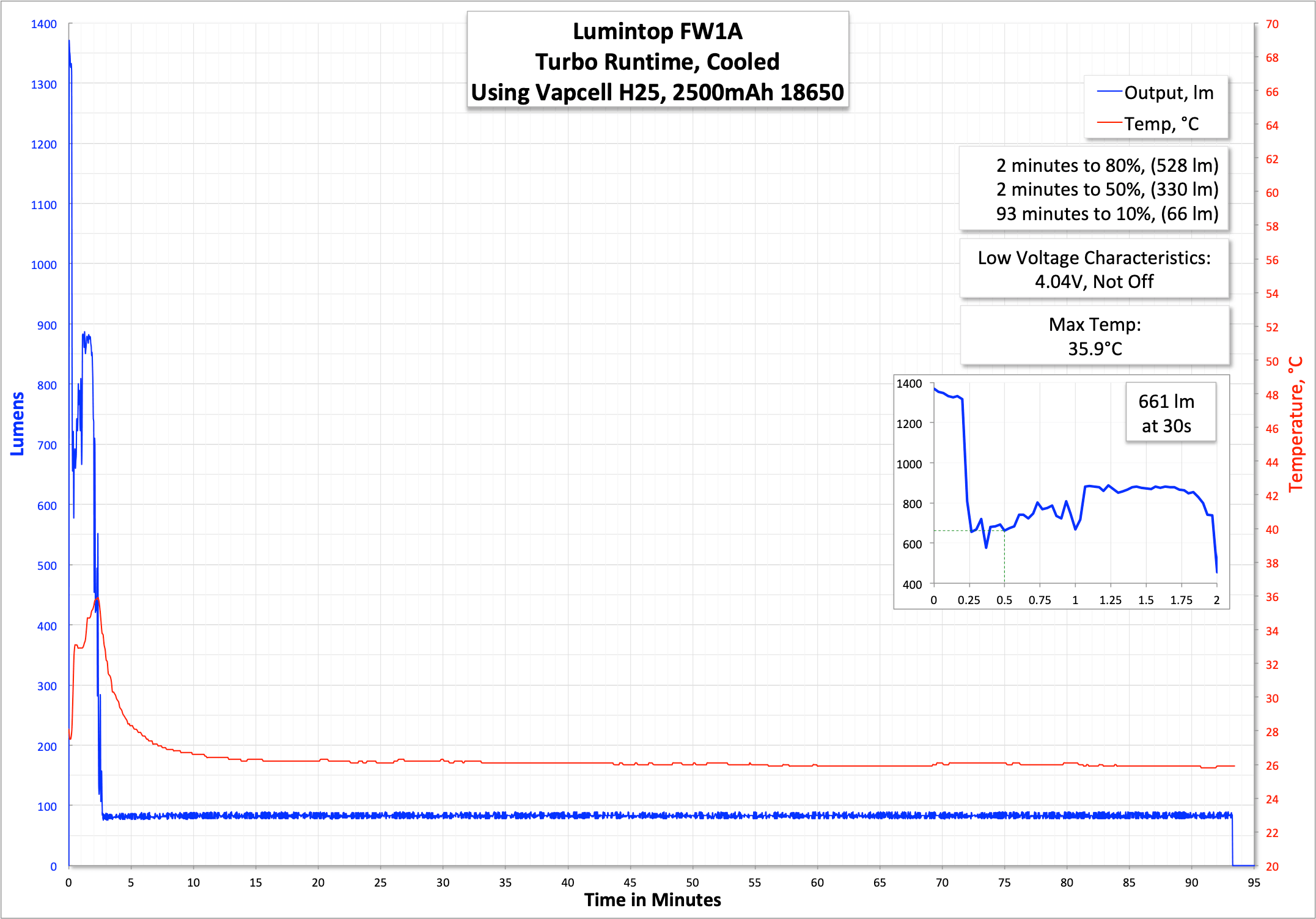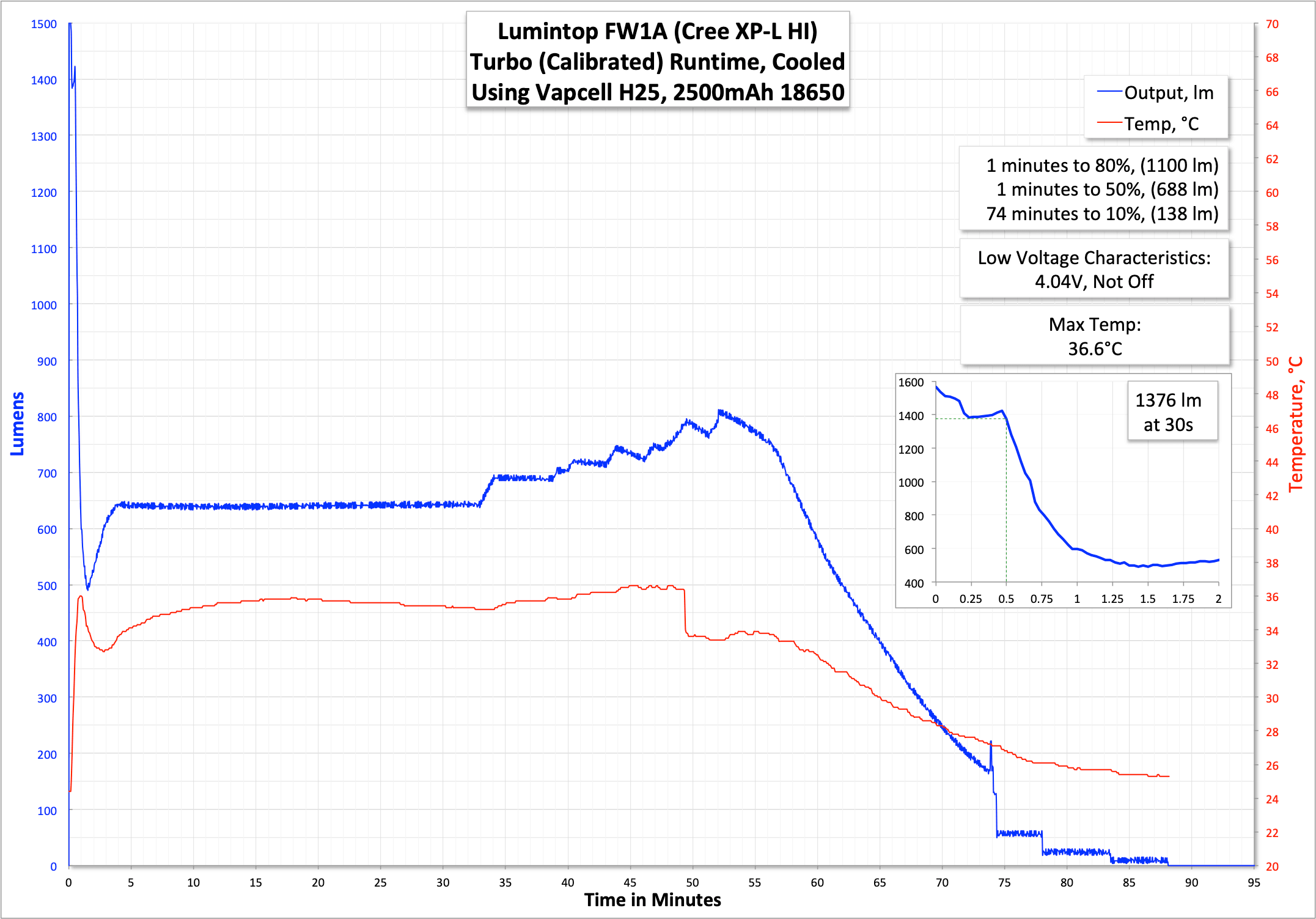 ^ Measurement disclaimer: Testing flashlights is my hobby. I use hobbyist-level equipment for testing, including some I made myself. Try not to get buried in the details of manufacturer specifications versus measurements recorded here; A certain amount of difference (say, 10 or 15%) is perfectly reasonable. These measurements are at 30 seconds. It’s likely the ratings are at startup.