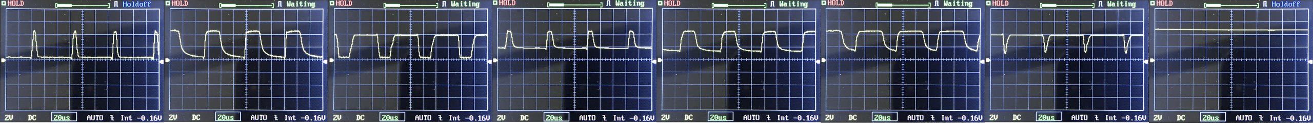 Then there’s the Ultrafire WF-602C flashlight, which has some of the worst PWM I’ve seen. It’s so bad that I used a post about it to explain PWM! Here are multiple timescales (10ms, 5ms, 2ms, 1ms, 0.5ms, 0.2ms) to make comparing this “worst” PWM light to the test light easier. That post also explains why I didn’t test the WF-602C at the usual 50us scale.
